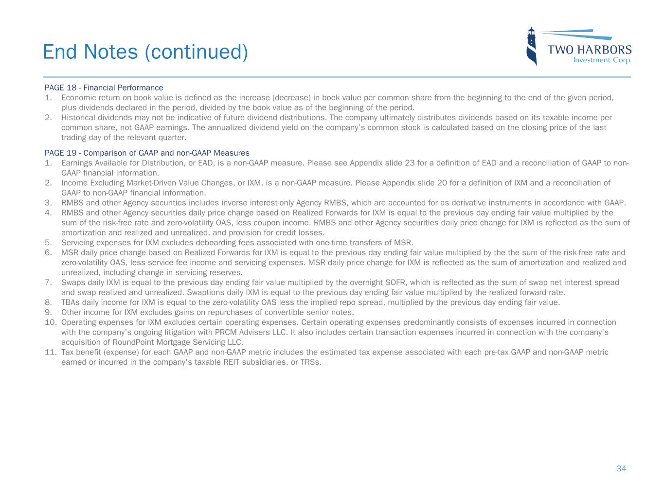 End Notes (continued) PAGE 20 - GAAP to IXM Reconciliation 1. The market-driven value changes adjustment for each of RMBS and other Agency securities, MSR, swap and swaptions and TBA represents unexpected price changes for the referenced period. As defined, the calculation of IXM includes modeled price changes that are measured daily based on a “Realized Forwards” methodology, which includes the assumption that spreads, forward interest rates, shape of the term structure and volatility factored into the previous day ending fair value are unchanged. Unexpected price changes represent the differences between (a) actual spreads, forward interest rates, shape of the term structure and volatility, and (b) the spreads, forward interest rates, shape of the term structure and volatility that were factored into the previous day ending fair value. Unexpected price changes are measured daily and used to determine the portion of actual market price changes not attributable to modeled price changes. The reported market-driven value changes adjustment for each of RMBS and other Agency securities, MSR, swap and swaptions and TBA is the sum of all daily unexpected price changes for the referenced period. Please refer to end notes (2) through (5) for this slide for further information. 2. RMBS and other Agency securities market-driven value changes refers to the sum of interest income, realized and unrealized gains and losses on RMBS and other Agency securities, less the sum of the realization of RMBS and other Agency securities cash flows which incorporates actual prepayments, changes in RMBS and other Agency securities accrued interest, and modeled price changes. Modeled price changes are measured daily based on a “Realized Forwards” methodology, which includes the assumption that spreads, forward interest rates, shape of the term structure and volatility factored into the previous day ending fair value are unchanged. RMBS and other Agency securities includes inverse interest-only Agency RMBS which are accounted for as derivative instruments in accordance with GAAP. 3. MSR market-driven value changes refers to the sum of servicing income, servicing expenses, realized and unrealized gains and losses on MSR, less the sum of the realization of MSR cash flows which incorporates actual prepayments, servicing income and servicing expenses, and modeled price changes. Modeled price changes are measured daily based on a “Realized Forwards” methodology, which includes the assumption that spreads, forward interest rates, shape of the term structure and volatility factored into the previous day ending fair value are unchanged. 4. Swap and swaption market-driven value changes refers to the net interest spread and realized and unrealized gains and losses on interest rate swap and swaption agreements, less the swaps daily IXM that is equal to the previous day ending fair value, multiplied by the overnight SOFR and swaptions daily IXM that is equal to the previous day ending fair value, multiplied by the realized forward rate. 5. TBA market-driven value changes refers to the total realized and unrealized gains and losses, less the daily zero-volatility OAS less the implied repo spread, multiplied by the previous day ending fair value. 6. Certain operating expenses predominantly consists of expenses incurred in connection with the company’s ongoing litigation with PRCM Advisers LLC. It also includes certain transaction expenses incurred in connection with the company’s acquisition of RoundPoint Mortgage Servicing LLC. PAGE 21 - Earnings Available for Distribution 1. MSR amortization refers to the portion of change in fair value of MSR primarily attributed to the realization of expected cash flows (runoff) of the portfolio, which is deemed a non-GAAP measure due to the company’s decision to account for MSR at fair value. 2. TBA dollar roll income is the economic equivalent to holding and financing Agency RMBS using short-term repurchase agreements. 3. U.S. Treasury futures income is the economic equivalent to holding and financing a relevant cheapest-to-deliver U.S. Treasury note or bond using short- term repurchase agreements. 4. Earnings Available for Distribution, or EAD, is a non-GAAP measure. Please see Appendix slide 23 for a definition of EAD and a reconciliation of GAAP to non-GAAP financial information. 5. Certain operating expenses predominantly consists of expenses incurred in connection with the company’s ongoing litigation with PRCM Advisers LLC. It also includes certain transaction expenses incurred in connection with the company’s acquisition of RoundPoint Mortgage Servicing LLC. 6. Agency fixed-rate RMBS use the GAAP concept of amortized cost and yield-to-maturity determined at time of purchase. Net servicing income and MSR amortization is based on original pricing yield and does not include the benefit of increased float income and lower compensating interest. Financing costs are largely variable and short-term, responding more quickly to rising rates than our longer-term assets. U.S. Treasury futures income represents the sum of the implied net cash and expected change in price of a financed U.S. Treasury security, but excludes unexpected price change. 35