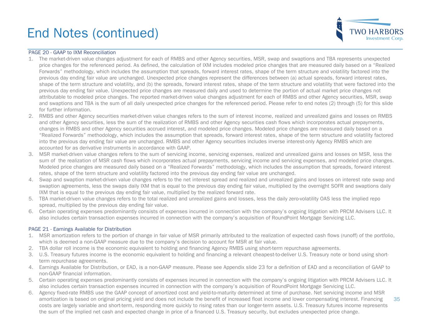 End Notes (continued) PAGE 18 - Financial Performance 1. Economic return on book value is defined as the increase (decrease) in book value per common share from the beginning to the end of the given period, plus dividends declared in the period, divided by the book value as of the beginning of the period. 2. Historical dividends may not be indicative of future dividend distributions. The company ultimately distributes dividends based on its taxable income per common share, not GAAP earnings. The annualized dividend yield on the company’s common stock is calculated based on the closing price of the last trading day of the relevant quarter. PAGE 19 - Comparison of GAAP and non-GAAP Measures 1. Earnings Available for Distribution, or EAD, is a non-GAAP measure. Please see Appendix slide 23 for a definition of EAD and a reconciliation of GAAP to non- GAAP financial information. 2. Income Excluding Market-Driven Value Changes, or IXM, is a non-GAAP measure. Please Appendix slide 20 for a definition of IXM and a reconciliation of GAAP to non-GAAP financial information. 3. RMBS and other Agency securities includes inverse interest-only Agency RMBS, which are accounted for as derivative instruments in accordance with GAAP. 4. RMBS and other Agency securities daily price change based on Realized Forwards for IXM is equal to the previous day ending fair value multiplied by the sum of the risk-free rate and zero-volatility OAS, less coupon income. RMBS and other Agency securities daily price change for IXM is reflected as the sum of amortization and realized and unrealized, and provision for credit losses. 5. Servicing expenses for IXM excludes deboarding fees associated with one-time transfers of MSR. 6. MSR daily price change based on Realized Forwards for IXM is equal to the previous day ending fair value multiplied by the the sum of the risk-free rate and zero-volatility OAS, less service fee income and servicing expenses. MSR daily price change for IXM is reflected as the sum of amortization and realized and unrealized, including change in servicing reserves. 7. Swaps daily IXM is equal to the previous day ending fair value multiplied by the overnight SOFR, which is reflected as the sum of swap net interest spread and swap realized and unrealized. Swaptions daily IXM is equal to the previous day ending fair value multiplied by the realized forward rate. 8. TBAs daily income for IXM is equal to the zero-volatility OAS less the implied repo spread, multiplied by the previous day ending fair value. 9. Other income for IXM excludes gains on repurchases of convertible senior notes. 10. Operating expenses for IXM excludes certain operating expenses. Certain operating expenses predominantly consists of expenses incurred in connection with the company’s ongoing litigation with PRCM Advisers LLC. It also includes certain transaction expenses incurred in connection with the company’s acquisition of RoundPoint Mortgage Servicing LLC. 11. Tax benefit (expense) for each GAAP and non-GAAP metric includes the estimated tax expense associated with each pre-tax GAAP and non-GAAP metric earned or incurred in the company's taxable REIT subsidiaries, or TRSs. 34