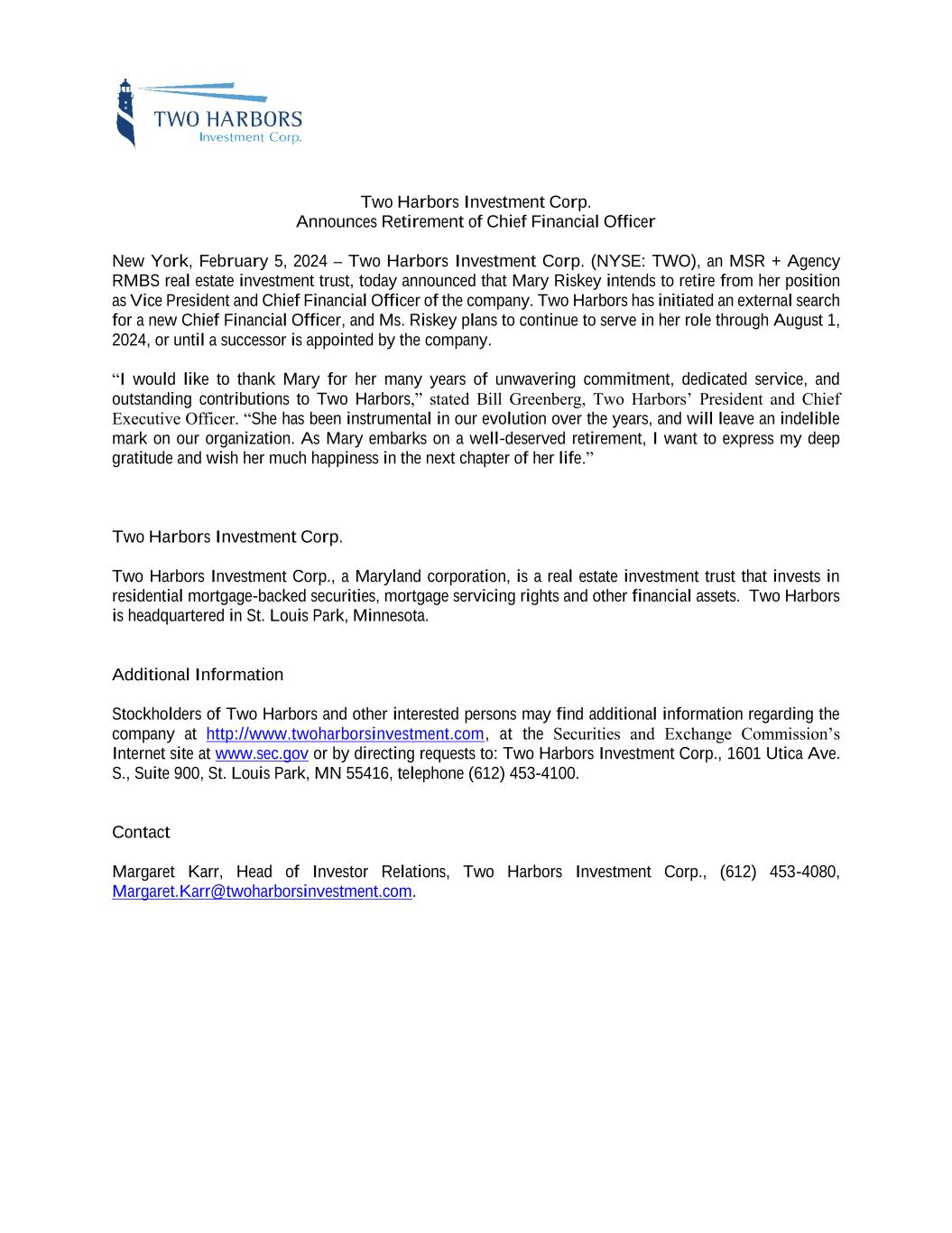 Two Harbors Investment Corp. Announces Retirement of Chief Financial Officer New York, February 5, 2024 – Two Harbors Investment Corp. (NYSE: TWO), an MSR + Agency RMBS real estate investment trust, today announced that Mary Riskey intends to retire from her position as Vice President and Chief Financial Officer of the company. Two Harbors has initiated an external search for a new Chief Financial Officer, and Ms. Riskey plans to continue to serve in her role through August 1, 2024, or until a successor is appointed by the company. “I would like to thank Mary for her many years of unwavering commitment, dedicated service, and outstanding contributions to Two Harbors,” stated Bill Greenberg, Two Harbors’ President and Chief Executive Officer. “She has been instrumental in our evolution over the years, and will leave an indelible mark on our organization. As Mary embarks on a well-deserved retirement, I want to express my deep gratitude and wish her much happiness in the next chapter of her life.” Two Harbors Investment Corp. Two Harbors Investment Corp., a Maryland corporation, is a real estate investment trust that invests in residential mortgage-backed securities, mortgage servicing rights and other financial assets. Two Harbors is headquartered in St. Louis Park, Minnesota. Additional Information Stockholders of Two Harbors and other interested persons may find additional information regarding the company at http://www.twoharborsinvestment.com, at the Securities and Exchange Commission’s Internet site at www.sec.gov or by directing requests to: Two Harbors Investment Corp., 1601 Utica Ave. S., Suite 900, St. Louis Park, MN 55416, telephone (612) 453-4100. Contact Margaret Karr, Head of Investor Relations, Two Harbors Investment Corp., (612) 453-4080, Margaret.Karr@twoharborsinvestment.com.