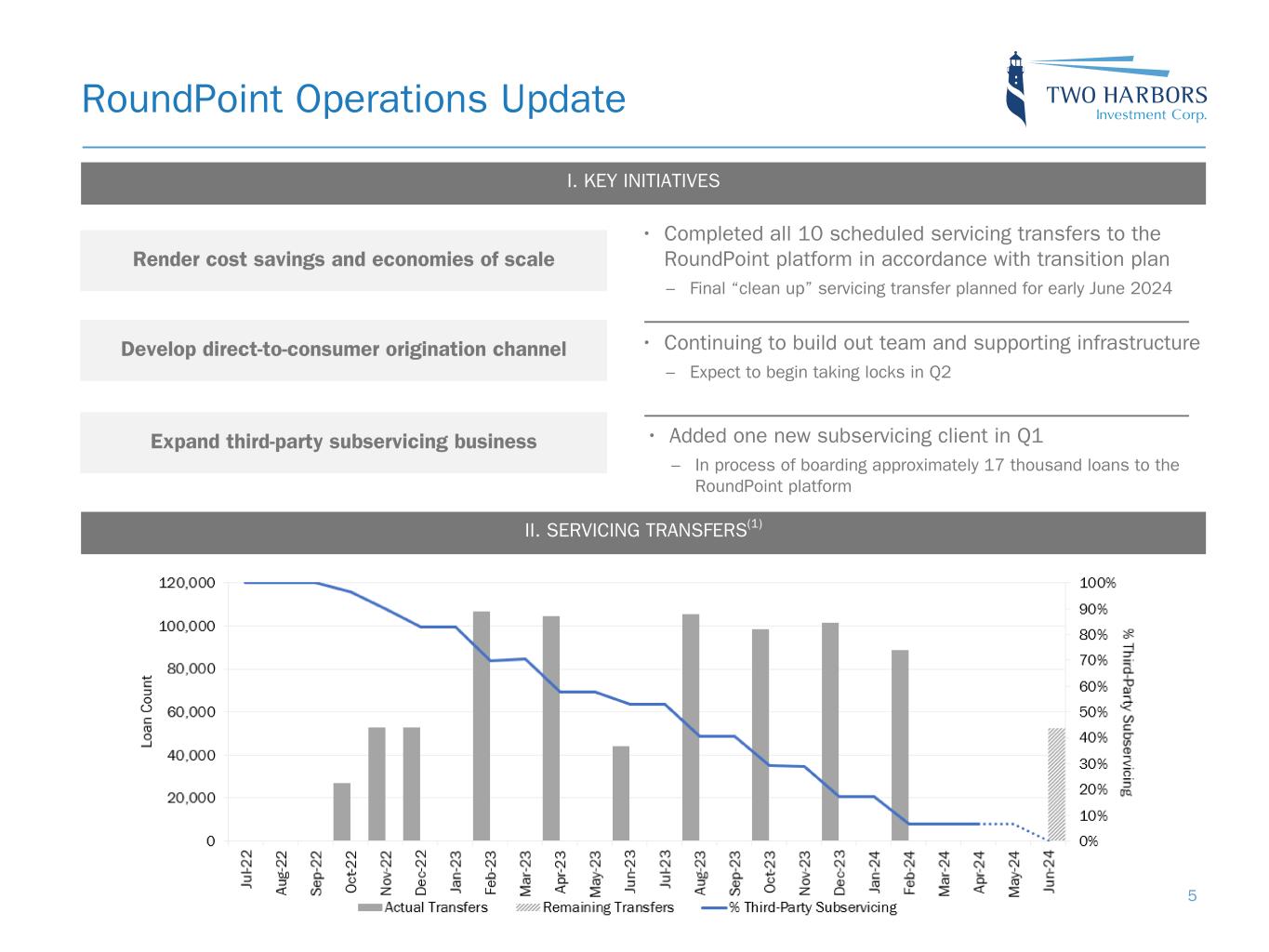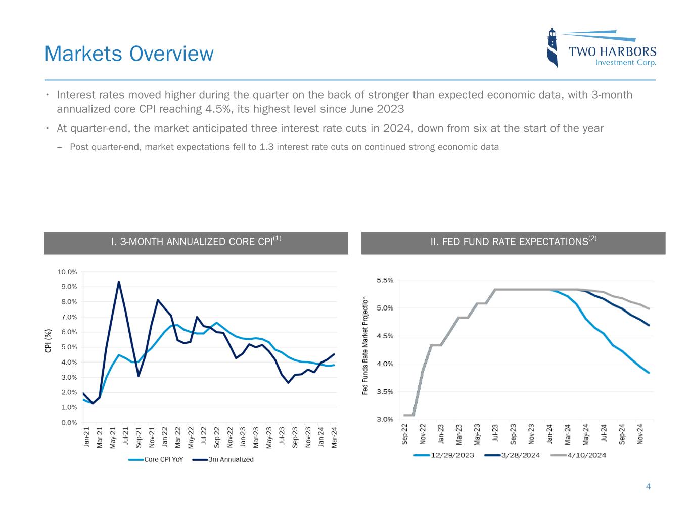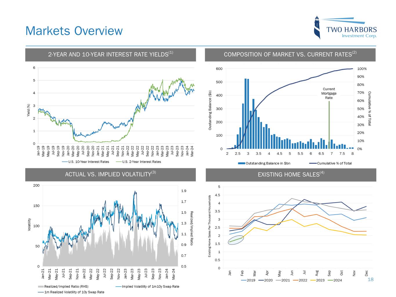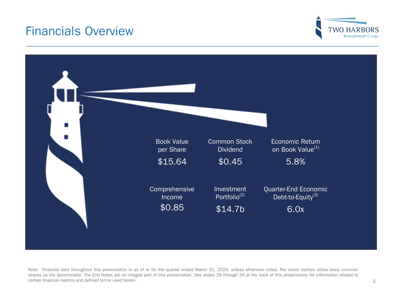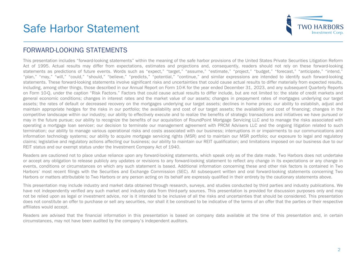 Safe Harbor Statement 2 FORWARD-LOOKING STATEMENTS This presentation includes “forward-looking statements” within the meaning of the safe harbor provisions of the United States Private Securities Litigation Reform Act of 1995. Actual results may differ from expectations, estimates and projections and, consequently, readers should not rely on these forward-looking statements as predictions of future events. Words such as “expect,” “target,” “assume,” “estimate,” “project,” “budget,” “forecast,” “anticipate,” “intend,” “plan,” “may,” “will,” “could,” “should,” “believe,” “predicts,” “potential,” “continue,” and similar expressions are intended to identify such forward-looking statements. These forward-looking statements involve significant risks and uncertainties that could cause actual results to differ materially from expected results, including, among other things, those described in our Annual Report on Form 10-K for the year ended December 31, 2023, and any subsequent Quarterly Reports on Form 10-Q, under the caption “Risk Factors.” Factors that could cause actual results to differ include, but are not limited to: the state of credit markets and general economic conditions; changes in interest rates and the market value of our assets; changes in prepayment rates of mortgages underlying our target assets; the rates of default or decreased recovery on the mortgages underlying our target assets; declines in home prices; our ability to establish, adjust and maintain appropriate hedges for the risks in our portfolio; the availability and cost of our target assets; the availability and cost of financing; changes in the competitive landscape within our industry; our ability to effectively execute and to realize the benefits of strategic transactions and initiatives we have pursued or may in the future pursue; our ability to recognize the benefits of our acquisition of RoundPoint Mortgage Servicing LLC and to manage the risks associated with operating a mortgage loan servicer; our decision to terminate our management agreement with PRCM Advisers LLC and the ongoing litigation related to such termination; our ability to manage various operational risks and costs associated with our business; interruptions in or impairments to our communications and information technology systems; our ability to acquire mortgage servicing rights (MSR) and to maintain our MSR portfolio; our exposure to legal and regulatory claims; legislative and regulatory actions affecting our business; our ability to maintain our REIT qualification; and limitations imposed on our business due to our REIT status and our exempt status under the Investment Company Act of 1940. Readers are cautioned not to place undue reliance upon any forward-looking statements, which speak only as of the date made. Two Harbors does not undertake or accept any obligation to release publicly any updates or revisions to any forward-looking statement to reflect any change in its expectations or any change in events, conditions or circumstances on which any such statement is based. Additional information concerning these and other risk factors is contained in Two Harbors’ most recent filings with the Securities and Exchange Commission (SEC). All subsequent written and oral forward-looking statements concerning Two Harbors or matters attributable to Two Harbors or any person acting on its behalf are expressly qualified in their entirety by the cautionary statements above. This presentation may include industry and market data obtained through research, surveys, and studies conducted by third parties and industry publications. We have not independently verified any such market and industry data from third-party sources. This presentation is provided for discussion purposes only and may not be relied upon as legal or investment advice, nor is it intended to be inclusive of all the risks and uncertainties that should be considered. This presentation does not constitute an offer to purchase or sell any securities, nor shall it be construed to be indicative of the terms of an offer that the parties or their respective affiliates would accept. Readers are advised that the financial information in this presentation is based on company data available at the time of this presentation and, in certain circumstances, may not have been audited by the company’s independent auditors.