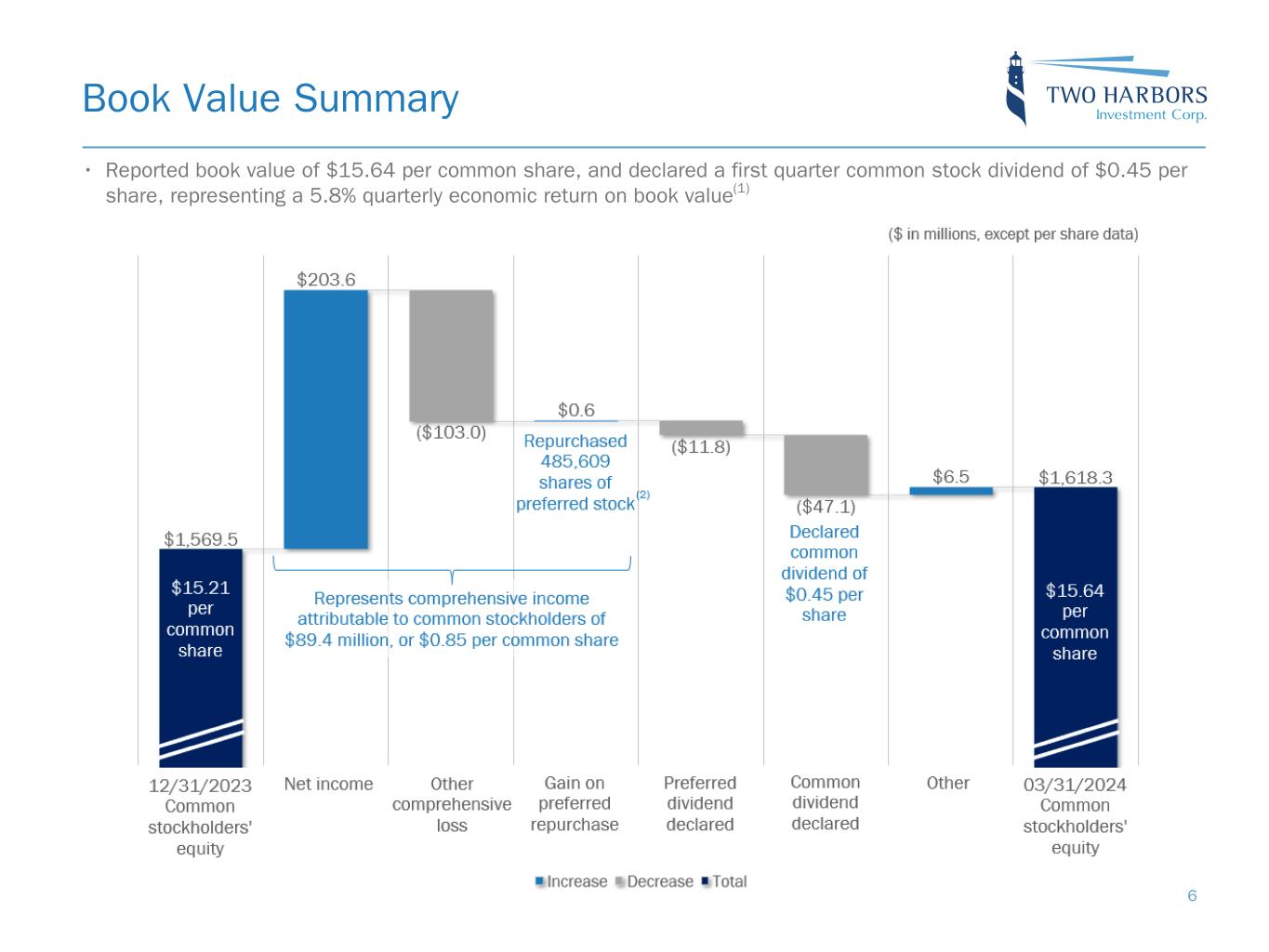 Book Value Summary • Reported book value of $15.64 per common share, and declared a first quarter common stock dividend of $0.45 per share, representing a 5.8% quarterly economic return on book value(1) 6