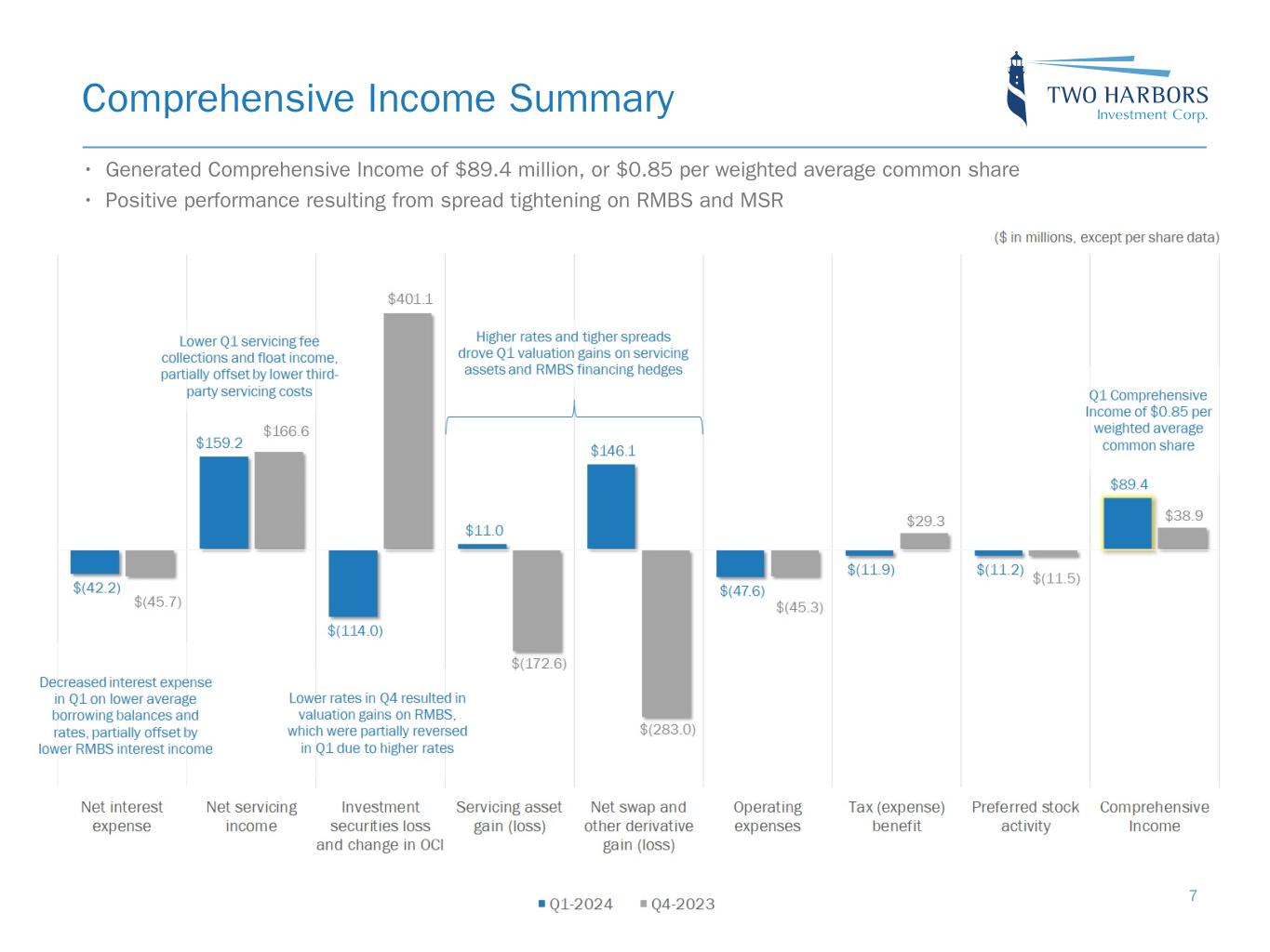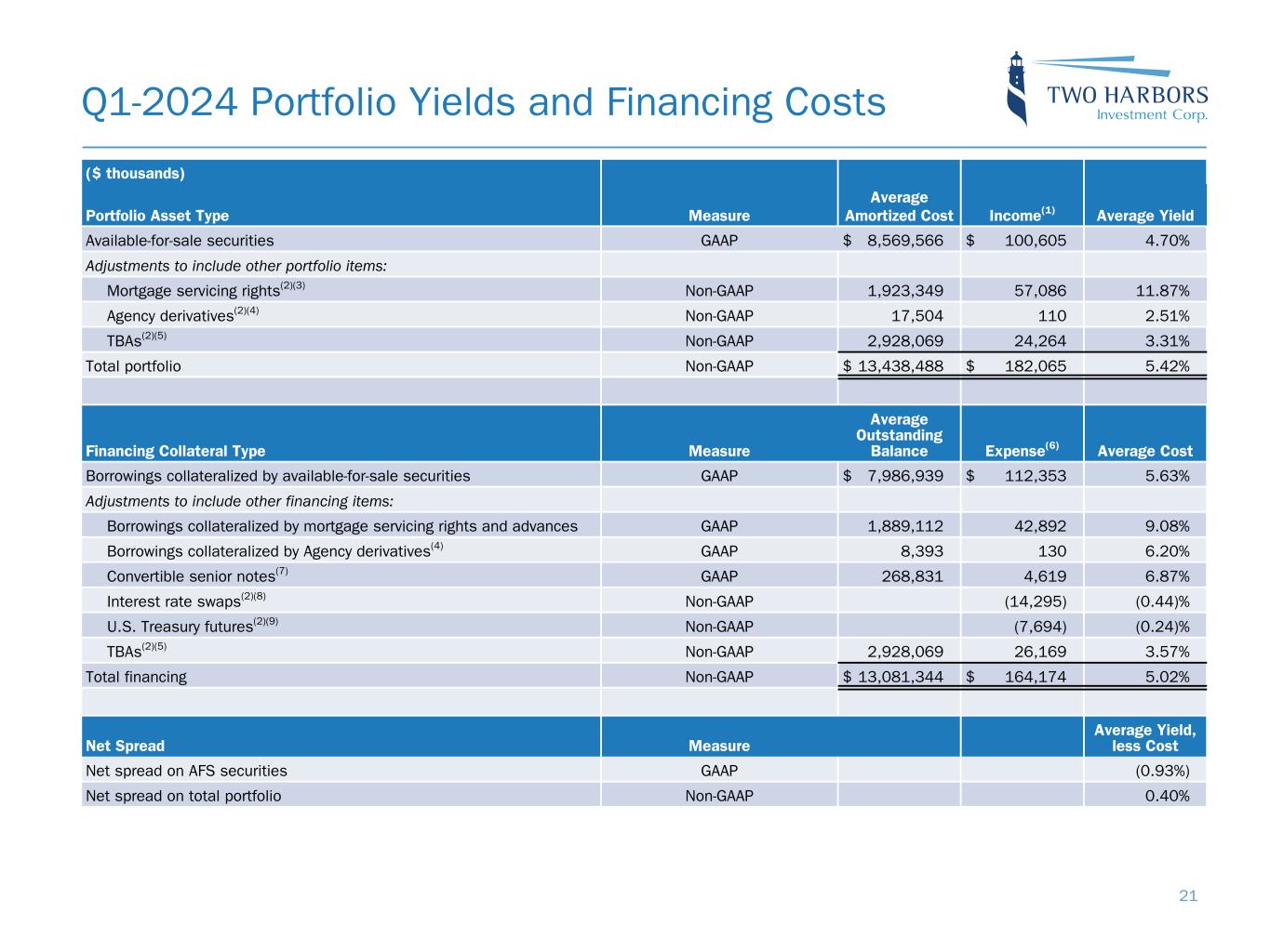 Q1-2024 Portfolio Yields and Financing Costs ($ thousands) Portfolio Asset Type Measure Average Amortized Cost Income(1) Average Yield Available-for-sale securities GAAP $ 8,569,566 $ 100,605 4.70% Adjustments to include other portfolio items: Mortgage servicing rights(2)(3) Non-GAAP 1,923,349 57,086 11.87% Agency derivatives(2)(4) Non-GAAP 17,504 110 2.51 % TBAs(2)(5) Non-GAAP 2,928,069 24,264 3.31 % Total portfolio Non-GAAP $ 13,438,488 $ 182,065 5.42% Financing Collateral Type Measure Average Outstanding Balance Expense(6) Average Cost Borrowings collateralized by available-for-sale securities GAAP $ 7,986,939 $ 112,353 5.63% Adjustments to include other financing items: Borrowings collateralized by mortgage servicing rights and advances GAAP 1,889,112 42,892 9.08 % Borrowings collateralized by Agency derivatives(4) GAAP 8,393 130 6.20 % Convertible senior notes(7) GAAP 268,831 4,619 6.87 % Interest rate swaps(2)(8) Non-GAAP (14,295) (0.44) % U.S. Treasury futures(2)(9) Non-GAAP (7,694) (0.24) % TBAs(2)(5) Non-GAAP 2,928,069 26,169 3.57 % Total financing Non-GAAP $ 13,081,344 $ 164,174 5.02 % Net Spread Measure Average Yield, less Cost Net spread on AFS securities GAAP (0.93%) Net spread on total portfolio Non-GAAP 0.40% 21