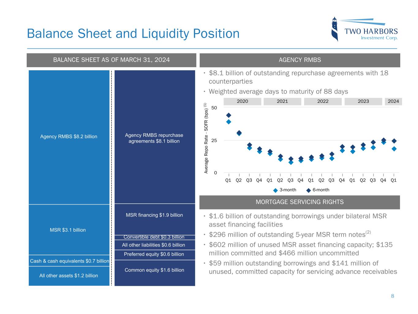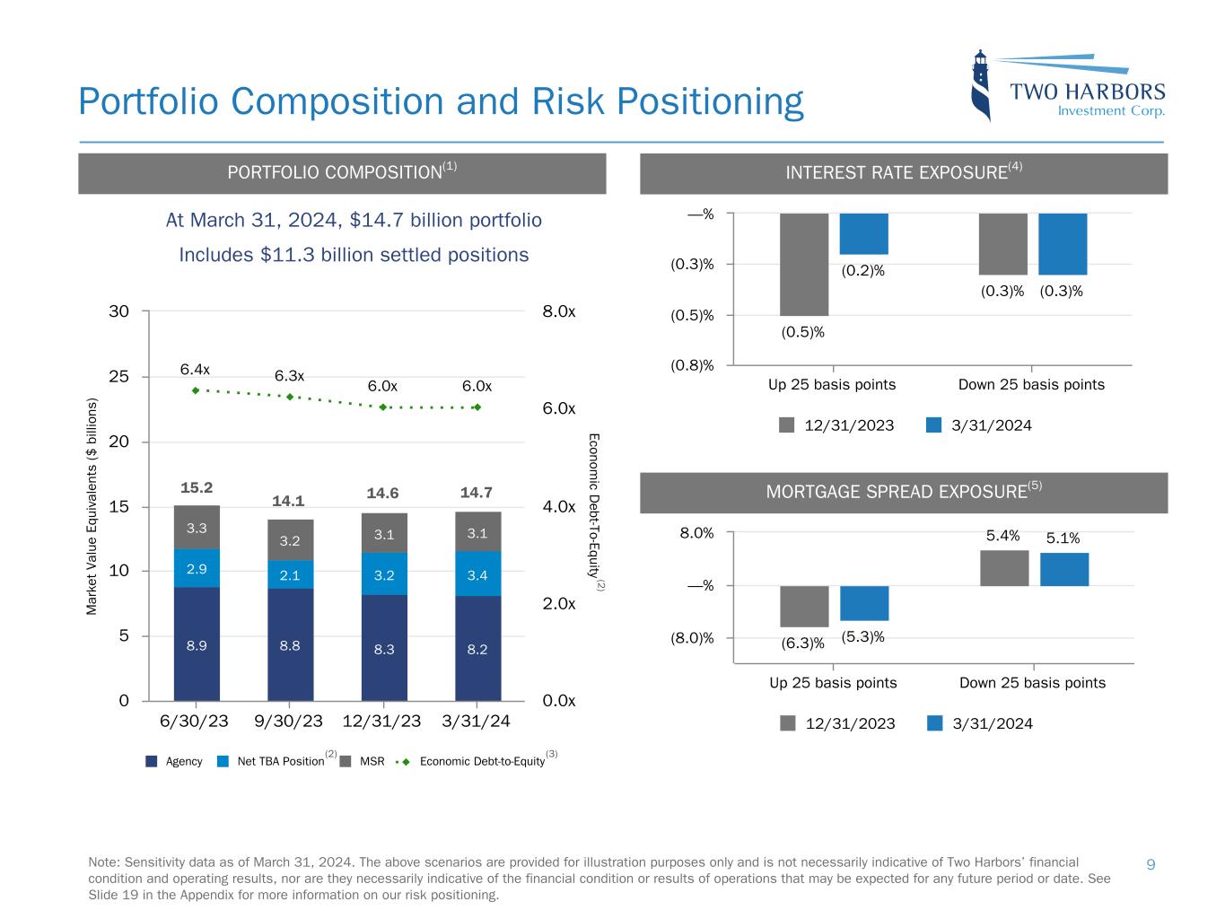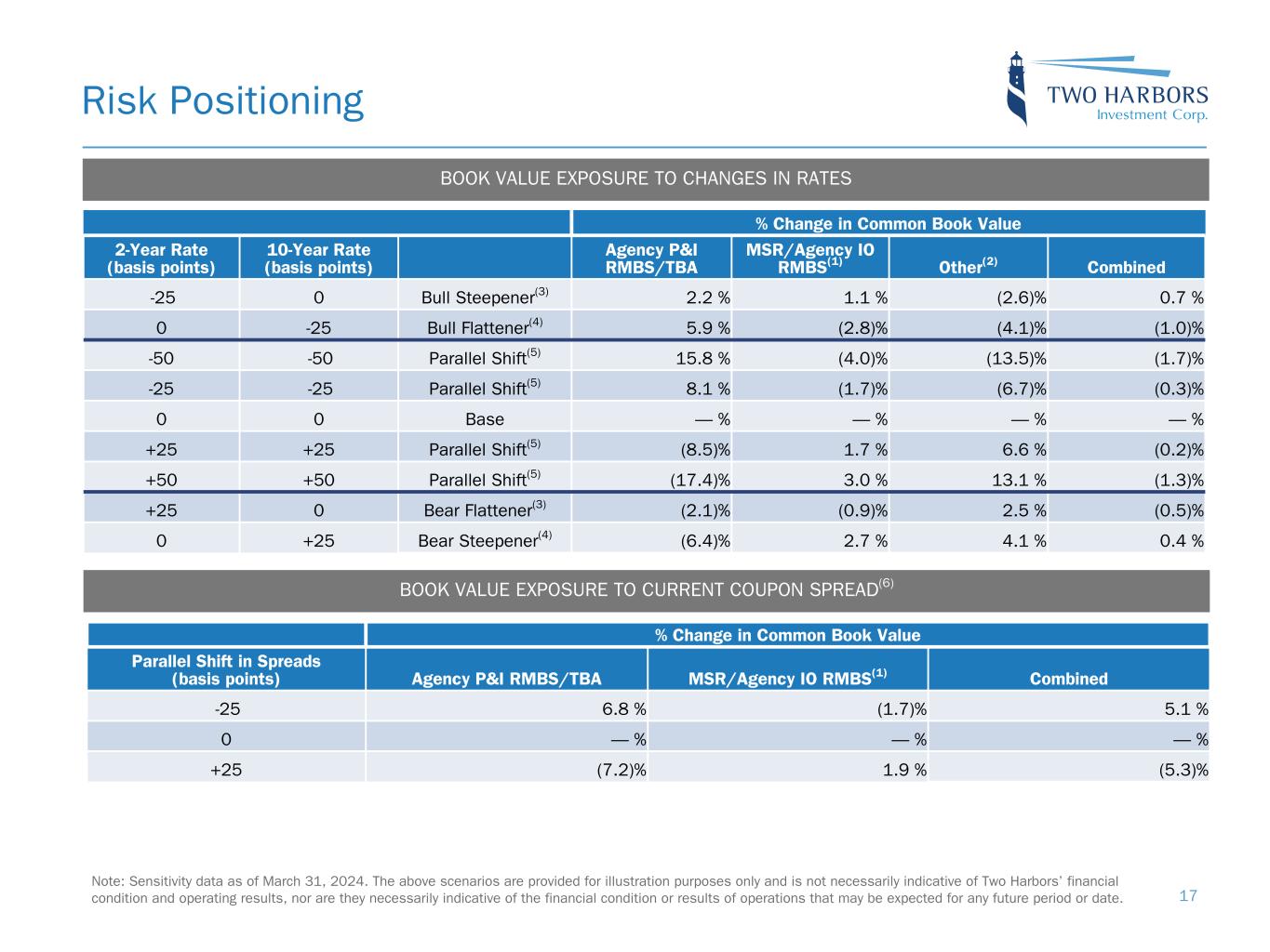 Note: Sensitivity data as of March 31, 2024. The above scenarios are provided for illustration purposes only and is not necessarily indicative of Two Harbors’ financial condition and operating results, nor are they necessarily indicative of the financial condition or results of operations that may be expected for any future period or date. Risk Positioning BOOK VALUE EXPOSURE TO CHANGES IN RATES % Change in Common Book Value 2-Year Rate (basis points) 10-Year Rate (basis points) Agency P&I RMBS/TBA MSR/Agency IO RMBS(1) Other(2) Combined -25 0 Bull Steepener(3) 2.2 % 1.1 % (2.6) % 0.7 % 0 -25 Bull Flattener(4) 5.9 % (2.8) % (4.1) % (1.0) % -50 -50 Parallel Shift(5) 15.8 % (4.0) % (13.5) % (1.7) % -25 -25 Parallel Shift(5) 8.1 % (1.7) % (6.7) % (0.3) % 0 0 Base — % — % — % — % +25 +25 Parallel Shift(5) (8.5) % 1.7 % 6.6 % (0.2) % +50 +50 Parallel Shift(5) (17.4) % 3.0 % 13.1 % (1.3) % +25 0 Bear Flattener(3) (2.1) % (0.9) % 2.5 % (0.5) % 0 +25 Bear Steepener(4) (6.4) % 2.7 % 4.1 % 0.4 % BOOK VALUE EXPOSURE TO CURRENT COUPON SPREAD(6) % Change in Common Book Value Parallel Shift in Spreads (basis points) Agency P&I RMBS/TBA MSR/Agency IO RMBS(1) Combined -25 6.8 % (1.7) % 5.1 % 0 — % — % — % +25 (7.2) % 1.9 % (5.3) % 17