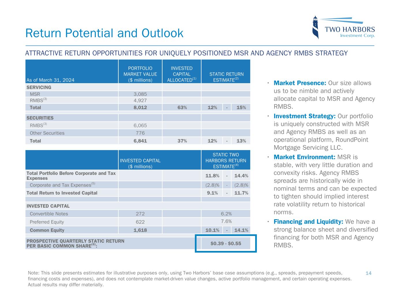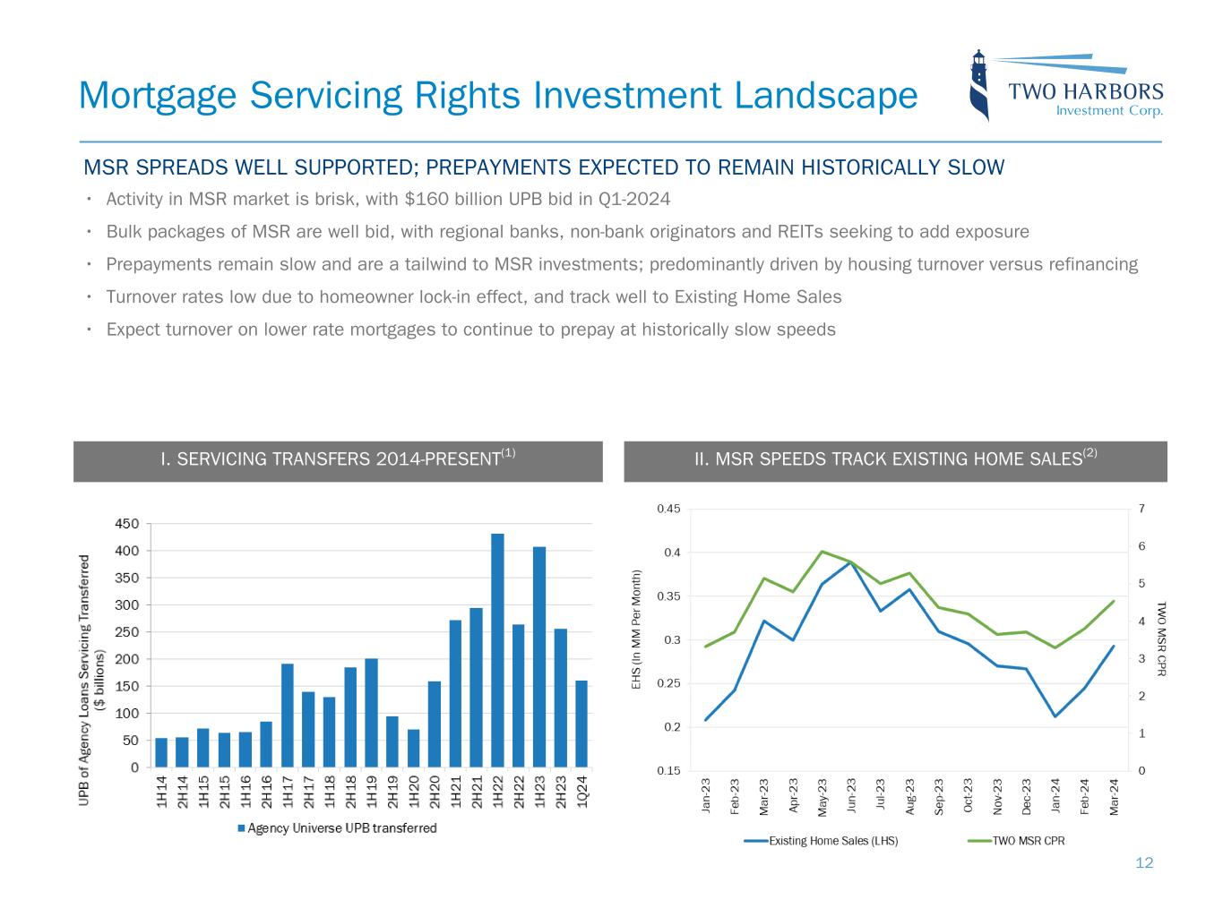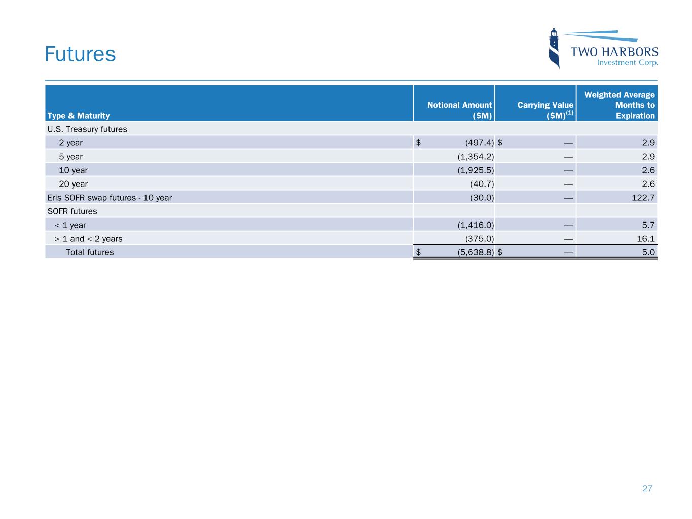 Note: Sensitivity data as of March 31, 2024. The above scenarios are provided for illustration purposes only and is not necessarily indicative of Two Harbors’ financial condition and operating results, nor are they necessarily indicative of the financial condition or results of operations that may be expected for any future period or date. Risk Positioning BOOK VALUE EXPOSURE TO CHANGES IN RATES % Change in Common Book Value 2-Year Rate (basis points) 10-Year Rate (basis points) Agency P&I RMBS/TBA MSR/Agency IO RMBS(1) Other(2) Combined -25 0 Bull Steepener(3) 2.2 % 1.1 % (2.6) % 0.7 % 0 -25 Bull Flattener(4) 5.9 % (2.8) % (4.1) % (1.0) % -50 -50 Parallel Shift(5) 15.8 % (4.0) % (13.5) % (1.7) % -25 -25 Parallel Shift(5) 8.1 % (1.7) % (6.7) % (0.3) % 0 0 Base — % — % — % — % +25 +25 Parallel Shift(5) (8.5) % 1.7 % 6.6 % (0.2) % +50 +50 Parallel Shift(5) (17.4) % 3.0 % 13.1 % (1.3) % +25 0 Bear Flattener(3) (2.1) % (0.9) % 2.5 % (0.5) % 0 +25 Bear Steepener(4) (6.4) % 2.7 % 4.1 % 0.4 % BOOK VALUE EXPOSURE TO CURRENT COUPON SPREAD(6) % Change in Common Book Value Parallel Shift in Spreads (basis points) Agency P&I RMBS/TBA MSR/Agency IO RMBS(1) Combined -25 6.8 % (1.7) % 5.1 % 0 — % — % — % +25 (7.2) % 1.9 % (5.3) % 17