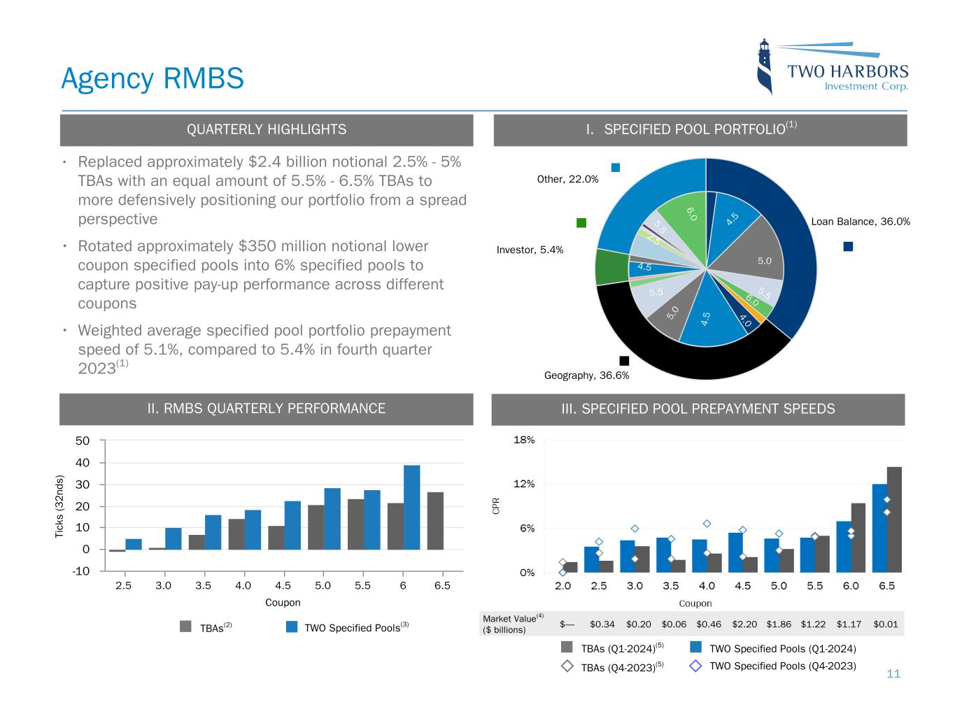 Loan Balance, 36.0% Geography, 36.6% Investor, 5.4% Other, 22.0% II. RMBS QUARTERLY PERFORMANCE Coupon Ti ck s (3 2 nd s) 2.5 3.0 3.5 4.0 4.5 5.0 5.5 6 6.5 -10 0 10 20 30 40 50 Agency RMBS I. SPECIFIED POOL PORTFOLIO(1) III. SPECIFIED POOL PREPAYMENT SPEEDS TWO Specified Pools(3)TBAs(2) TWO Specified Pools (Q1-2024)TBAs (Q1-2024)(5) TBAs (Q4-2023)(5) TWO Specified Pools (Q4-2023) Market Value(4) ($ billions) $— $0.34 $0.20 $0.06 $0.46 $2.20 $1.86 $1.22 $1.17 $0.01 QUARTERLY HIGHLIGHTS • Replaced approximately $2.4 billion notional 2.5% - 5% TBAs with an equal amount of 5.5% - 6.5% TBAs to more defensively positioning our portfolio from a spread perspective • Rotated approximately $350 million notional lower coupon specified pools into 6% specified pools to capture positive pay-up performance across different coupons • Weighted average specified pool portfolio prepayment speed of 5.1%, compared to 5.4% in fourth quarter 2023(1) 5.5 4. 5 5.0 4.04. 55. 0 5.5 6.0 11 6.0 2.5 5.5 4.5