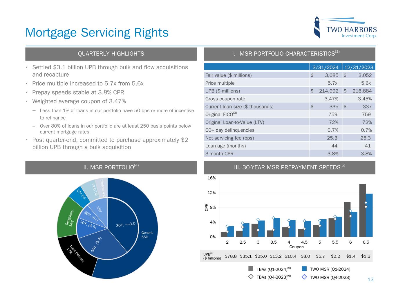 UPB(4) ($ billions) $78.8 $35.1 $25.0 $13.2 $10.4 $8.0 $5.7 $2.2 $1.4 $1.3 • Settled $3.1 billion UPB through bulk and flow acquisitions and recapture • Price multiple increased to 5.7x from 5.6x • Prepay speeds stable at 3.8% CPR • Weighted average coupon of 3.47% – Less than 1% of loans in our portfolio have 50 bps or more of incentive to refinance – Over 80% of loans in our portfolio are at least 250 basis points below current mortgage rates • Post quarter-end, committed to purchase approximately $2 billion UPB through a bulk acquisition Mortgage Servicing Rights III. 30-YEAR MSR PREPAYMENT SPEEDS(5) 3/31/2024 12/31/2023 Fair value ($ millions) $ 3,085 $ 3,052 Price multiple 5.7x 5.6x UPB ($ millions) $ 214,992 $ 216,884 Gross coupon rate 3.47 % 3.45 % Current loan size ($ thousands) $ 335 $ 337 Original FICO(3) 759 759 Original Loan-to-Value (LTV) 72 % 72 % 60+ day delinquencies 0.7 % 0.7 % Net servicing fee (bps) 25.3 25.3 Loan age (months) 44 41 3-month CPR 3.8 % 3.8 % I. MSR PORTFOLIO CHARACTERISTICS(1) TWO MSR (Q1-2024)TBAs (Q1-2024)(6) TBAs (Q4-2023)(6) TWO MSR (Q4-2023) QUARTERLY HIGHLIGHTS II. MSR PORTFOLIO(4) LTV 5% FIC O 5% Investor 4 % G eo gr ap hy 14 % Generic 55% 30 Y, (3 ,4 ] 30Y, (4,5] 15Y 30Y, <=3.0 30Y, (5+] Loan Balance 17% 13
