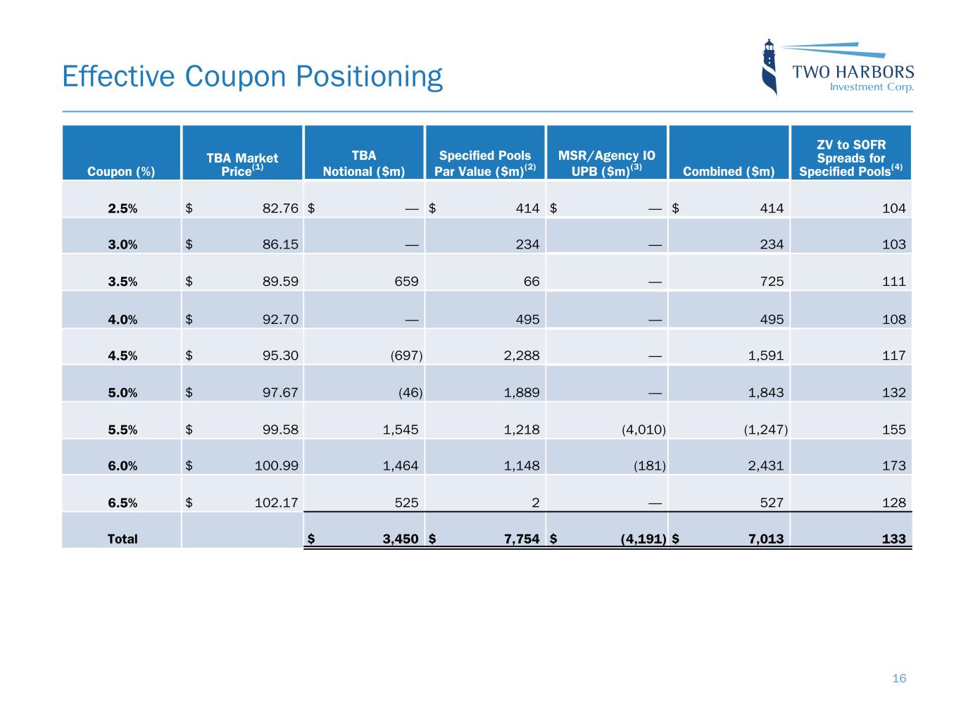 Effective Coupon Positioning Coupon (%) TBA Market Price(1) TBA Notional ($m) Specified Pools Par Value ($m)(2) MSR/Agency IO UPB ($m)(3) Combined ($m) ZV to SOFR Spreads for Specified Pools(4) 2.5% $ 82.76 $ — $ 414 $ — $ 414 104 3.0% $ 86.15 — 234 — 234 103 3.5% $ 89.59 659 66 — 725 111 4.0% $ 92.70 — 495 — 495 108 4.5% $ 95.30 (697) 2,288 — 1,591 117 5.0% $ 97.67 (46) 1,889 — 1,843 132 5.5% $ 99.58 1,545 1,218 (4,010) (1,247) 155 6.0% $ 100.99 1,464 1,148 (181) 2,431 173 6.5% $ 102.17 525 2 — 527 128 Total $ 3,450 $ 7,754 $ (4,191) $ 7,013 133 16