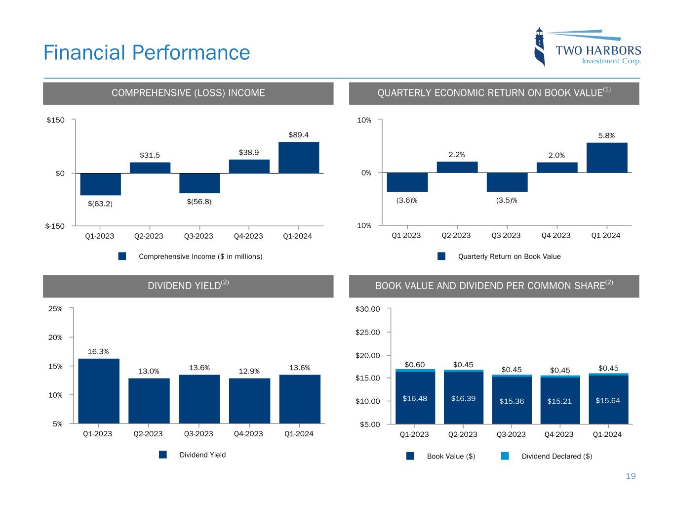 $(63.2) $31.5 $(56.8) $38.9 $89.4 Comprehensive Income ($ in millions) Q1-2023 Q2-2023 Q3-2023 Q4-2023 Q1-2024 $-150 $0 $150 $16.48 $16.39 $15.36 $15.21 $15.64 $0.60 $0.45 $0.45 $0.45 $0.45 Book Value ($) Dividend Declared ($) Q1-2023 Q2-2023 Q3-2023 Q4-2023 Q1-2024 $5.00 $10.00 $15.00 $20.00 $25.00 $30.00 DIVIDEND YIELD(2) Financial Performance COMPREHENSIVE (LOSS) INCOME QUARTERLY ECONOMIC RETURN ON BOOK VALUE(1) BOOK VALUE AND DIVIDEND PER COMMON SHARE(2) (3.6)% 2.2% (3.5)% 2.0% 5.8% Quarterly Return on Book Value Q1-2023 Q2-2023 Q3-2023 Q4-2023 Q1-2024 -10% 0% 10% 16.3% 13.0% 13.6% 12.9% 13.6% Dividend Yield Q1-2023 Q2-2023 Q3-2023 Q4-2023 Q1-2024 5% 10% 15% 20% 25% 19