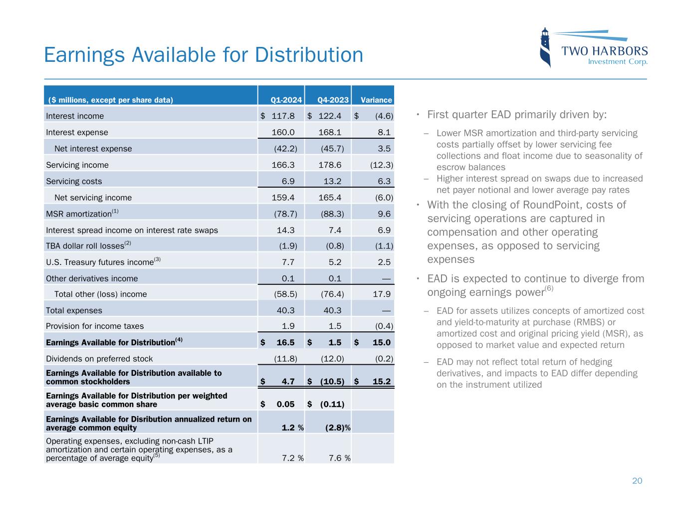 GAAP to EAD Reconciliation Reconciliation of GAAP to non-GAAP Information Three Months Ended Three Months Ended ($ thousands, except for per common share data) March 31, 2024 December 31, 2023 Comprehensive income attributable to common stockholders $ 89,370 $ 38,886 Adjustment for other comprehensive loss (income) attributable to common stockholders: Unrealized loss (gain) on available-for-sale securities 103,078 (483,579) Net income (loss) attributable to common stockholders $ 192,448 $ (444,693) Adjustments to exclude reported realized and unrealized (gains) losses: Realized loss on securities 10,915 83,505 Unrealized gain on securities (20) (708) Provision (reversal of provision) for credit losses 80 (328) Realized and unrealized (gain) loss on mortgage servicing rights (11,012) 172,589 Realized (gain) loss on termination or expiration of interest rate swaps and swaptions (13,890) 12,438 Unrealized (gain) loss on interest rate swaps and swaptions (70,325) 134,240 Realized and unrealized (gain) loss on other derivative instruments (47,489) 143,906 Gain on repurchase and retirement of preferred stock (644) (519) Other realized and unrealized losses 3 — Other adjustments: MSR amortization(1) (78,704) (88,286) TBA dollar roll losses(2) (1,905) (777) U.S. Treasury futures income(3) 7,694 5,143 Change in servicing reserves 215 (1,230) Non-cash equity compensation expense 6,083 1,613 Certain operating expenses(4) 1,198 3,408 Net provision for (benefit from) income taxes on non-EAD 10,078 (30,806) Earnings available for distribution to common stockholders $ 4,725 $ (10,505) Weighted average basic common shares 103,401,940 97,489,039 Earnings available for distribution to common stockholders per weighted average basic common share $ 0.05 $ (0.11) Note: Earnings Available for Distribution, or EAD, is a non-GAAP measure that we define as comprehensive income attributable to common stockholders, excluding realized and unrealized gains and losses on the aggregate portfolio, gains and losses on repurchases of preferred stock, provision for (reversal of) credit losses, reserve expense for representation and warranty obligations on MSR, non-cash compensation expense related to restricted common stock, and certain operating expenses. As defined, EAD includes net interest income, accrual and settlement of interest on derivatives, dollar roll income on TBAs, U.S. Treasury futures income, servicing income, net of estimated amortization on MSR and certain cash related operating expenses. EAD provides supplemental information to assist investors in analyzing the company’s results of operations and helps facilitate comparisons to industry peers. EAD is one of several measures our board of directors considers to determine the amount of dividends to declare on our common stock and should not be considered an indication of our taxable income or as a proxy for the amount of dividends we may declare. 22