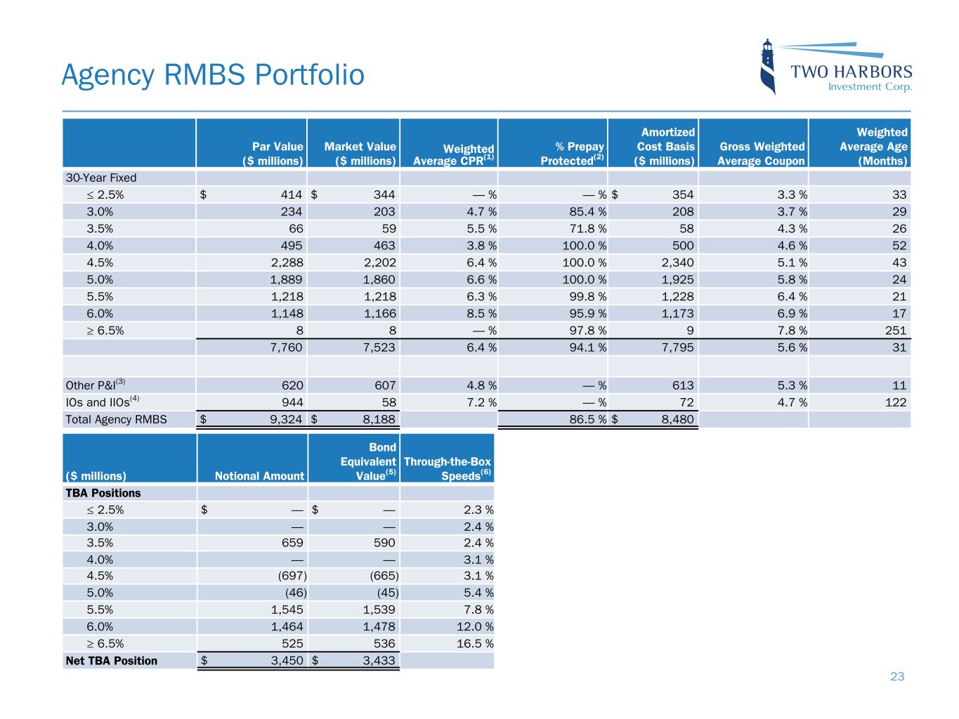 Agency RMBS Portfolio Par Value ($ millions) Market Value ($ millions) Weighted Average CPR(1) % Prepay Protected(2) Amortized Cost Basis ($ millions) Gross Weighted Average Coupon Weighted Average Age (Months) 30-Year Fixed ≤ 2.5% $ 414 $ 344 — % — % $ 354 3.3 % 33 3.0% 234 203 4.7 % 85.4 % 208 3.7 % 29 3.5% 66 59 5.5 % 71.8 % 58 4.3 % 26 4.0% 495 463 3.8 % 100.0 % 500 4.6 % 52 4.5% 2,288 2,202 6.4 % 100.0 % 2,340 5.1 % 43 5.0% 1,889 1,860 6.6 % 100.0 % 1,925 5.8 % 24 5.5% 1,218 1,218 6.3 % 99.8 % 1,228 6.4 % 21 6.0% 1,148 1,166 8.5 % 95.9 % 1,173 6.9 % 17 ≥ 6.5% 8 8 — % 97.8 % 9 7.8 % 251 7,760 7,523 6.4 % 94.1 % 7,795 5.6 % 31 Other P&I(3) 620 607 4.8 % — % 613 5.3 % 11 IOs and IIOs(4) 944 58 7.2 % — % 72 4.7 % 122 Total Agency RMBS $ 9,324 $ 8,188 86.5 % $ 8,480 ($ millions) Notional Amount Bond Equivalent Value(5) Through-the-Box Speeds(6) TBA Positions ≤ 2.5% $ — $ — 2.3 % 3.0% — — 2.4 % 3.5% 659 590 2.4 % 4.0% — — 3.1 % 4.5% (697) (665) 3.1 % 5.0% (46) (45) 5.4 % 5.5% 1,545 1,539 7.8 % 6.0% 1,464 1,478 12.0 % ≥ 6.5% 525 536 16.5 % Net TBA Position $ 3,450 $ 3,433 23