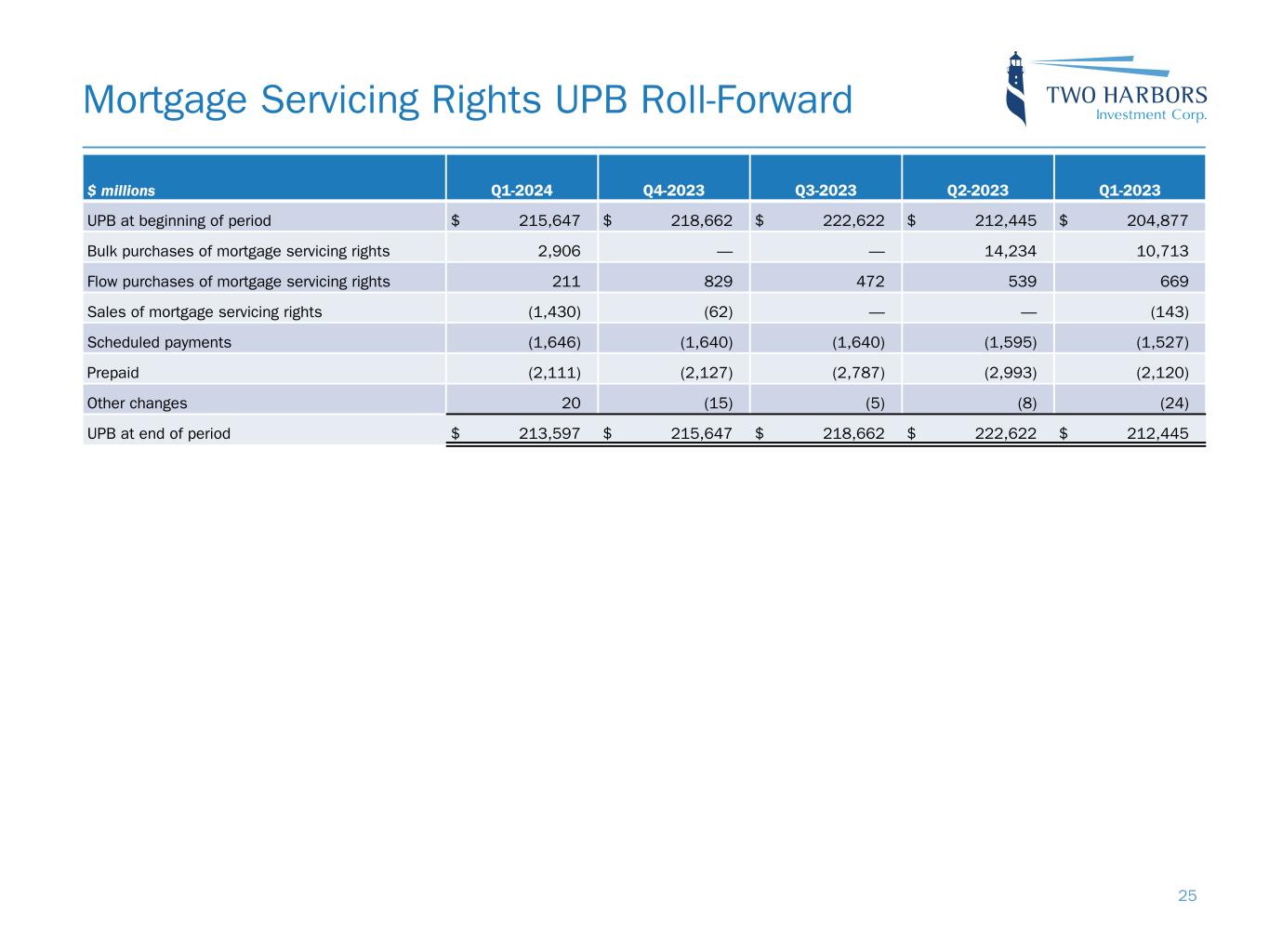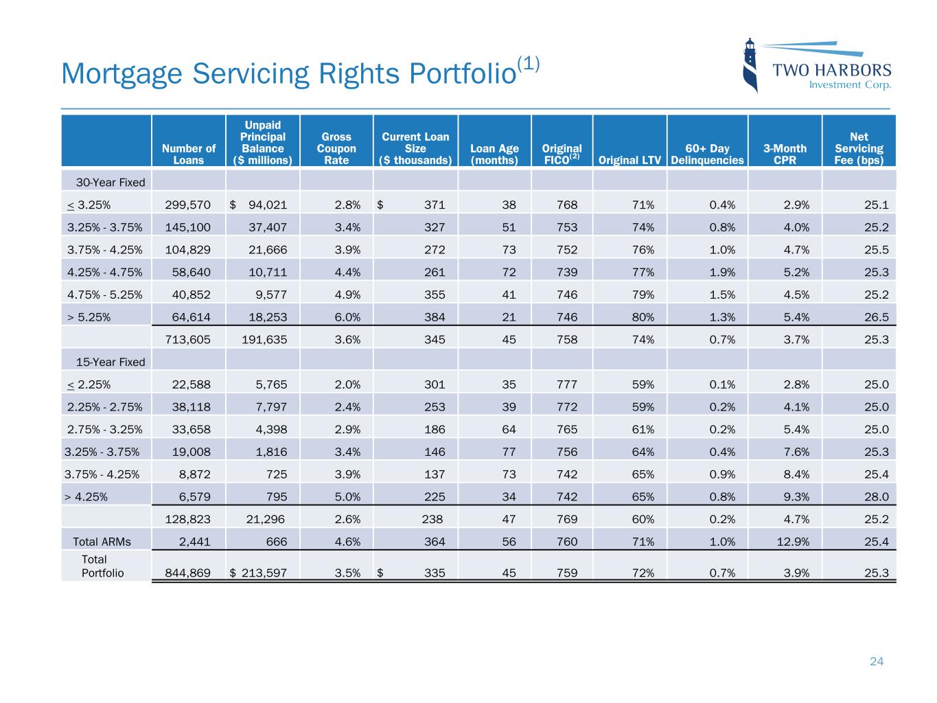 Mortgage Servicing Rights Portfolio(1) Number of Loans Unpaid Principal Balance ($ millions) Gross Coupon Rate Current Loan Size ($ thousands) Loan Age (months) Original FICO(2) Original LTV 60+ Day Delinquencies 3-Month CPR Net Servicing Fee (bps) 30-Year Fixed < 3.25% 299,570 $ 94,021 2.8% $ 371 38 768 71% 0.4% 2.9% 25.1 3.25% - 3.75% 145,100 37,407 3.4% 327 51 753 74% 0.8% 4.0% 25.2 3.75% - 4.25% 104,829 21,666 3.9 % 272 73 752 76 % 1.0 % 4.7 % 25.5 4.25% - 4.75% 58,640 10,711 4.4 % 261 72 739 77 % 1.9 % 5.2 % 25.3 4.75% - 5.25% 40,852 9,577 4.9 % 355 41 746 79 % 1.5 % 4.5 % 25.2 > 5.25% 64,614 18,253 6.0 % 384 21 746 80 % 1.3 % 5.4 % 26.5 713,605 191,635 3.6 % 345 45 758 74 % 0.7 % 3.7 % 25.3 15-Year Fixed < 2.25% 22,588 5,765 2.0 % 301 35 777 59 % 0.1 % 2.8 % 25.0 2.25% - 2.75% 38,118 7,797 2.4 % 253 39 772 59 % 0.2 % 4.1 % 25.0 2.75% - 3.25% 33,658 4,398 2.9 % 186 64 765 61 % 0.2 % 5.4 % 25.0 3.25% - 3.75% 19,008 1,816 3.4 % 146 77 756 64 % 0.4 % 7.6 % 25.3 3.75% - 4.25% 8,872 725 3.9 % 137 73 742 65 % 0.9 % 8.4 % 25.4 > 4.25% 6,579 795 5.0 % 225 34 742 65 % 0.8 % 9.3 % 28.0 128,823 21,296 2.6 % 238 47 769 60 % 0.2 % 4.7 % 25.2 Total ARMs 2,441 666 4.6 % 364 56 760 71 % 1.0 % 12.9 % 25.4 Total Portfolio 844,869 $ 213,597 3.5 % $ 335 45 759 72 % 0.7 % 3.9 % 25.3 24