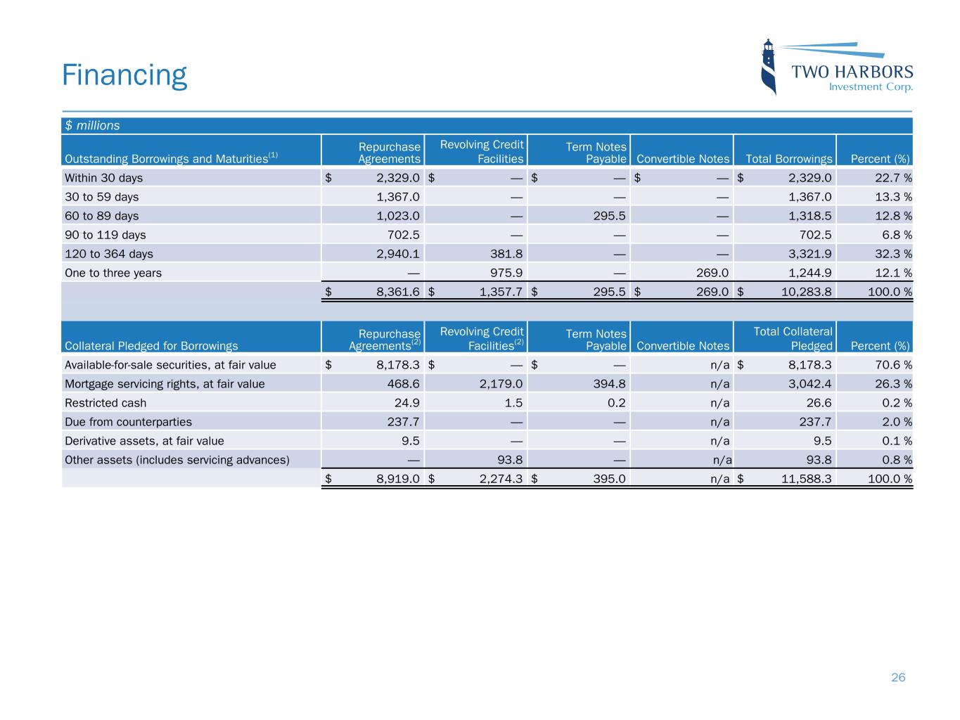 Financing $ millions Outstanding Borrowings and Maturities(1) Repurchase Agreements Revolving Credit Facilities Term Notes Payable Convertible Notes Total Borrowings Percent (%) Within 30 days $ 2,329.0 $ — $ — $ — $ 2,329.0 22.7 % 30 to 59 days 1,367.0 — — — 1,367.0 13.3 % 60 to 89 days 1,023.0 — 295.5 — 1,318.5 12.8 % 90 to 119 days 702.5 — — — 702.5 6.8 % 120 to 364 days 2,940.1 381.8 — — 3,321.9 32.3 % One to three years — 975.9 — 269.0 1,244.9 12.1 % $ 8,361.6 $ 1,357.7 $ 295.5 $ 269.0 $ 10,283.8 100.0 % Collateral Pledged for Borrowings Repurchase Agreements(2) Revolving Credit Facilities(2) Term Notes Payable Convertible Notes Total Collateral Pledged Percent (%) Available-for-sale securities, at fair value $ 8,178.3 $ — $ — n/a $ 8,178.3 70.6 % Mortgage servicing rights, at fair value 468.6 2,179.0 394.8 n/a 3,042.4 26.3 % Restricted cash 24.9 1.5 0.2 n/a 26.6 0.2 % Due from counterparties 237.7 — — n/a 237.7 2.0 % Derivative assets, at fair value 9.5 — — n/a 9.5 0.1 % Other assets (includes servicing advances) — 93.8 — n/a 93.8 0.8 % $ 8,919.0 $ 2,274.3 $ 395.0 n/a $ 11,588.3 100.0 % 26