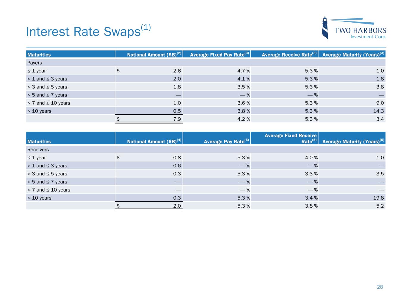Maturities Notional Amount ($B)(2) Average Fixed Pay Rate(3) Average Receive Rate(3) Average Maturity (Years)(3) Payers ≤ 1 year $ 2.6 4.7 % 5.3 % 1.0 > 1 and ≤ 3 years 2.0 4.1 % 5.3 % 1.8 > 3 and ≤ 5 years 1.8 3.5 % 5.3 % 3.8 > 5 and ≤ 7 years — — % — % — > 7 and ≤ 10 years 1.0 3.6 % 5.3 % 9.0 > 10 years 0.5 3.8 % 5.3 % 14.3 $ 7.9 4.2 % 5.3 % 3.4 Maturities Notional Amount ($B)(4) Average Pay Rate(5) Average Fixed Receive Rate(5) Average Maturity (Years)(5) Receivers ≤ 1 year $ 0.8 5.3 % 4.0 % 1.0 > 1 and ≤ 3 years 0.6 — % — % — > 3 and ≤ 5 years 0.3 5.3 % 3.3 % 3.5 > 5 and ≤ 7 years — — % — % — > 7 and ≤ 10 years — — % — % — > 10 years 0.3 5.3 % 3.4 % 19.8 $ 2.0 5.3 % 3.8 % 5.2 Interest Rate Swaps(1) 28