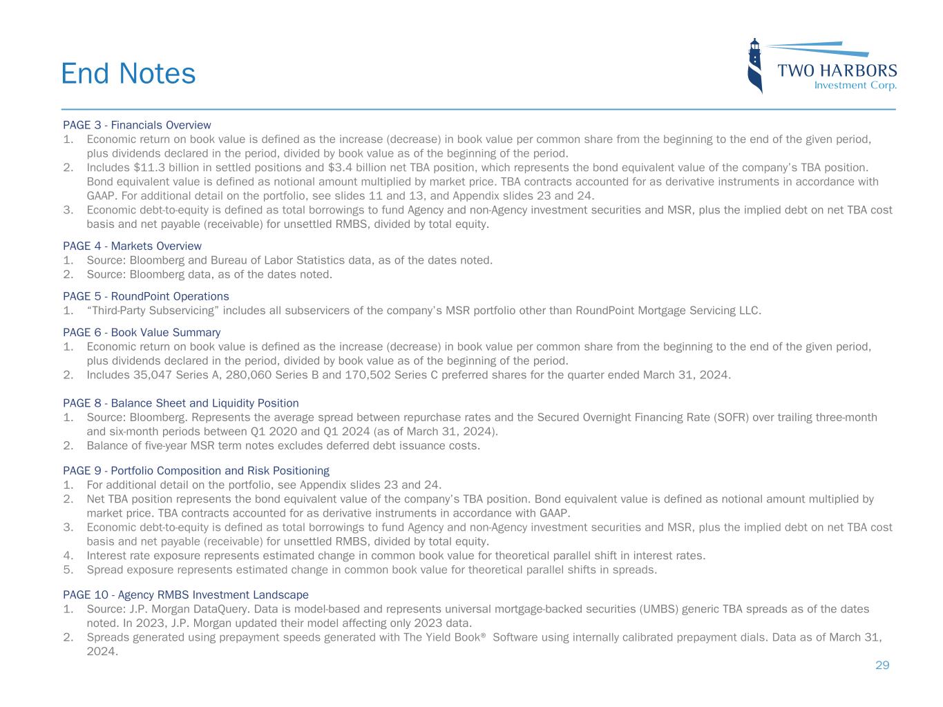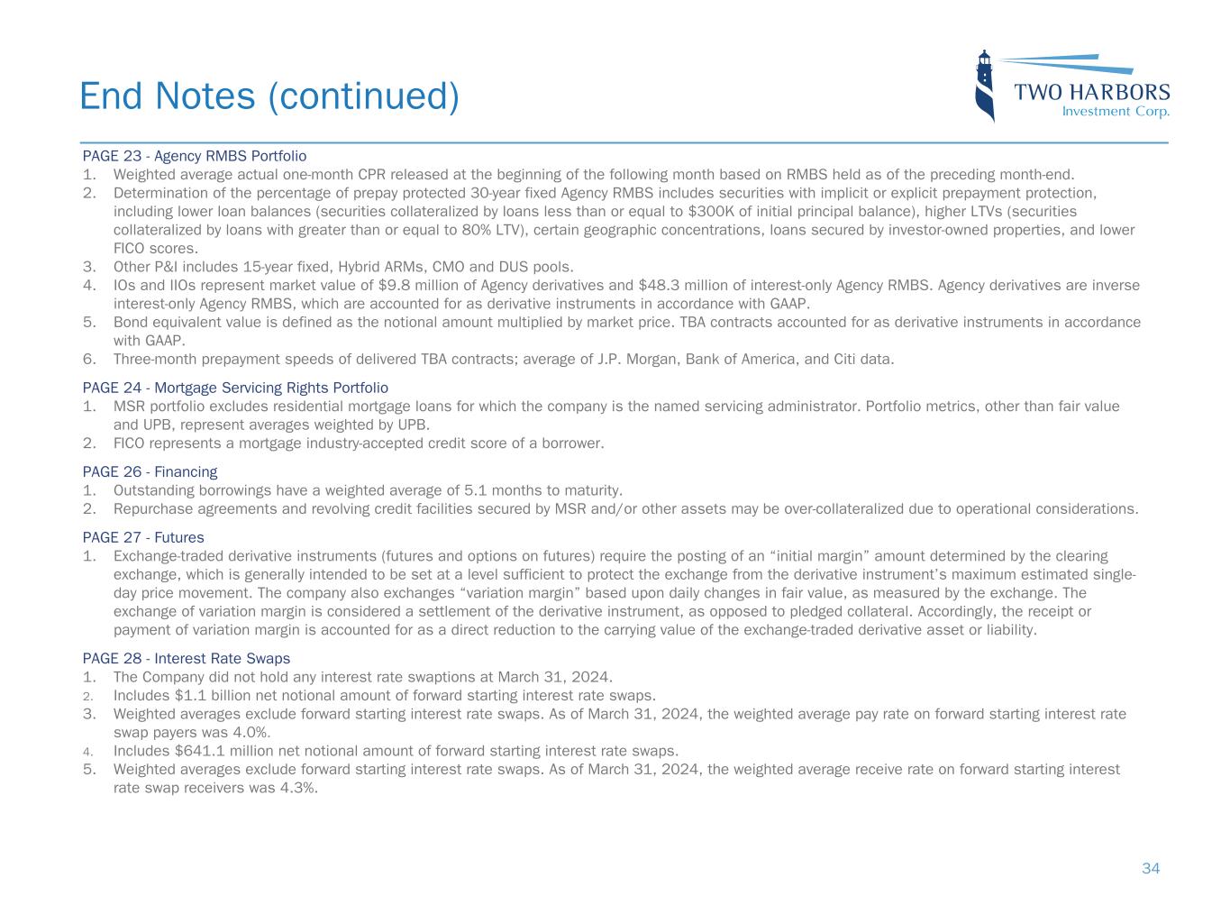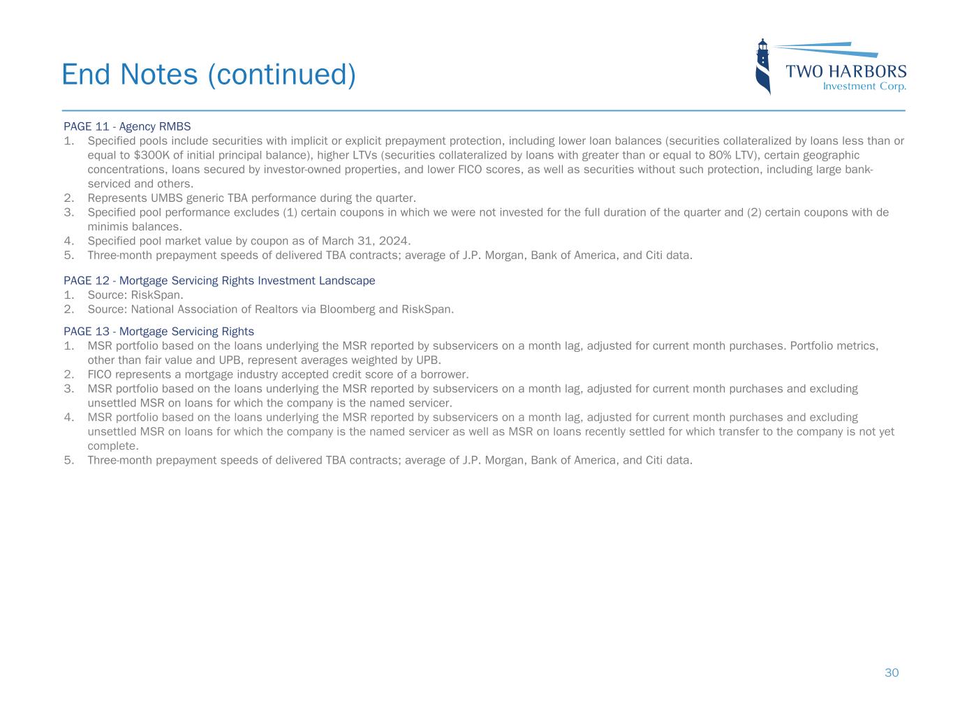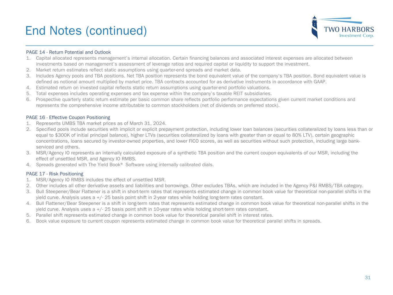 PAGE 11 - Agency RMBS 1. Specified pools include securities with implicit or explicit prepayment protection, including lower loan balances (securities collateralized by loans less than or equal to $300K of initial principal balance), higher LTVs (securities collateralized by loans with greater than or equal to 80% LTV), certain geographic concentrations, loans secured by investor-owned properties, and lower FICO scores, as well as securities without such protection, including large bank- serviced and others. 2. Represents UMBS generic TBA performance during the quarter. 3. Specified pool performance excludes (1) certain coupons in which we were not invested for the full duration of the quarter and (2) certain coupons with de minimis balances. 4. Specified pool market value by coupon as of March 31, 2024. 5. Three-month prepayment speeds of delivered TBA contracts; average of J.P. Morgan, Bank of America, and Citi data. PAGE 12 - Mortgage Servicing Rights Investment Landscape 1. Source: RiskSpan. 2. Source: National Association of Realtors via Bloomberg and RiskSpan. PAGE 13 - Mortgage Servicing Rights 1. MSR portfolio based on the loans underlying the MSR reported by subservicers on a month lag, adjusted for current month purchases. Portfolio metrics, other than fair value and UPB, represent averages weighted by UPB. 2. FICO represents a mortgage industry accepted credit score of a borrower. 3. MSR portfolio based on the loans underlying the MSR reported by subservicers on a month lag, adjusted for current month purchases and excluding unsettled MSR on loans for which the company is the named servicer. 4. MSR portfolio based on the loans underlying the MSR reported by subservicers on a month lag, adjusted for current month purchases and excluding unsettled MSR on loans for which the company is the named servicer as well as MSR on loans recently settled for which transfer to the company is not yet complete. 5. Three-month prepayment speeds of delivered TBA contracts; average of J.P. Morgan, Bank of America, and Citi data. End Notes (continued) 30