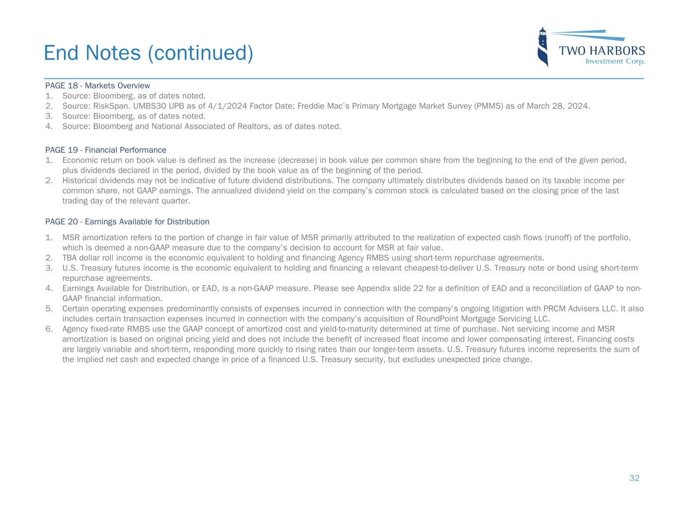 End Notes (continued) PAGE 14 - Return Potential and Outlook 1. Capital allocated represents management’s internal allocation. Certain financing balances and associated interest expenses are allocated between investments based on management’s assessment of leverage ratios and required capital or liquidity to support the investment. 2. Market return estimates reflect static assumptions using quarter-end spreads and market data. 3. Includes Agency pools and TBA positions. Net TBA position represents the bond equivalent value of the company’s TBA position. Bond equivalent value is defined as notional amount multiplied by market price. TBA contracts accounted for as derivative instruments in accordance with GAAP. 4. Estimated return on invested capital reflects static return assumptions using quarter-end portfolio valuations. 5. Total expenses includes operating expenses and tax expense within the company’s taxable REIT subsidiaries. 6. Prospective quarterly static return estimate per basic common share reflects portfolio performance expectations given current market conditions and represents the comprehensive income attributable to common stockholders (net of dividends on preferred stock). PAGE 16 - Effective Coupon Positioning 1. Represents UMBS TBA market prices as of March 31, 2024. 2. Specified pools include securities with implicit or explicit prepayment protection, including lower loan balances (securities collateralized by loans less than or equal to $300K of initial principal balance), higher LTVs (securities collateralized by loans with greater than or equal to 80% LTV), certain geographic concentrations, loans secured by investor-owned properties, and lower FICO scores, as well as securities without such protection, including large bank- serviced and others. 3. MSR/Agency IO represents an internally calculated exposure of a synthetic TBA position and the current coupon equivalents of our MSR, including the effect of unsettled MSR, and Agency IO RMBS. 4. Spreads generated with The Yield Book® Software using internally calibrated dials. PAGE 17 - Risk Positioning 1. MSR/Agency IO RMBS includes the effect of unsettled MSR. 2. Other includes all other derivative assets and liabilities and borrowings. Other excludes TBAs, which are included in the Agency P&I RMBS/TBA category. 3. Bull Steepener/Bear Flattener is a shift in short-term rates that represents estimated change in common book value for theoretical non-parallel shifts in the yield curve. Analysis uses a +/- 25 basis point shift in 2-year rates while holding long-term rates constant. 4. Bull Flattener/Bear Steepener is a shift in long-term rates that represents estimated change in common book value for theoretical non-parallel shifts in the yield curve. Analysis uses a +/- 25 basis point shift in 10-year rates while holding short-term rates constant. 5. Parallel shift represents estimated change in common book value for theoretical parallel shift in interest rates. 6. Book value exposure to current coupon represents estimated change in common book value for theoretical parallel shifts in spreads. 31