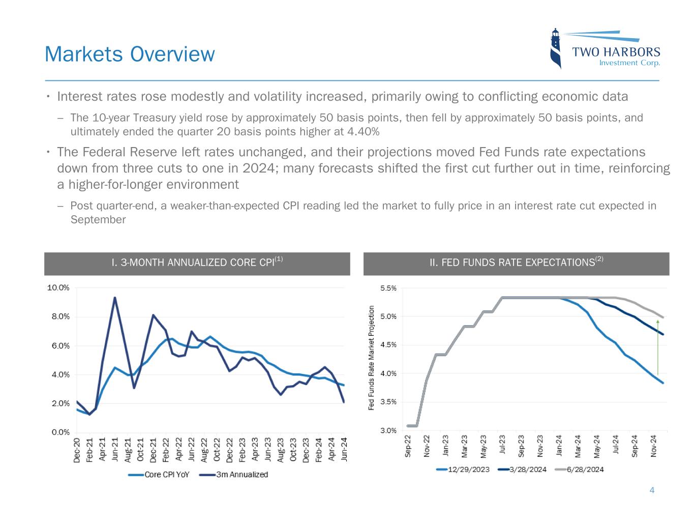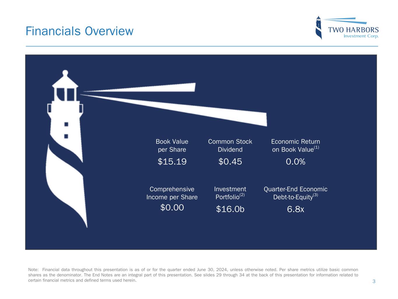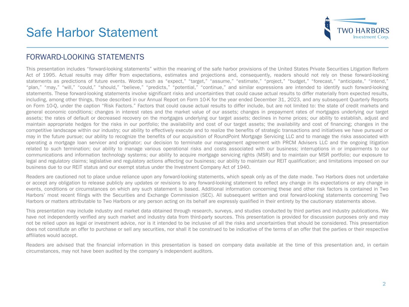 Safe Harbor Statement 2 FORWARD-LOOKING STATEMENTS This presentation includes “forward-looking statements” within the meaning of the safe harbor provisions of the United States Private Securities Litigation Reform Act of 1995. Actual results may differ from expectations, estimates and projections and, consequently, readers should not rely on these forward-looking statements as predictions of future events. Words such as “expect,” “target,” “assume,” “estimate,” “project,” “budget,” “forecast,” “anticipate,” “intend,” “plan,” “may,” “will,” “could,” “should,” “believe,” “predicts,” “potential,” “continue,” and similar expressions are intended to identify such forward-looking statements. These forward-looking statements involve significant risks and uncertainties that could cause actual results to differ materially from expected results, including, among other things, those described in our Annual Report on Form 10-K for the year ended December 31, 2023, and any subsequent Quarterly Reports on Form 10-Q, under the caption “Risk Factors.” Factors that could cause actual results to differ include, but are not limited to: the state of credit markets and general economic conditions; changes in interest rates and the market value of our assets; changes in prepayment rates of mortgages underlying our target assets; the rates of default or decreased recovery on the mortgages underlying our target assets; declines in home prices; our ability to establish, adjust and maintain appropriate hedges for the risks in our portfolio; the availability and cost of our target assets; the availability and cost of financing; changes in the competitive landscape within our industry; our ability to effectively execute and to realize the benefits of strategic transactions and initiatives we have pursued or may in the future pursue; our ability to recognize the benefits of our acquisition of RoundPoint Mortgage Servicing LLC and to manage the risks associated with operating a mortgage loan servicer and originator; our decision to terminate our management agreement with PRCM Advisers LLC and the ongoing litigation related to such termination; our ability to manage various operational risks and costs associated with our business; interruptions in or impairments to our communications and information technology systems; our ability to acquire mortgage servicing rights (MSR) and to maintain our MSR portfolio; our exposure to legal and regulatory claims; legislative and regulatory actions affecting our business; our ability to maintain our REIT qualification; and limitations imposed on our business due to our REIT status and our exempt status under the Investment Company Act of 1940. Readers are cautioned not to place undue reliance upon any forward-looking statements, which speak only as of the date made. Two Harbors does not undertake or accept any obligation to release publicly any updates or revisions to any forward-looking statement to reflect any change in its expectations or any change in events, conditions or circumstances on which any such statement is based. Additional information concerning these and other risk factors is contained in Two Harbors’ most recent filings with the Securities and Exchange Commission (SEC). All subsequent written and oral forward-looking statements concerning Two Harbors or matters attributable to Two Harbors or any person acting on its behalf are expressly qualified in their entirety by the cautionary statements above. This presentation may include industry and market data obtained through research, surveys, and studies conducted by third parties and industry publications. We have not independently verified any such market and industry data from third-party sources. This presentation is provided for discussion purposes only and may not be relied upon as legal or investment advice, nor is it intended to be inclusive of all the risks and uncertainties that should be considered. This presentation does not constitute an offer to purchase or sell any securities, nor shall it be construed to be indicative of the terms of an offer that the parties or their respective affiliates would accept. Readers are advised that the financial information in this presentation is based on company data available at the time of this presentation and, in certain circumstances, may not have been audited by the company’s independent auditors.