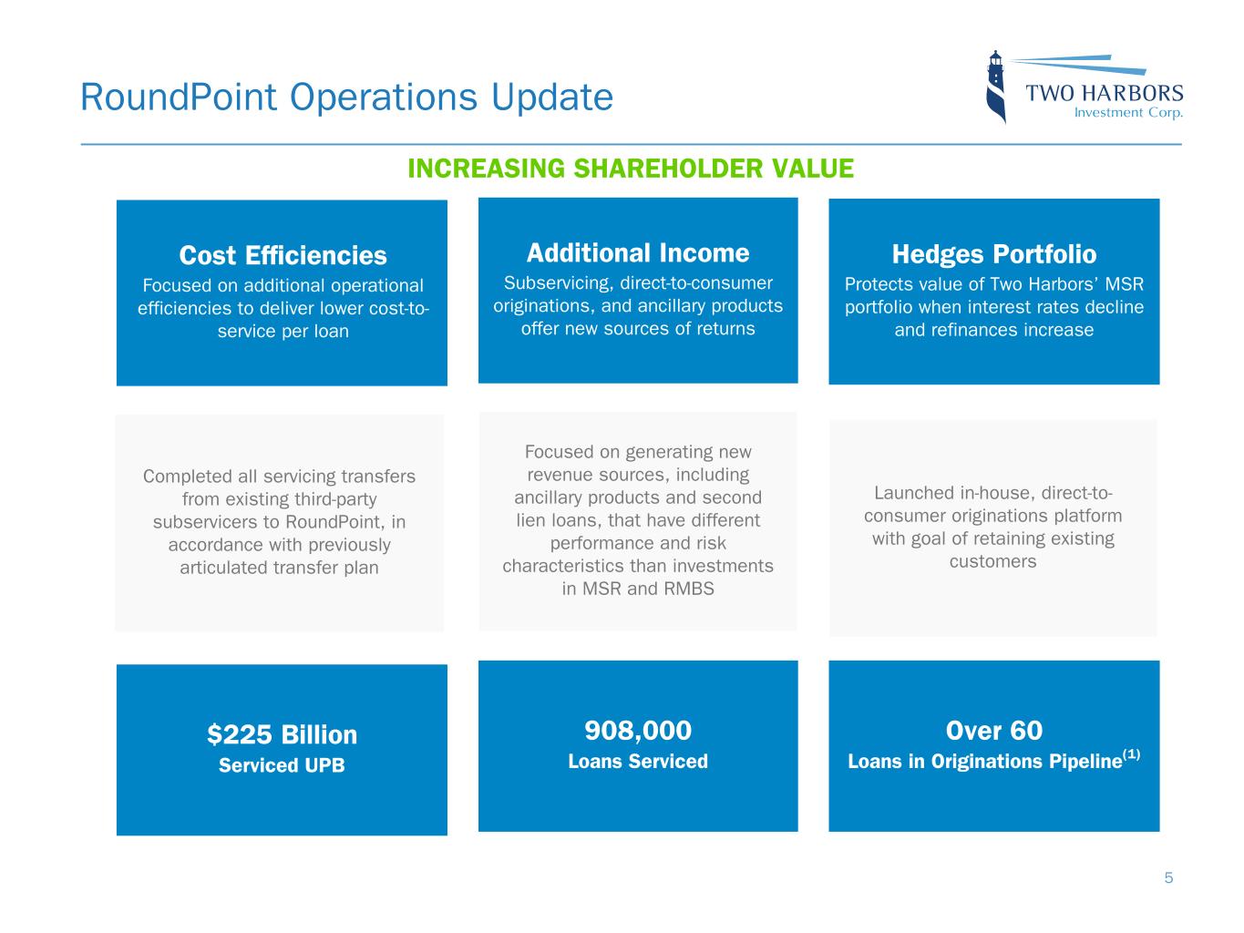 RoundPoint Operations Update Over 60 Loans in Originations Pipeline(1) $225 Billion Serviced UPB 908,000 Loans Serviced Completed all servicing transfers from existing third-party subservicers to RoundPoint, in accordance with previously articulated transfer plan Launched in-house, direct-to- consumer originations platform with goal of retaining existing customers Focused on generating new revenue sources, including ancillary products and second lien loans, that have different performance and risk characteristics than investments in MSR and RMBS INCREASING SHAREHOLDER VALUE 5 Hedges Portfolio Protects value of Two Harbors’ MSR portfolio when interest rates decline and refinances increase Cost Efficiencies Focused on additional operational efficiencies to deliver lower cost-to- service per loan Additional Income Subservicing, direct-to-consumer originations, and ancillary products offer new sources of returns