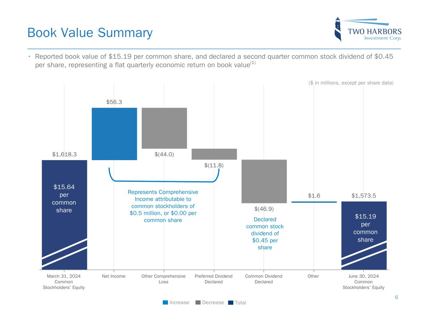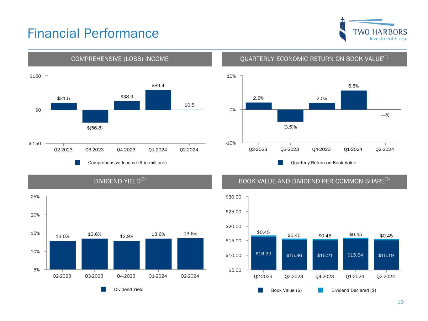 $31.5 $(56.8) $38.9 $89.4 $0.5 Comprehensive Income ($ in millions) Q2-2023 Q3-2023 Q4-2023 Q1-2024 Q2-2024 $-150 $0 $150 $16.39 $15.36 $15.21 $15.64 $15.19 $0.45 $0.45 $0.45 $0.45 $0.45 Book Value ($) Dividend Declared ($) Q2-2023 Q3-2023 Q4-2023 Q1-2024 Q2-2024 $5.00 $10.00 $15.00 $20.00 $25.00 $30.00 DIVIDEND YIELD(2) Financial Performance COMPREHENSIVE (LOSS) INCOME QUARTERLY ECONOMIC RETURN ON BOOK VALUE(1) BOOK VALUE AND DIVIDEND PER COMMON SHARE(2) 2.2% (3.5)% 2.0% 5.8% —% Quarterly Return on Book Value Q2-2023 Q3-2023 Q4-2023 Q1-2024 Q2-2024 -10% 0% 10% 13.0% 13.6% 12.9% 13.6% 13.6% Dividend Yield Q2-2023 Q3-2023 Q4-2023 Q1-2024 Q2-2024 5% 10% 15% 20% 25% 19