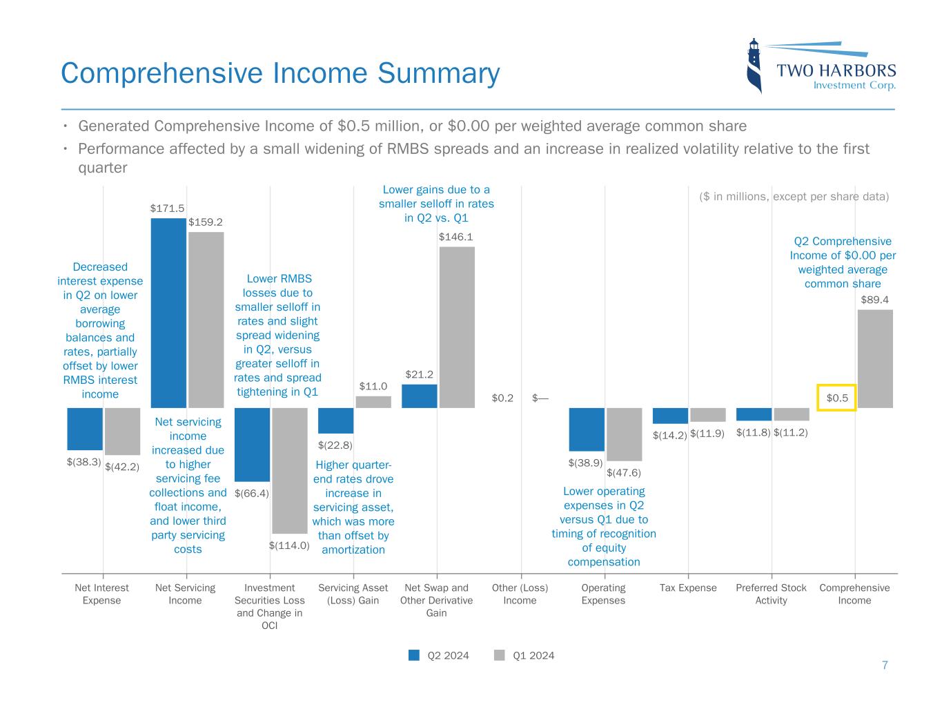$1,618.3 $56.3 $(44.0) $(11.8) $(46.9) $1.6 $1,573.5 March 31, 2024 Common Stockholders’ Equity Net Income Other Comprehensive Loss Preferred Dividend Declared Common Dividend Declared Other June 30, 2024 Common Stockholders’ Equity Book Value Summary • Reported book value of $15.19 per common share, and declared a second quarter common stock dividend of $0.45 per share, representing a flat quarterly economic return on book value(1) 6 ($ in millions, except per share data) $15.64 per common share $15.19 per common share Represents Comprehensive Income attributable to common stockholders of $0.5 million, or $0.00 per common share Declared common stock dividend of $0.45 per share Increase Decrease Total