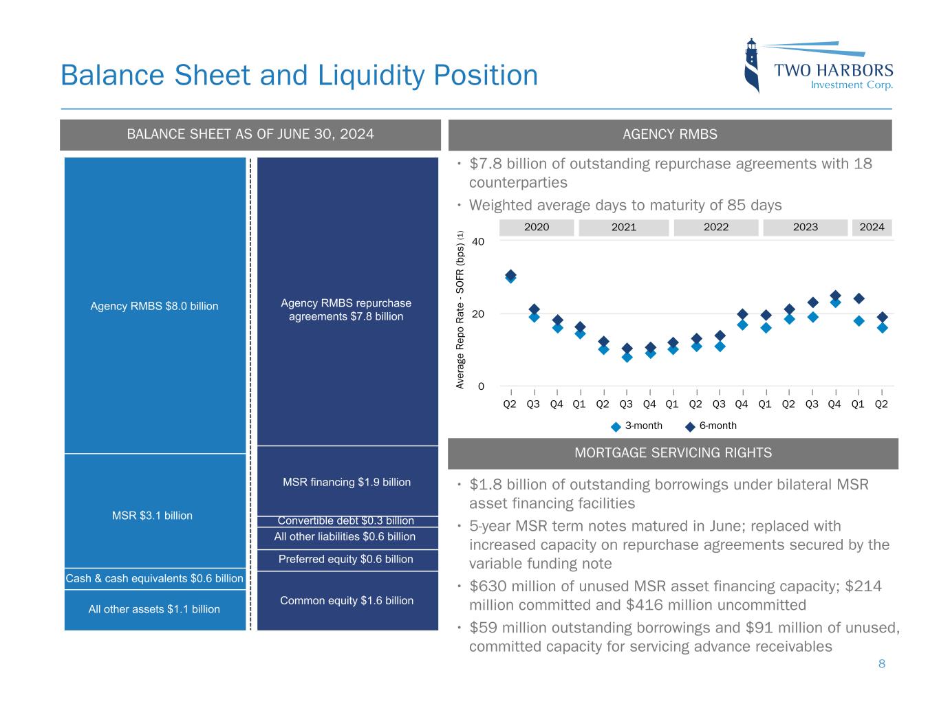 Comprehensive Income Summary 7 • Generated Comprehensive Income of $0.5 million, or $0.00 per weighted average common share • Performance affected by a small widening of RMBS spreads and an increase in realized volatility relative to the first quarter $(38.3) $171.5 $(66.4) $(22.8) $21.2 $0.2 $(38.9) $(14.2) $(11.8) $0.5 $(42.2) $159.2 $(114.0) $11.0 $146.1 $— $(47.6) $(11.9) $(11.2) $89.4 Q2 2024 Q1 2024 Net Interest Expense Net Servicing Income Investment Securities Loss and Change in OCI Servicing Asset (Loss) Gain Net Swap and Other Derivative Gain Other (Loss) Income Operating Expenses Tax Expense Preferred Stock Activity Comprehensive Income ($ in millions, except per share data) Q2 Comprehensive Income of $0.00 per weighted average common share Net servicing income increased due to higher servicing fee collections and float income, and lower third party servicing costs Decreased interest expense in Q2 on lower average borrowing balances and rates, partially offset by lower RMBS interest income Lower RMBS losses due to smaller selloff in rates and slight spread widening in Q2, versus greater selloff in rates and spread tightening in Q1 Higher quarter- end rates drove increase in servicing asset, which was more than offset by amortization Lower gains due to a smaller selloff in rates in Q2 vs. Q1 Lower operating expenses in Q2 versus Q1 due to timing of recognition of equity compensation