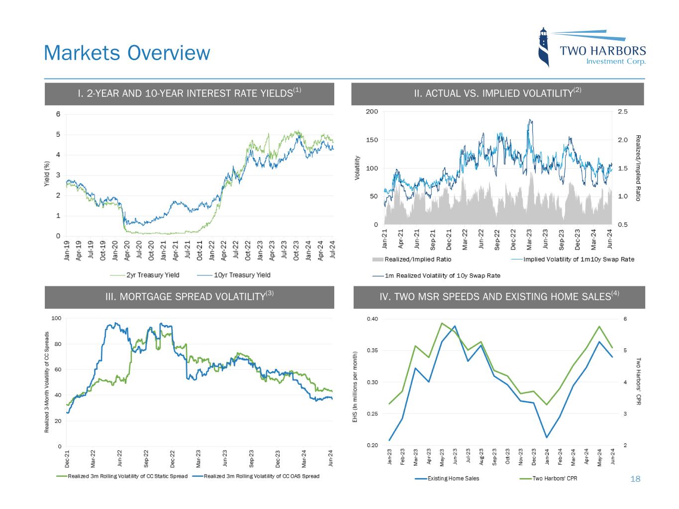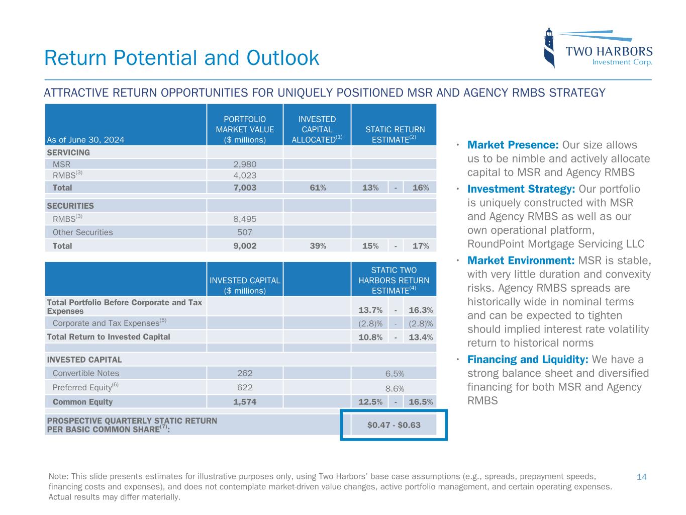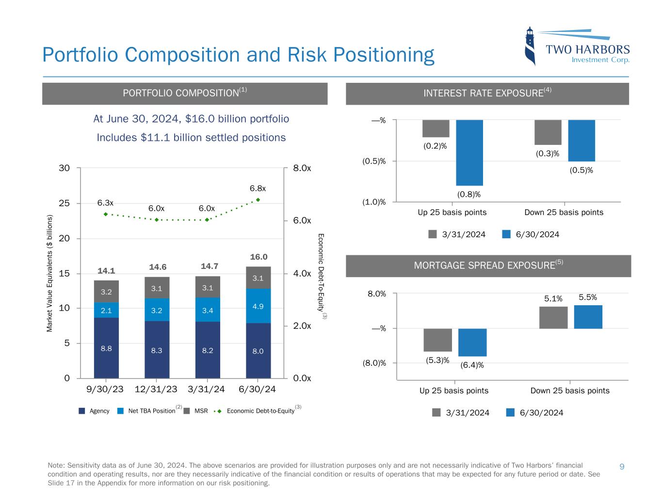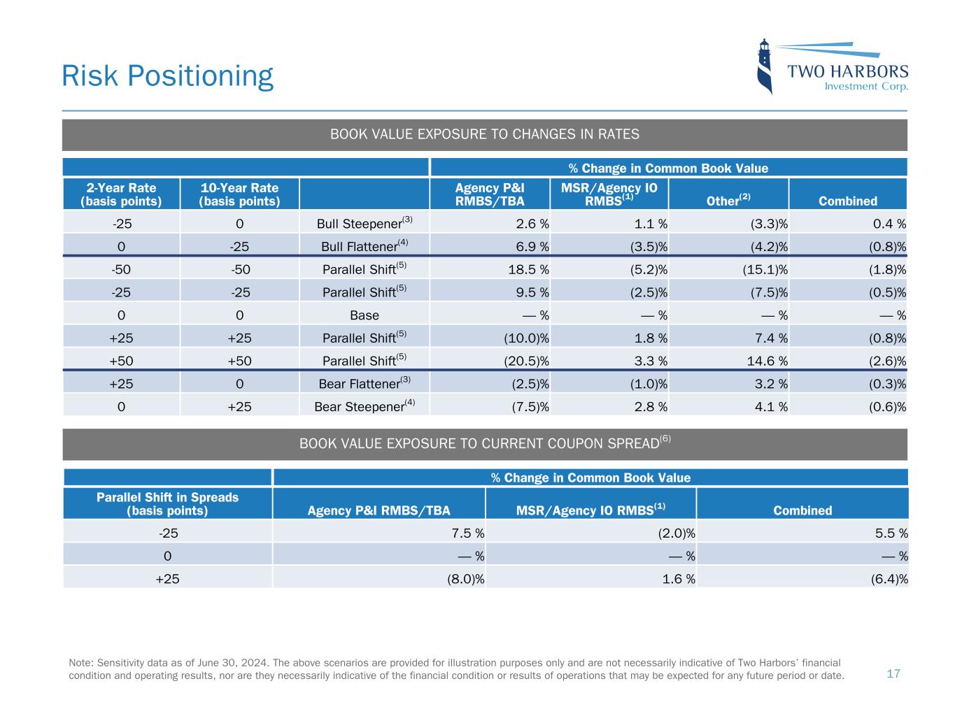 Note: Sensitivity data as of June 30, 2024. The above scenarios are provided for illustration purposes only and are not necessarily indicative of Two Harbors’ financial condition and operating results, nor are they necessarily indicative of the financial condition or results of operations that may be expected for any future period or date. Risk Positioning BOOK VALUE EXPOSURE TO CHANGES IN RATES % Change in Common Book Value 2-Year Rate (basis points) 10-Year Rate (basis points) Agency P&I RMBS/TBA MSR/Agency IO RMBS(1) Other(2) Combined -25 0 Bull Steepener(3) 2.6 % 1.1 % (3.3) % 0.4 % 0 -25 Bull Flattener(4) 6.9 % (3.5) % (4.2) % (0.8) % -50 -50 Parallel Shift(5) 18.5 % (5.2) % (15.1) % (1.8) % -25 -25 Parallel Shift(5) 9.5 % (2.5) % (7.5) % (0.5) % 0 0 Base — % — % — % — % +25 +25 Parallel Shift(5) (10.0) % 1.8 % 7.4 % (0.8) % +50 +50 Parallel Shift(5) (20.5) % 3.3 % 14.6 % (2.6) % +25 0 Bear Flattener(3) (2.5) % (1.0) % 3.2 % (0.3) % 0 +25 Bear Steepener(4) (7.5) % 2.8 % 4.1 % (0.6) % BOOK VALUE EXPOSURE TO CURRENT COUPON SPREAD(6) % Change in Common Book Value Parallel Shift in Spreads (basis points) Agency P&I RMBS/TBA MSR/Agency IO RMBS(1) Combined -25 7.5 % (2.0) % 5.5 % 0 — % — % — % +25 (8.0) % 1.6 % (6.4) % 17