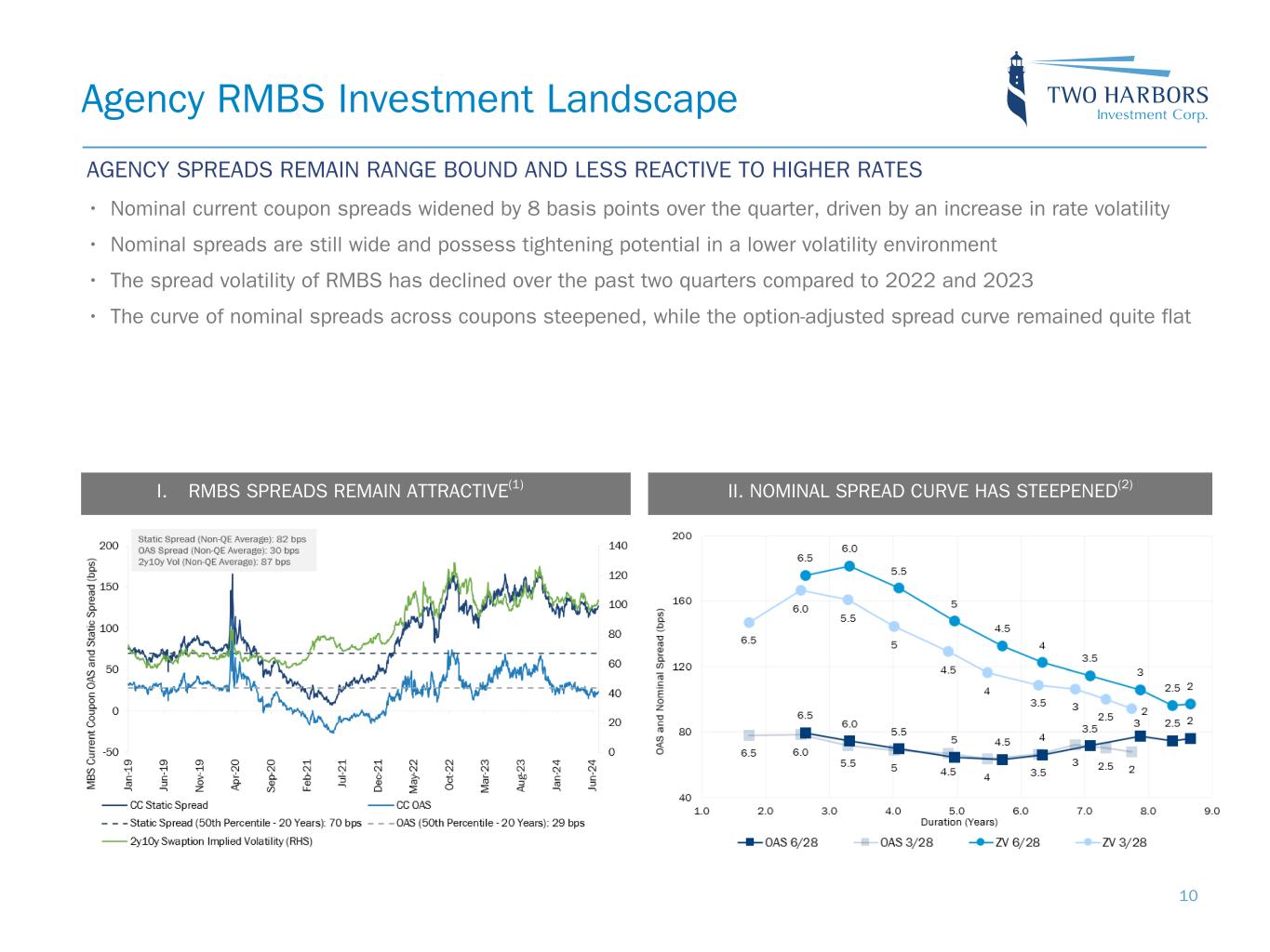 Portfolio Composition and Risk Positioning At June 30, 2024, $16.0 billion portfolio Includes $11.1 billion settled positions PORTFOLIO COMPOSITION(1) M ar ke t Va lu e Eq ui va le nt s ($ b ill io ns ) Econom ic D ebt-To-Equity 8.8 8.3 8.2 8.0 2.1 3.2 3.4 4.9 3.2 3.1 3.1 3.1 6.3x 6.0x 6.0x 6.8x Agency Net TBA Position MSR Economic Debt-to-Equity 9/30/23 12/31/23 3/31/24 6/30/24 0 5 10 15 20 25 30 0.0x 2.0x 4.0x 6.0x 8.0x (3) (3 ) (2) 16.0 14.714.1 14.6 9Note: Sensitivity data as of June 30, 2024. The above scenarios are provided for illustration purposes only and are not necessarily indicative of Two Harbors’ financial condition and operating results, nor are they necessarily indicative of the financial condition or results of operations that may be expected for any future period or date. See Slide 17 in the Appendix for more information on our risk positioning. (0.2)% (0.3)% (0.8)% (0.5)% 3/31/2024 6/30/2024 Up 25 basis points Down 25 basis points (1.0)% (0.5)% —% (5.3)% 5.1% (6.4)% 5.5% 3/31/2024 6/30/2024 Up 25 basis points Down 25 basis points (8.0)% —% 8.0% INTEREST RATE EXPOSURE(4) MORTGAGE SPREAD EXPOSURE(5)