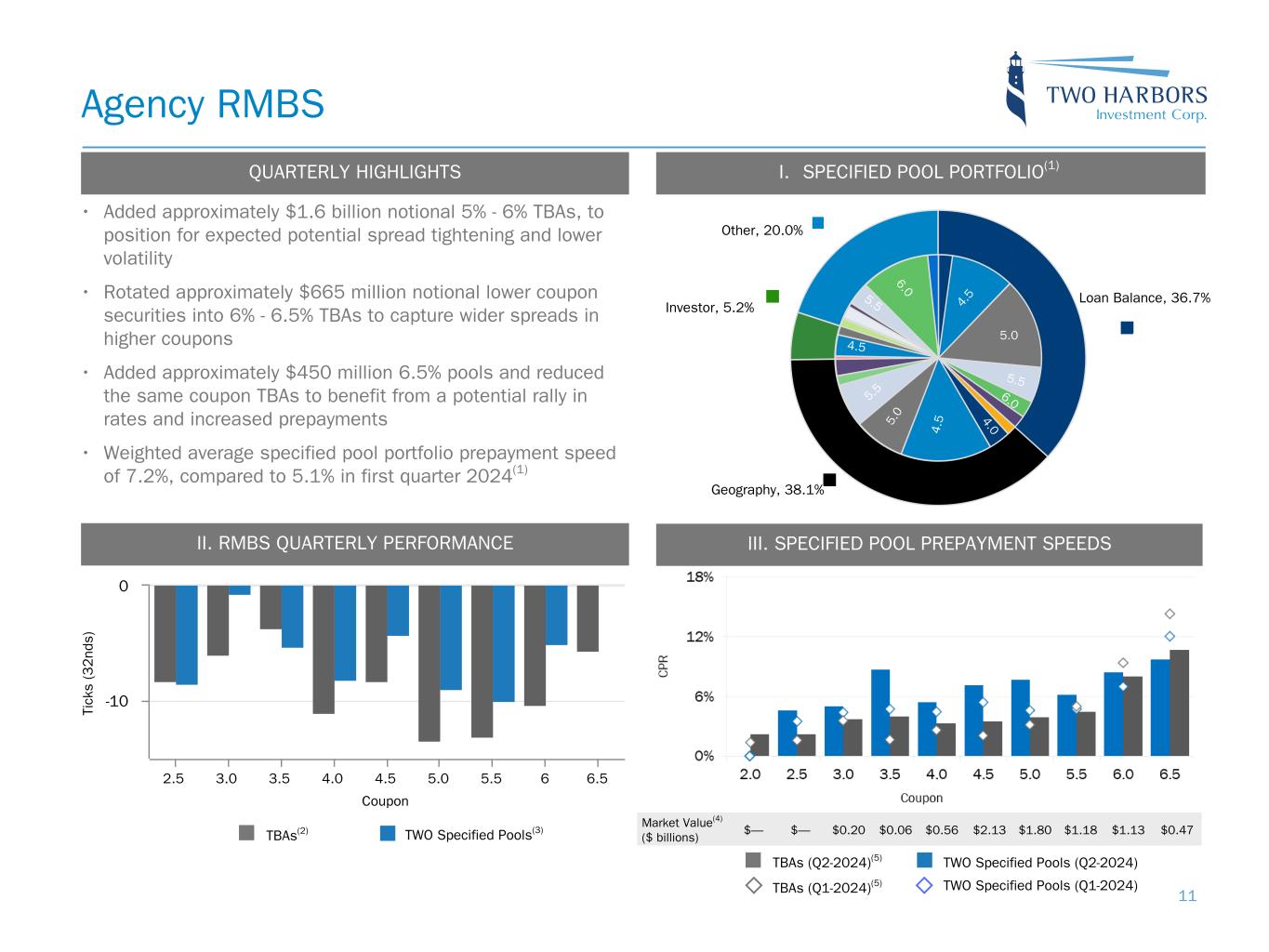 Loan Balance, 36.7% Geography, 38.1% Investor, 5.2% Other, 20.0% II. RMBS QUARTERLY PERFORMANCE Coupon Ti ck s (3 2 nd s) 2.5 3.0 3.5 4.0 4.5 5.0 5.5 6 6.5 -10 0 Agency RMBS I. SPECIFIED POOL PORTFOLIO(1) III. SPECIFIED POOL PREPAYMENT SPEEDS TWO Specified Pools(3)TBAs(2) TWO Specified Pools (Q2-2024)TBAs (Q2-2024)(5) TBAs (Q1-2024)(5) TWO Specified Pools (Q1-2024) Market Value(4) ($ billions) $— $— $0.20 $0.06 $0.56 $2.13 $1.80 $1.18 $1.13 $0.47 QUARTERLY HIGHLIGHTS • Added approximately $1.6 billion notional 5% - 6% TBAs, to position for expected potential spread tightening and lower volatility • Rotated approximately $665 million notional lower coupon securities into 6% - 6.5% TBAs to capture wider spreads in higher coupons • Added approximately $450 million 6.5% pools and reduced the same coupon TBAs to benefit from a potential rally in rates and increased prepayments • Weighted average specified pool portfolio prepayment speed of 7.2%, compared to 5.1% in first quarter 2024(1) 5.5 4. 5 5.0 4.04. 55. 0 5. 5 6.0 11 6.0 5.5 4.5