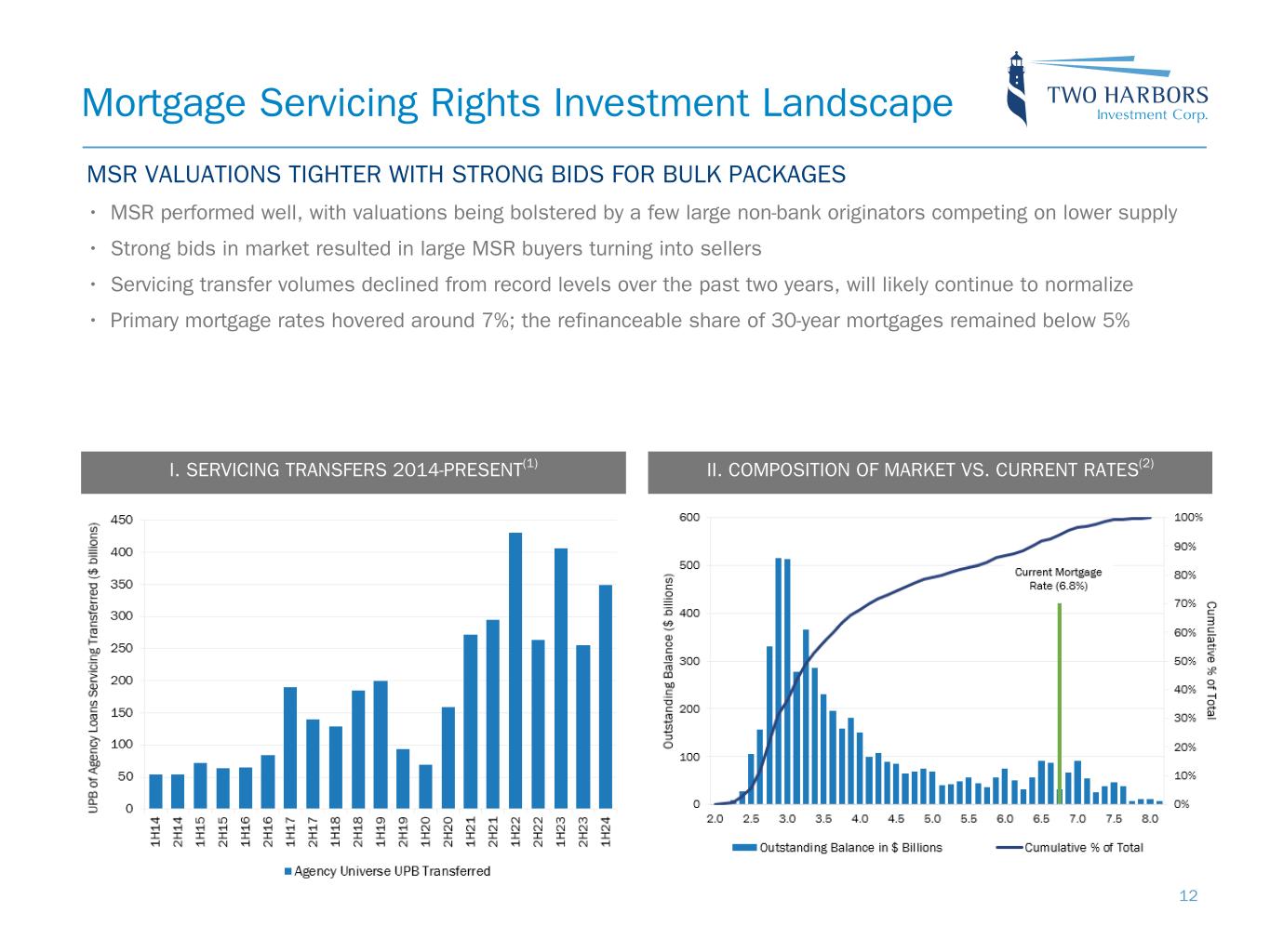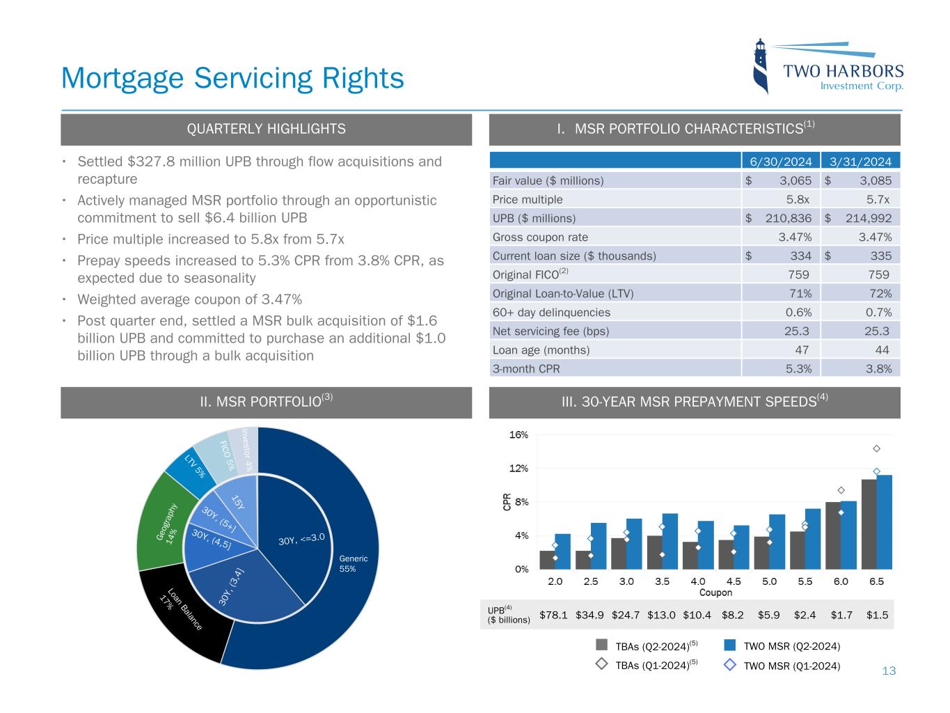 UPB(4) ($ billions) $78.1 $34.9 $24.7 $13.0 $10.4 $8.2 $5.9 $2.4 $1.7 $1.5 • Settled $327.8 million UPB through flow acquisitions and recapture • Actively managed MSR portfolio through an opportunistic commitment to sell $6.4 billion UPB • Price multiple increased to 5.8x from 5.7x • Prepay speeds increased to 5.3% CPR from 3.8% CPR, as expected due to seasonality • Weighted average coupon of 3.47% • Post quarter end, settled a MSR bulk acquisition of $1.6 billion UPB and committed to purchase an additional $1.0 billion UPB through a bulk acquisition Mortgage Servicing Rights III. 30-YEAR MSR PREPAYMENT SPEEDS(4) 6/30/2024 3/31/2024 Fair value ($ millions) $ 3,065 $ 3,085 Price multiple 5.8x 5.7x UPB ($ millions) $ 210,836 $ 214,992 Gross coupon rate 3.47 % 3.47 % Current loan size ($ thousands) $ 334 $ 335 Original FICO(2) 759 759 Original Loan-to-Value (LTV) 71 % 72 % 60+ day delinquencies 0.6 % 0.7 % Net servicing fee (bps) 25.3 25.3 Loan age (months) 47 44 3-month CPR 5.3 % 3.8 % I. MSR PORTFOLIO CHARACTERISTICS(1) TWO MSR (Q2-2024)TBAs (Q2-2024)(5) TBAs (Q1-2024)(5) TWO MSR (Q1-2024) QUARTERLY HIGHLIGHTS II. MSR PORTFOLIO(3) LTV 5% FIC O 5% Investor 4 % G eo gr ap hy 14 % Generic 55% 30 Y, (3 ,4 ] 30Y, (4,5] 15Y 30Y, <=3.0 30Y, (5+] Loan Balance 17% 13