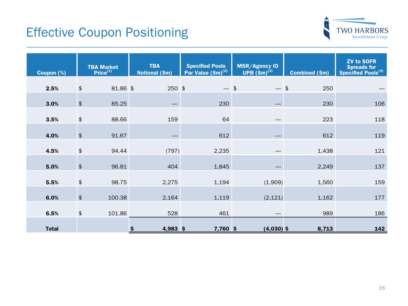 Effective Coupon Positioning Coupon (%) TBA Market Price(1) TBA Notional ($m) Specified Pools Par Value ($m)(2) MSR/Agency IO UPB ($m)(3) Combined ($m) ZV to SOFR Spreads for Specified Pools(4) 2.5% $ 81.86 $ 250 $ — $ — $ 250 — 3.0% $ 85.25 — 230 — 230 106 3.5% $ 88.66 159 64 — 223 118 4.0% $ 91.67 — 612 — 612 119 4.5% $ 94.44 (797) 2,235 — 1,438 121 5.0% $ 96.81 404 1,845 — 2,249 137 5.5% $ 98.75 2,275 1,194 (1,909) 1,560 159 6.0% $ 100.38 2,164 1,119 (2,121) 1,162 177 6.5% $ 101.86 528 461 — 989 186 Total $ 4,983 $ 7,760 $ (4,030) $ 8,713 142 16