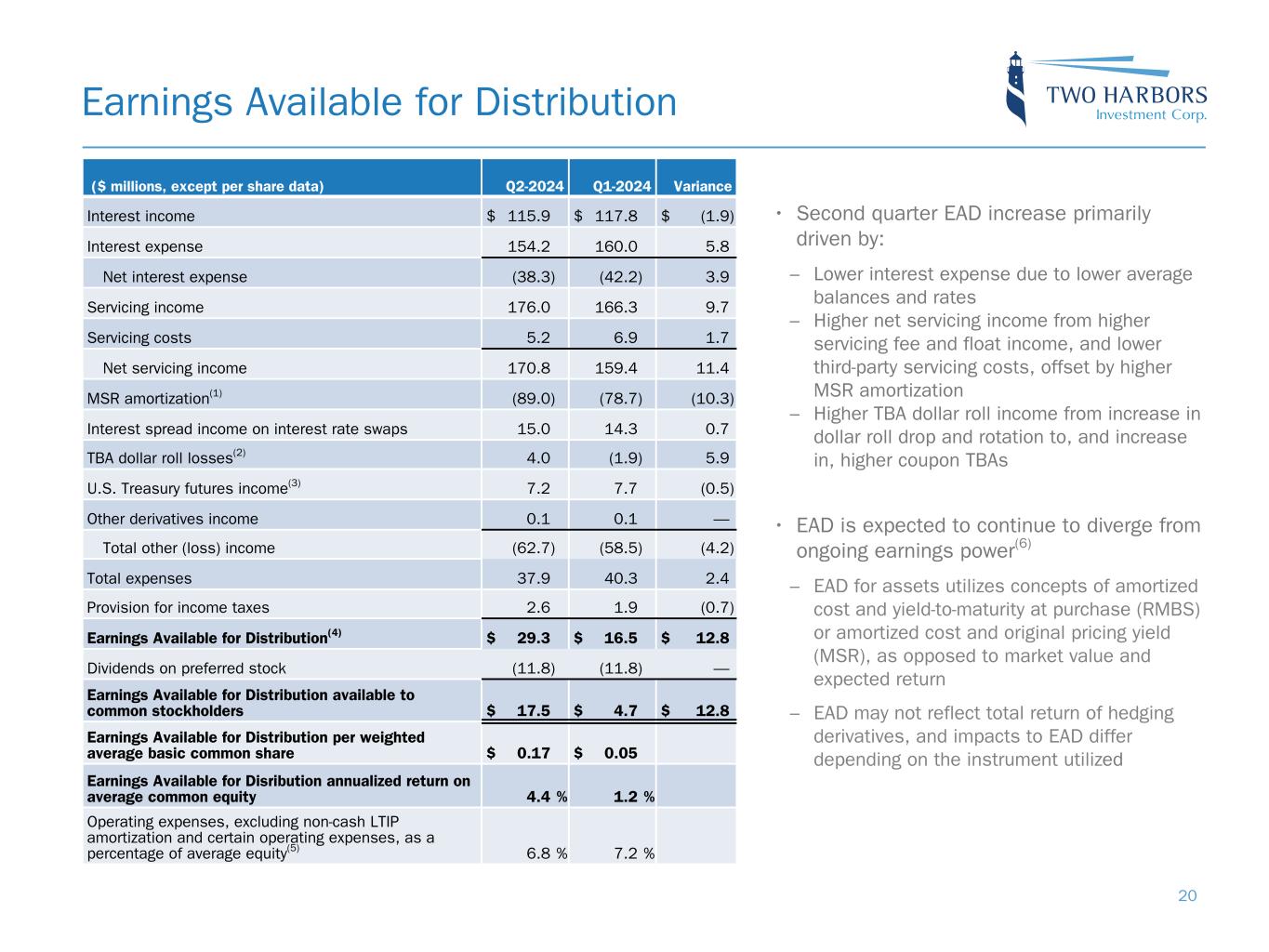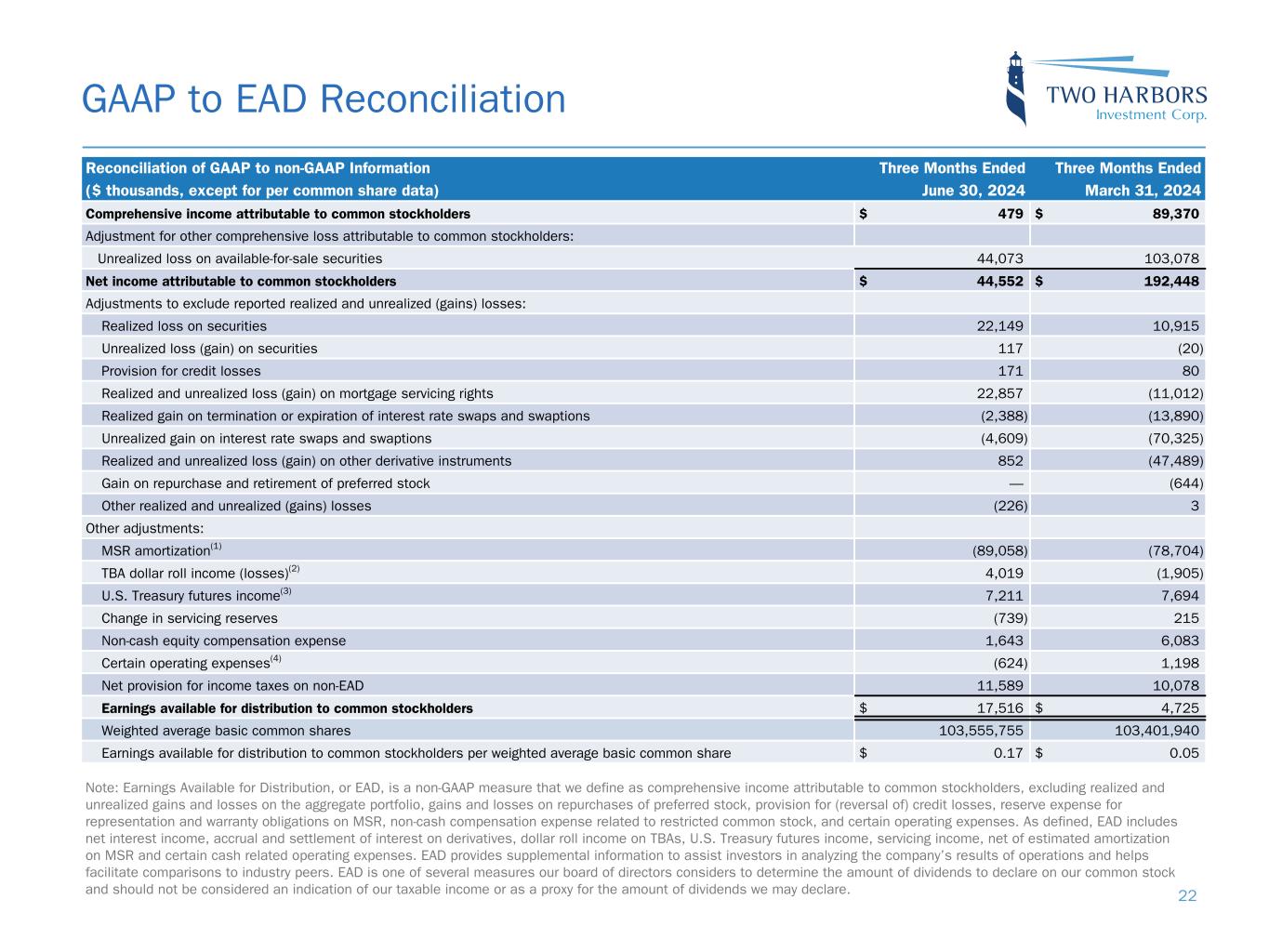 GAAP to EAD Reconciliation Reconciliation of GAAP to non-GAAP Information Three Months Ended Three Months Ended ($ thousands, except for per common share data) June 30, 2024 March 31, 2024 Comprehensive income attributable to common stockholders $ 479 $ 89,370 Adjustment for other comprehensive loss attributable to common stockholders: Unrealized loss on available-for-sale securities 44,073 103,078 Net income attributable to common stockholders $ 44,552 $ 192,448 Adjustments to exclude reported realized and unrealized (gains) losses: Realized loss on securities 22,149 10,915 Unrealized loss (gain) on securities 117 (20) Provision for credit losses 171 80 Realized and unrealized loss (gain) on mortgage servicing rights 22,857 (11,012) Realized gain on termination or expiration of interest rate swaps and swaptions (2,388) (13,890) Unrealized gain on interest rate swaps and swaptions (4,609) (70,325) Realized and unrealized loss (gain) on other derivative instruments 852 (47,489) Gain on repurchase and retirement of preferred stock — (644) Other realized and unrealized (gains) losses (226) 3 Other adjustments: MSR amortization(1) (89,058) (78,704) TBA dollar roll income (losses)(2) 4,019 (1,905) U.S. Treasury futures income(3) 7,211 7,694 Change in servicing reserves (739) 215 Non-cash equity compensation expense 1,643 6,083 Certain operating expenses(4) (624) 1,198 Net provision for income taxes on non-EAD 11,589 10,078 Earnings available for distribution to common stockholders $ 17,516 $ 4,725 Weighted average basic common shares 103,555,755 103,401,940 Earnings available for distribution to common stockholders per weighted average basic common share $ 0.17 $ 0.05 Note: Earnings Available for Distribution, or EAD, is a non-GAAP measure that we define as comprehensive income attributable to common stockholders, excluding realized and unrealized gains and losses on the aggregate portfolio, gains and losses on repurchases of preferred stock, provision for (reversal of) credit losses, reserve expense for representation and warranty obligations on MSR, non-cash compensation expense related to restricted common stock, and certain operating expenses. As defined, EAD includes net interest income, accrual and settlement of interest on derivatives, dollar roll income on TBAs, U.S. Treasury futures income, servicing income, net of estimated amortization on MSR and certain cash related operating expenses. EAD provides supplemental information to assist investors in analyzing the company’s results of operations and helps facilitate comparisons to industry peers. EAD is one of several measures our board of directors considers to determine the amount of dividends to declare on our common stock and should not be considered an indication of our taxable income or as a proxy for the amount of dividends we may declare. 22