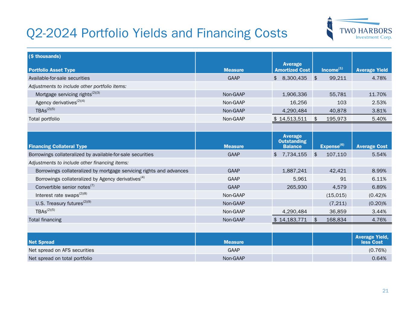 Q2-2024 Portfolio Yields and Financing Costs ($ thousands) Portfolio Asset Type Measure Average Amortized Cost Income(1) Average Yield Available-for-sale securities GAAP $ 8,300,435 $ 99,211 4.78% Adjustments to include other portfolio items: Mortgage servicing rights(2)(3) Non-GAAP 1,906,336 55,781 11.70% Agency derivatives(2)(4) Non-GAAP 16,256 103 2.53 % TBAs(2)(5) Non-GAAP 4,290,484 40,878 3.81 % Total portfolio Non-GAAP $ 14,513,511 $ 195,973 5.40% Financing Collateral Type Measure Average Outstanding Balance Expense(6) Average Cost Borrowings collateralized by available-for-sale securities GAAP $ 7,734,155 $ 107,110 5.54% Adjustments to include other financing items: Borrowings collateralized by mortgage servicing rights and advances GAAP 1,887,241 42,421 8.99 % Borrowings collateralized by Agency derivatives(4) GAAP 5,961 91 6.11 % Convertible senior notes(7) GAAP 265,930 4,579 6.89 % Interest rate swaps(2)(8) Non-GAAP (15,015) (0.42) % U.S. Treasury futures(2)(9) Non-GAAP (7,211) (0.20) % TBAs(2)(5) Non-GAAP 4,290,484 36,859 3.44 % Total financing Non-GAAP $ 14,183,771 $ 168,834 4.76 % Net Spread Measure Average Yield, less Cost Net spread on AFS securities GAAP (0.76%) Net spread on total portfolio Non-GAAP 0.64% 21