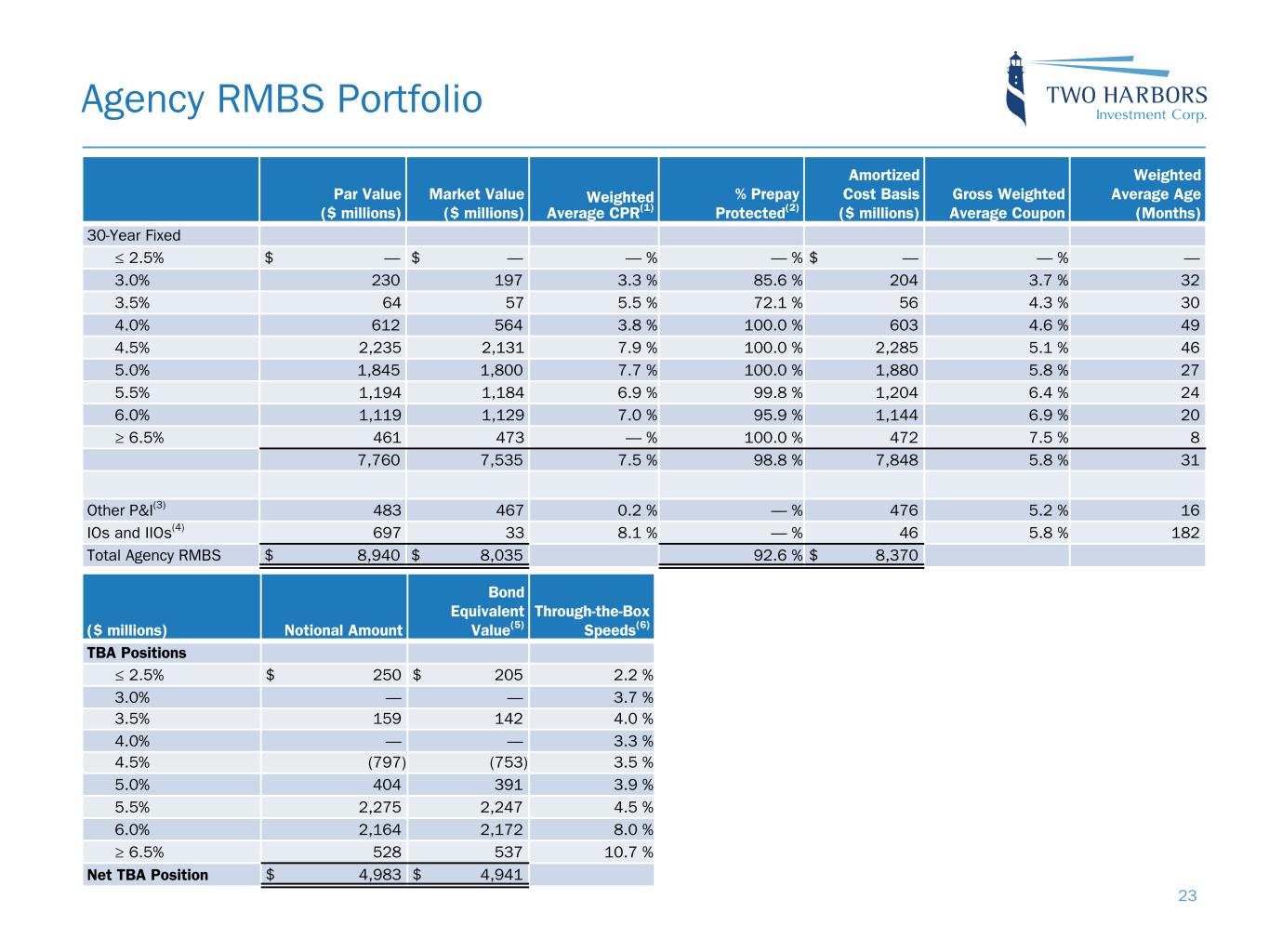 Agency RMBS Portfolio Par Value ($ millions) Market Value ($ millions) Weighted Average CPR(1) % Prepay Protected(2) Amortized Cost Basis ($ millions) Gross Weighted Average Coupon Weighted Average Age (Months) 30-Year Fixed ≤ 2.5% $ — $ — — % — % $ — — % — 3.0% 230 197 3.3 % 85.6 % 204 3.7 % 32 3.5% 64 57 5.5 % 72.1 % 56 4.3 % 30 4.0% 612 564 3.8 % 100.0 % 603 4.6 % 49 4.5% 2,235 2,131 7.9 % 100.0 % 2,285 5.1 % 46 5.0% 1,845 1,800 7.7 % 100.0 % 1,880 5.8 % 27 5.5% 1,194 1,184 6.9 % 99.8 % 1,204 6.4 % 24 6.0% 1,119 1,129 7.0 % 95.9 % 1,144 6.9 % 20 ≥ 6.5% 461 473 — % 100.0 % 472 7.5 % 8 7,760 7,535 7.5 % 98.8 % 7,848 5.8 % 31 Other P&I(3) 483 467 0.2 % — % 476 5.2 % 16 IOs and IIOs(4) 697 33 8.1 % — % 46 5.8 % 182 Total Agency RMBS $ 8,940 $ 8,035 92.6 % $ 8,370 ($ millions) Notional Amount Bond Equivalent Value(5) Through-the-Box Speeds(6) TBA Positions ≤ 2.5% $ 250 $ 205 2.2 % 3.0% — — 3.7 % 3.5% 159 142 4.0 % 4.0% — — 3.3 % 4.5% (797) (753) 3.5 % 5.0% 404 391 3.9 % 5.5% 2,275 2,247 4.5 % 6.0% 2,164 2,172 8.0 % ≥ 6.5% 528 537 10.7 % Net TBA Position $ 4,983 $ 4,941 23