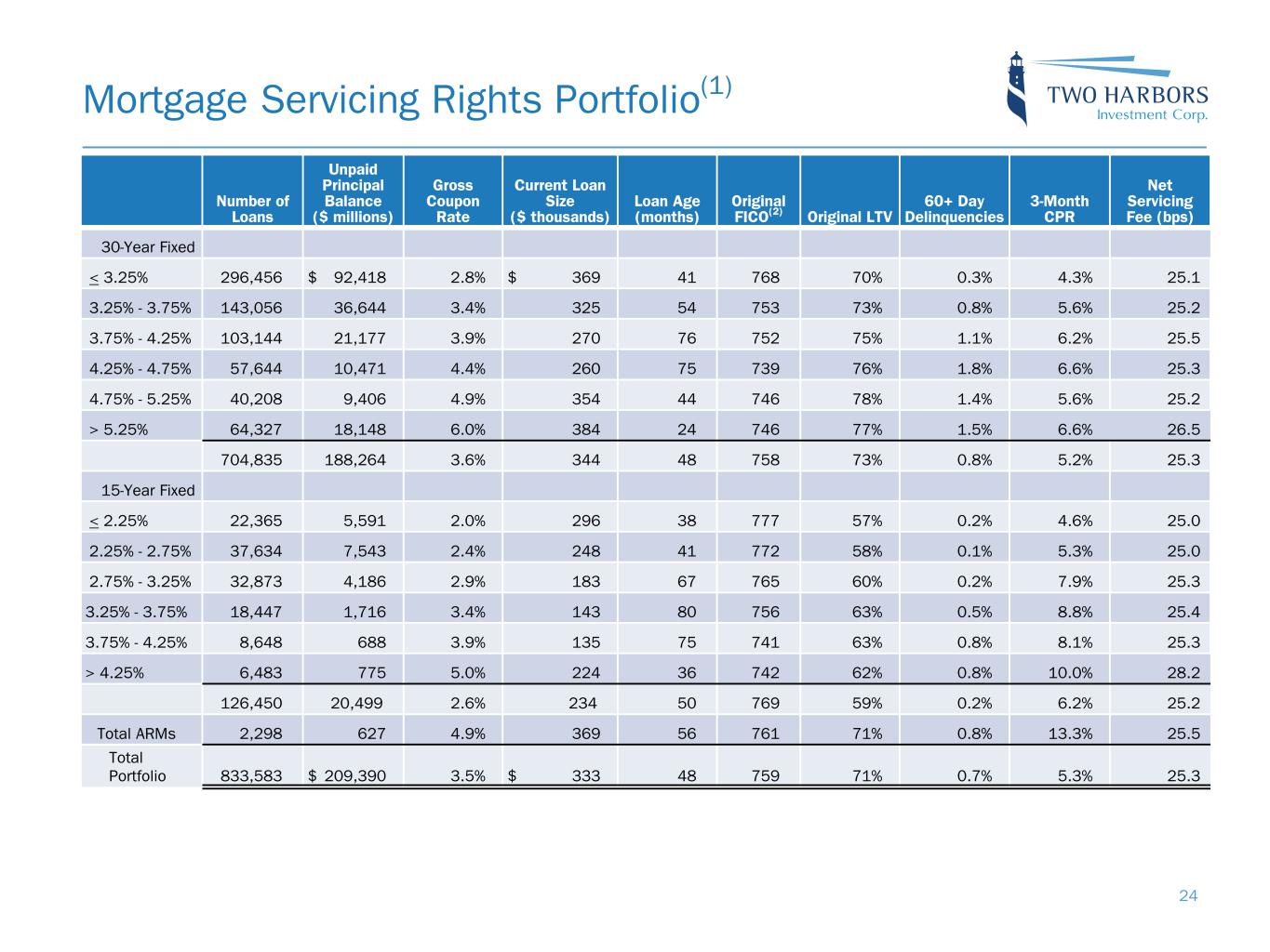 Mortgage Servicing Rights Portfolio(1) Number of Loans Unpaid Principal Balance ($ millions) Gross Coupon Rate Current Loan Size ($ thousands) Loan Age (months) Original FICO(2) Original LTV 60+ Day Delinquencies 3-Month CPR Net Servicing Fee (bps) 30-Year Fixed < 3.25% 296,456 $ 92,418 2.8% $ 369 41 768 70% 0.3% 4.3% 25.1 3.25% - 3.75% 143,056 36,644 3.4% 325 54 753 73% 0.8% 5.6% 25.2 3.75% - 4.25% 103,144 21,177 3.9 % 270 76 752 75 % 1.1 % 6.2 % 25.5 4.25% - 4.75% 57,644 10,471 4.4 % 260 75 739 76 % 1.8 % 6.6 % 25.3 4.75% - 5.25% 40,208 9,406 4.9 % 354 44 746 78 % 1.4 % 5.6 % 25.2 > 5.25% 64,327 18,148 6.0 % 384 24 746 77 % 1.5 % 6.6 % 26.5 704,835 188,264 3.6 % 344 48 758 73 % 0.8 % 5.2 % 25.3 15-Year Fixed < 2.25% 22,365 5,591 2.0 % 296 38 777 57 % 0.2 % 4.6 % 25.0 2.25% - 2.75% 37,634 7,543 2.4 % 248 41 772 58 % 0.1 % 5.3 % 25.0 2.75% - 3.25% 32,873 4,186 2.9 % 183 67 765 60 % 0.2 % 7.9 % 25.3 3.25% - 3.75% 18,447 1,716 3.4 % 143 80 756 63 % 0.5 % 8.8 % 25.4 3.75% - 4.25% 8,648 688 3.9 % 135 75 741 63 % 0.8 % 8.1 % 25.3 > 4.25% 6,483 775 5.0 % 224 36 742 62 % 0.8 % 10.0 % 28.2 126,450 20,499 2.6 % 234 50 769 59 % 0.2 % 6.2 % 25.2 Total ARMs 2,298 627 4.9 % 369 56 761 71 % 0.8 % 13.3 % 25.5 Total Portfolio 833,583 $ 209,390 3.5 % $ 333 48 759 71 % 0.7 % 5.3 % 25.3 24