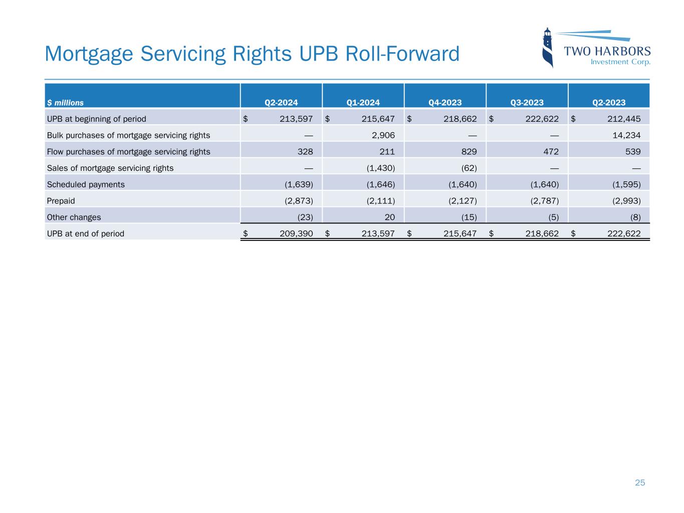 Mortgage Servicing Rights UPB Roll-Forward $ millions Q2-2024 Q1-2024 Q4-2023 Q3-2023 Q2-2023 UPB at beginning of period $ 213,597 $ 215,647 $ 218,662 $ 222,622 $ 212,445 Bulk purchases of mortgage servicing rights — 2,906 — — 14,234 Flow purchases of mortgage servicing rights 328 211 829 472 539 Sales of mortgage servicing rights — (1,430) (62) — — Scheduled payments (1,639) (1,646) (1,640) (1,640) (1,595) Prepaid (2,873) (2,111) (2,127) (2,787) (2,993) Other changes (23) 20 (15) (5) (8) UPB at end of period $ 209,390 $ 213,597 $ 215,647 $ 218,662 $ 222,622 25