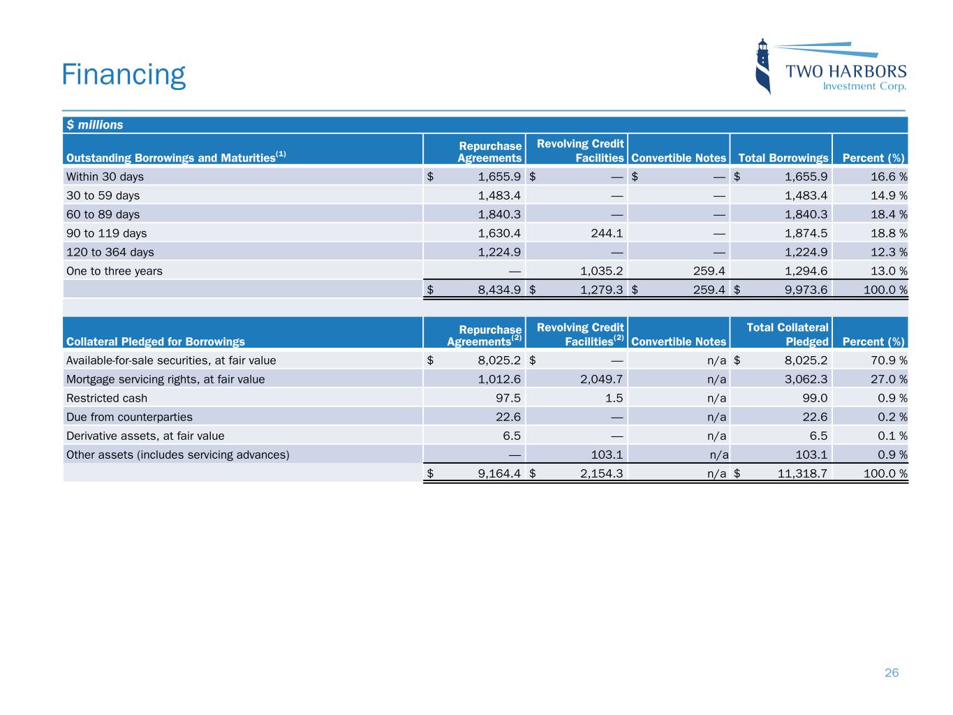 Financing $ millions Outstanding Borrowings and Maturities(1) Repurchase Agreements Revolving Credit Facilities Convertible Notes Total Borrowings Percent (%) Within 30 days $ 1,655.9 $ — $ — $ 1,655.9 16.6 % 30 to 59 days 1,483.4 — — 1,483.4 14.9 % 60 to 89 days 1,840.3 — — 1,840.3 18.4 % 90 to 119 days 1,630.4 244.1 — 1,874.5 18.8 % 120 to 364 days 1,224.9 — — 1,224.9 12.3 % One to three years — 1,035.2 259.4 1,294.6 13.0 % $ 8,434.9 $ 1,279.3 $ 259.4 $ 9,973.6 100.0 % Collateral Pledged for Borrowings Repurchase Agreements(2) Revolving Credit Facilities(2) Convertible Notes Total Collateral Pledged Percent (%) Available-for-sale securities, at fair value $ 8,025.2 $ — n/a $ 8,025.2 70.9 % Mortgage servicing rights, at fair value 1,012.6 2,049.7 n/a 3,062.3 27.0 % Restricted cash 97.5 1.5 n/a 99.0 0.9 % Due from counterparties 22.6 — n/a 22.6 0.2 % Derivative assets, at fair value 6.5 — n/a 6.5 0.1 % Other assets (includes servicing advances) — 103.1 n/a 103.1 0.9 % $ 9,164.4 $ 2,154.3 n/a $ 11,318.7 100.0 % 26