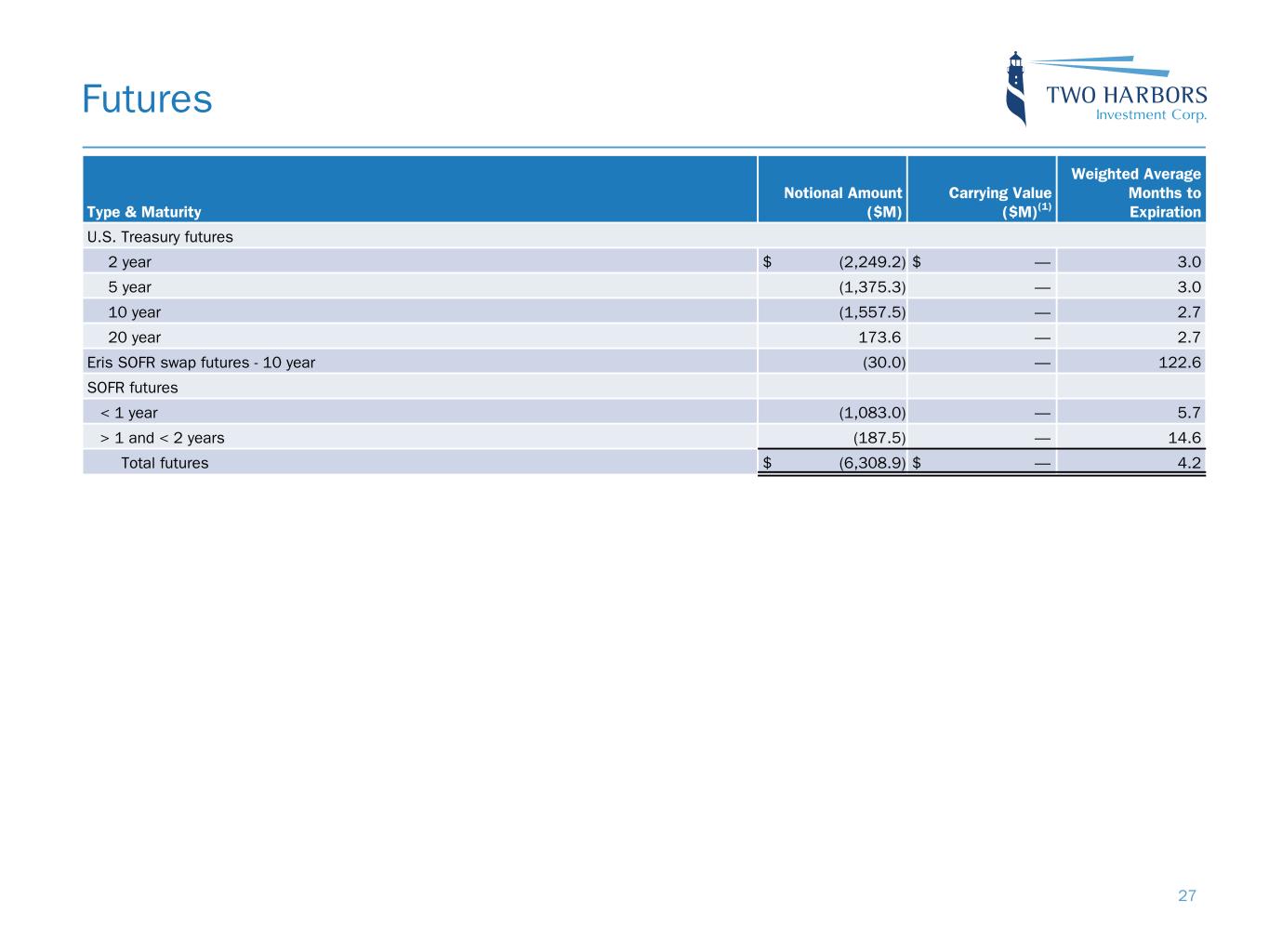 Futures 27 Type & Maturity Notional Amount ($M) Carrying Value ($M)(1) Weighted Average Months to Expiration U.S. Treasury futures 2 year $ (2,249.2) $ — 3.0 5 year (1,375.3) — 3.0 10 year (1,557.5) — 2.7 20 year 173.6 — 2.7 Eris SOFR swap futures - 10 year (30.0) — 122.6 SOFR futures < 1 year (1,083.0) — 5.7 > 1 and < 2 years (187.5) — 14.6 Total futures $ (6,308.9) $ — 4.2