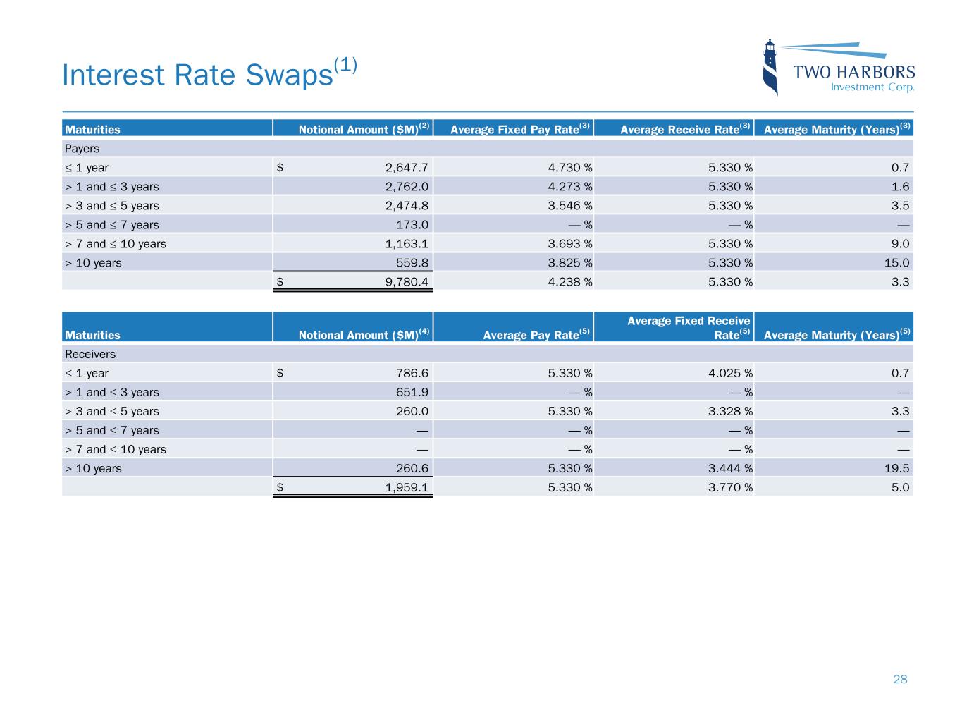 Maturities Notional Amount ($M)(2) Average Fixed Pay Rate(3) Average Receive Rate(3) Average Maturity (Years)(3) Payers ≤ 1 year $ 2,647.7 4.730 % 5.330 % 0.7 > 1 and ≤ 3 years 2,762.0 4.273 % 5.330 % 1.6 > 3 and ≤ 5 years 2,474.8 3.546 % 5.330 % 3.5 > 5 and ≤ 7 years 173.0 — % — % — > 7 and ≤ 10 years 1,163.1 3.693 % 5.330 % 9.0 > 10 years 559.8 3.825 % 5.330 % 15.0 $ 9,780.4 4.238 % 5.330 % 3.3 Maturities Notional Amount ($M)(4) Average Pay Rate(5) Average Fixed Receive Rate(5) Average Maturity (Years)(5) Receivers ≤ 1 year $ 786.6 5.330 % 4.025 % 0.7 > 1 and ≤ 3 years 651.9 — % — % — > 3 and ≤ 5 years 260.0 5.330 % 3.328 % 3.3 > 5 and ≤ 7 years — — % — % — > 7 and ≤ 10 years — — % — % — > 10 years 260.6 5.330 % 3.444 % 19.5 $ 1,959.1 5.330 % 3.770 % 5.0 Interest Rate Swaps(1) 28