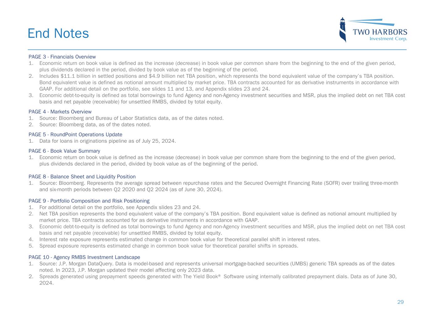 PAGE 3 - Financials Overview 1. Economic return on book value is defined as the increase (decrease) in book value per common share from the beginning to the end of the given period, plus dividends declared in the period, divided by book value as of the beginning of the period. 2. Includes $11.1 billion in settled positions and $4.9 billion net TBA position, which represents the bond equivalent value of the company’s TBA position. Bond equivalent value is defined as notional amount multiplied by market price. TBA contracts accounted for as derivative instruments in accordance with GAAP. For additional detail on the portfolio, see slides 11 and 13, and Appendix slides 23 and 24. 3. Economic debt-to-equity is defined as total borrowings to fund Agency and non-Agency investment securities and MSR, plus the implied debt on net TBA cost basis and net payable (receivable) for unsettled RMBS, divided by total equity. PAGE 4 - Markets Overview 1. Source: Bloomberg and Bureau of Labor Statistics data, as of the dates noted. 2. Source: Bloomberg data, as of the dates noted. PAGE 5 - RoundPoint Operations Update 1. Data for loans in originations pipeline as of July 25, 2024. PAGE 6 - Book Value Summary 1. Economic return on book value is defined as the increase (decrease) in book value per common share from the beginning to the end of the given period, plus dividends declared in the period, divided by book value as of the beginning of the period. PAGE 8 - Balance Sheet and Liquidity Position 1. Source: Bloomberg. Represents the average spread between repurchase rates and the Secured Overnight Financing Rate (SOFR) over trailing three-month and six-month periods between Q2 2020 and Q2 2024 (as of June 30, 2024). PAGE 9 - Portfolio Composition and Risk Positioning 1. For additional detail on the portfolio, see Appendix slides 23 and 24. 2. Net TBA position represents the bond equivalent value of the company’s TBA position. Bond equivalent value is defined as notional amount multiplied by market price. TBA contracts accounted for as derivative instruments in accordance with GAAP. 3. Economic debt-to-equity is defined as total borrowings to fund Agency and non-Agency investment securities and MSR, plus the implied debt on net TBA cost basis and net payable (receivable) for unsettled RMBS, divided by total equity. 4. Interest rate exposure represents estimated change in common book value for theoretical parallel shift in interest rates. 5. Spread exposure represents estimated change in common book value for theoretical parallel shifts in spreads. PAGE 10 - Agency RMBS Investment Landscape 1. Source: J.P. Morgan DataQuery. Data is model-based and represents universal mortgage-backed securities (UMBS) generic TBA spreads as of the dates noted. In 2023, J.P. Morgan updated their model affecting only 2023 data. 2. Spreads generated using prepayment speeds generated with The Yield Book® Software using internally calibrated prepayment dials. Data as of June 30, 2024. End Notes 29