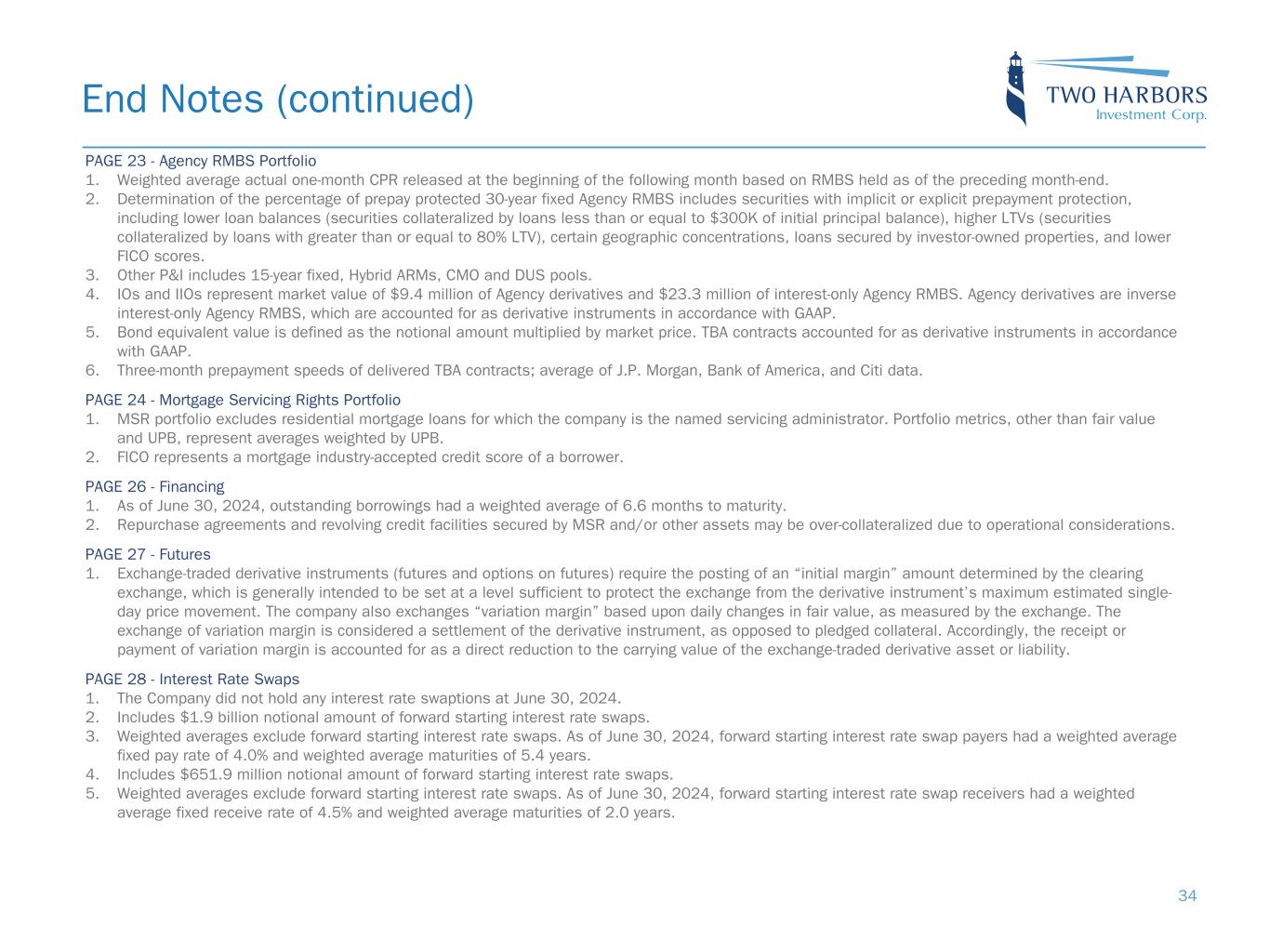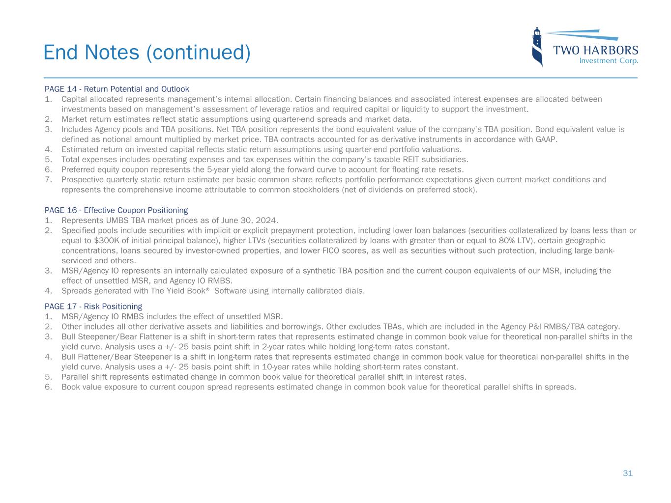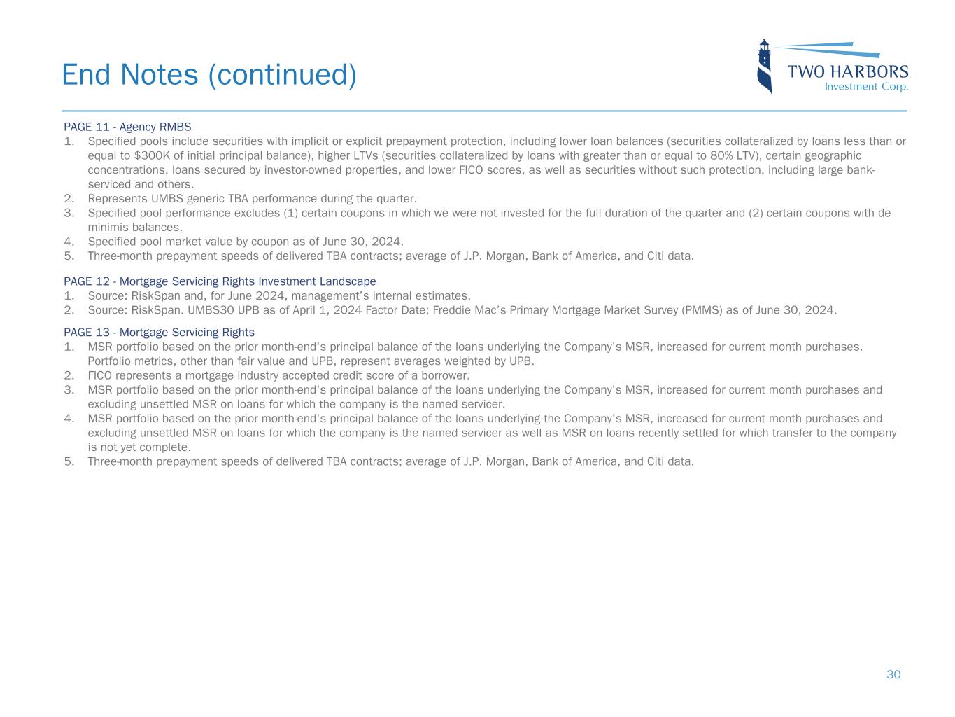 PAGE 11 - Agency RMBS 1. Specified pools include securities with implicit or explicit prepayment protection, including lower loan balances (securities collateralized by loans less than or equal to $300K of initial principal balance), higher LTVs (securities collateralized by loans with greater than or equal to 80% LTV), certain geographic concentrations, loans secured by investor-owned properties, and lower FICO scores, as well as securities without such protection, including large bank- serviced and others. 2. Represents UMBS generic TBA performance during the quarter. 3. Specified pool performance excludes (1) certain coupons in which we were not invested for the full duration of the quarter and (2) certain coupons with de minimis balances. 4. Specified pool market value by coupon as of June 30, 2024. 5. Three-month prepayment speeds of delivered TBA contracts; average of J.P. Morgan, Bank of America, and Citi data. PAGE 12 - Mortgage Servicing Rights Investment Landscape 1. Source: RiskSpan and, for June 2024, management’s internal estimates. 2. Source: RiskSpan. UMBS30 UPB as of April 1, 2024 Factor Date; Freddie Mac’s Primary Mortgage Market Survey (PMMS) as of June 30, 2024. PAGE 13 - Mortgage Servicing Rights 1. MSR portfolio based on the prior month-end's principal balance of the loans underlying the Company's MSR, increased for current month purchases. Portfolio metrics, other than fair value and UPB, represent averages weighted by UPB. 2. FICO represents a mortgage industry accepted credit score of a borrower. 3. MSR portfolio based on the prior month-end's principal balance of the loans underlying the Company's MSR, increased for current month purchases and excluding unsettled MSR on loans for which the company is the named servicer. 4. MSR portfolio based on the prior month-end's principal balance of the loans underlying the Company's MSR, increased for current month purchases and excluding unsettled MSR on loans for which the company is the named servicer as well as MSR on loans recently settled for which transfer to the company is not yet complete. 5. Three-month prepayment speeds of delivered TBA contracts; average of J.P. Morgan, Bank of America, and Citi data. End Notes (continued) 30
