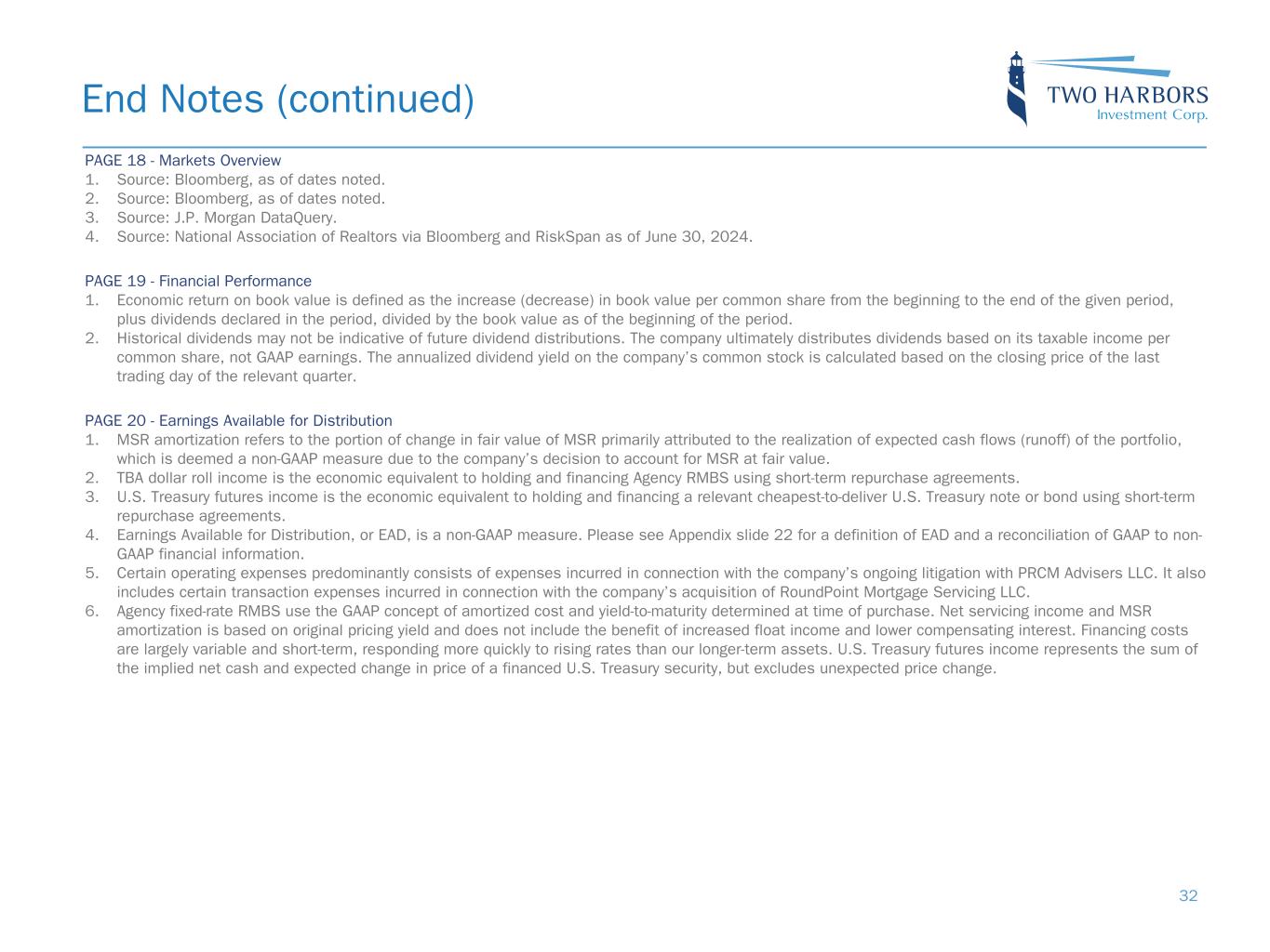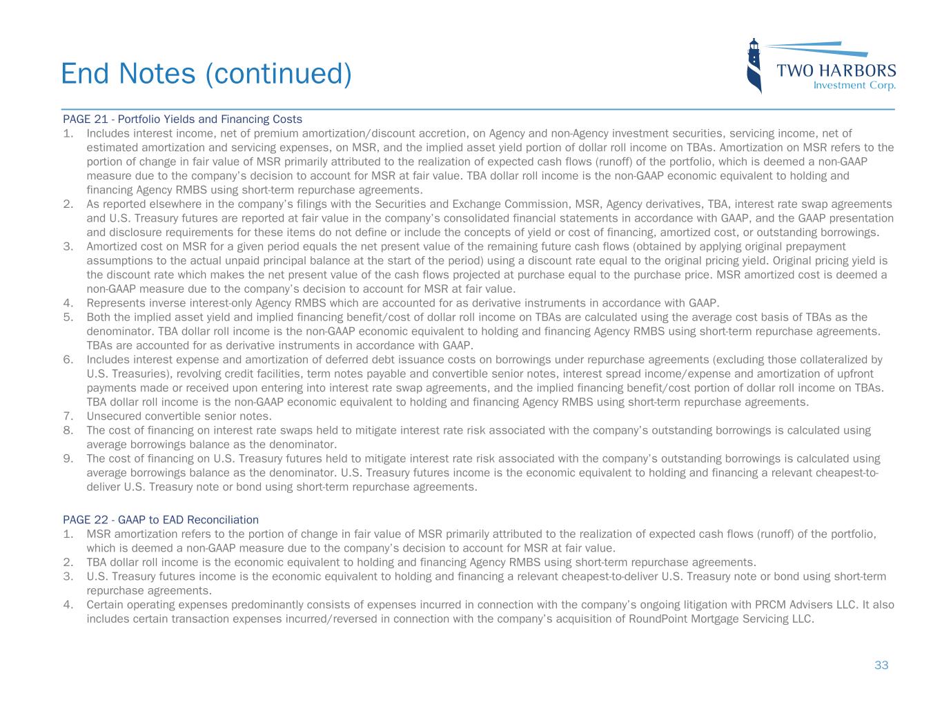 PAGE 18 - Markets Overview 1. Source: Bloomberg, as of dates noted. 2. Source: Bloomberg, as of dates noted. 3. Source: J.P. Morgan DataQuery. 4. Source: National Association of Realtors via Bloomberg and RiskSpan as of June 30, 2024. PAGE 19 - Financial Performance 1. Economic return on book value is defined as the increase (decrease) in book value per common share from the beginning to the end of the given period, plus dividends declared in the period, divided by the book value as of the beginning of the period. 2. Historical dividends may not be indicative of future dividend distributions. The company ultimately distributes dividends based on its taxable income per common share, not GAAP earnings. The annualized dividend yield on the company’s common stock is calculated based on the closing price of the last trading day of the relevant quarter. PAGE 20 - Earnings Available for Distribution 1. MSR amortization refers to the portion of change in fair value of MSR primarily attributed to the realization of expected cash flows (runoff) of the portfolio, which is deemed a non-GAAP measure due to the company’s decision to account for MSR at fair value. 2. TBA dollar roll income is the economic equivalent to holding and financing Agency RMBS using short-term repurchase agreements. 3. U.S. Treasury futures income is the economic equivalent to holding and financing a relevant cheapest-to-deliver U.S. Treasury note or bond using short-term repurchase agreements. 4. Earnings Available for Distribution, or EAD, is a non-GAAP measure. Please see Appendix slide 22 for a definition of EAD and a reconciliation of GAAP to non- GAAP financial information. 5. Certain operating expenses predominantly consists of expenses incurred in connection with the company’s ongoing litigation with PRCM Advisers LLC. It also includes certain transaction expenses incurred in connection with the company’s acquisition of RoundPoint Mortgage Servicing LLC. 6. Agency fixed-rate RMBS use the GAAP concept of amortized cost and yield-to-maturity determined at time of purchase. Net servicing income and MSR amortization is based on original pricing yield and does not include the benefit of increased float income and lower compensating interest. Financing costs are largely variable and short-term, responding more quickly to rising rates than our longer-term assets. U.S. Treasury futures income represents the sum of the implied net cash and expected change in price of a financed U.S. Treasury security, but excludes unexpected price change. End Notes (continued) 32