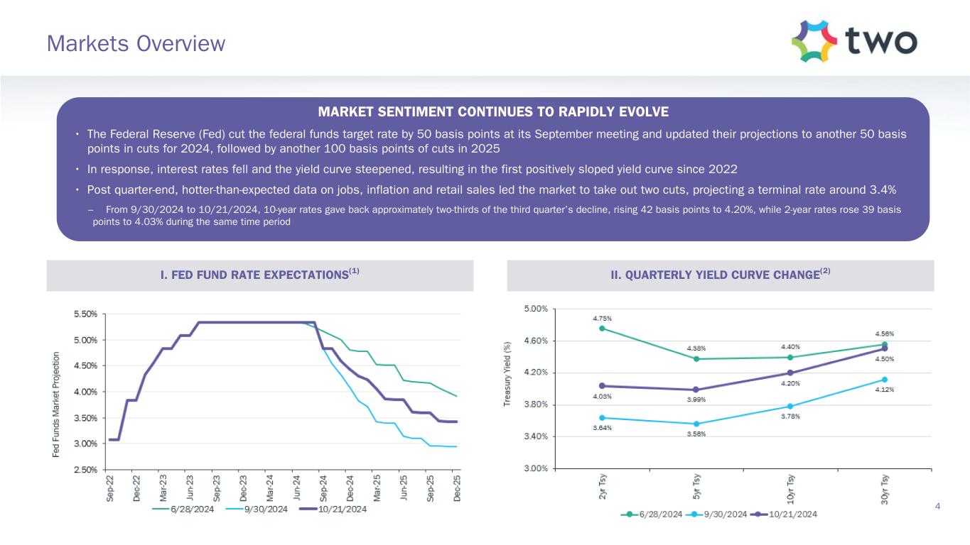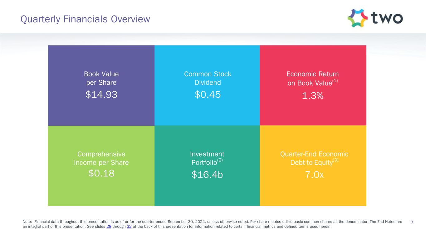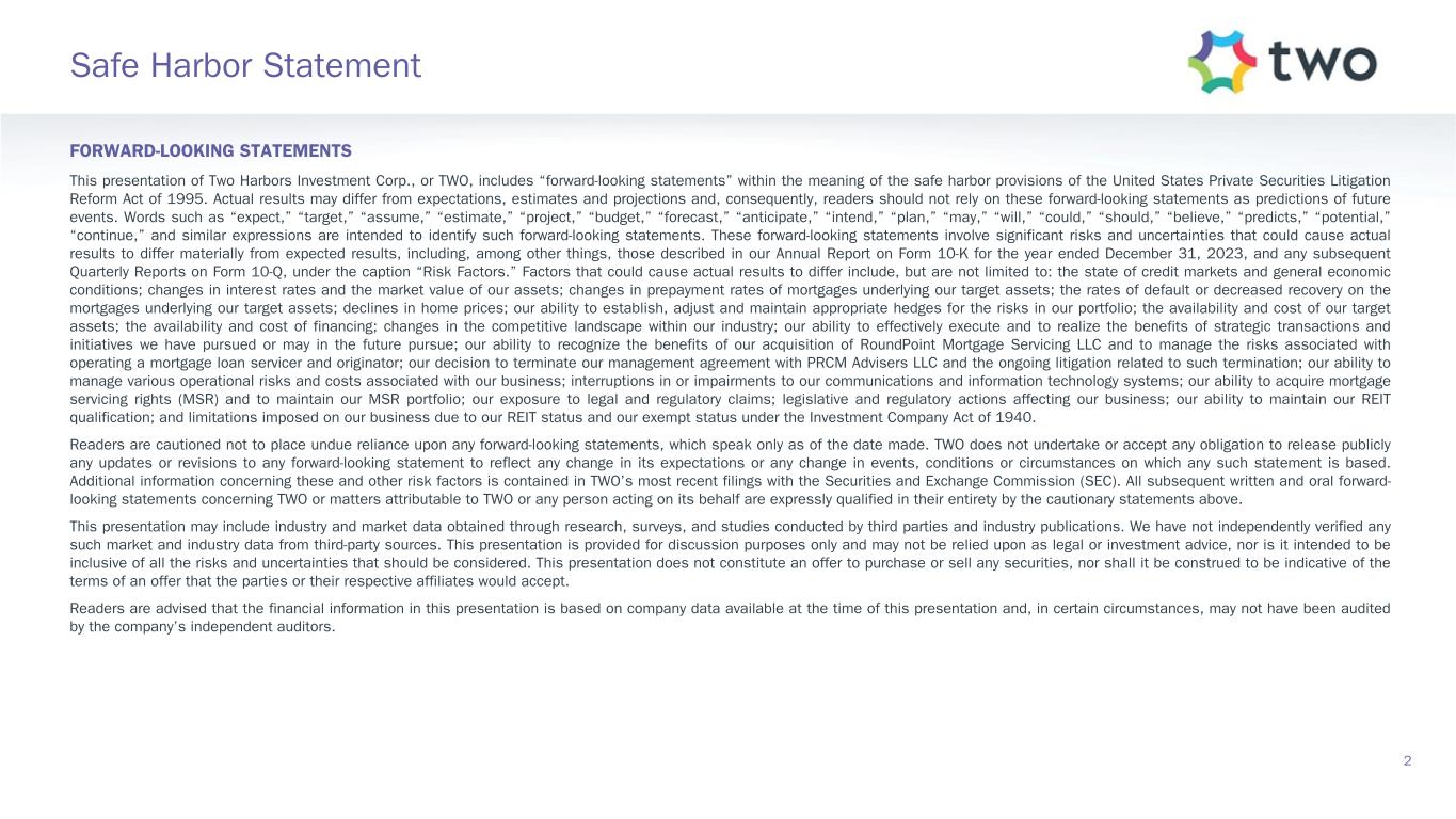 Safe Harbor Statement 2 FORWARD-LOOKING STATEMENTS This presentation of Two Harbors Investment Corp., or TWO, includes “forward-looking statements” within the meaning of the safe harbor provisions of the United States Private Securities Litigation Reform Act of 1995. Actual results may differ from expectations, estimates and projections and, consequently, readers should not rely on these forward-looking statements as predictions of future events. Words such as “expect,” “target,” “assume,” “estimate,” “project,” “budget,” “forecast,” “anticipate,” “intend,” “plan,” “may,” “will,” “could,” “should,” “believe,” “predicts,” “potential,” “continue,” and similar expressions are intended to identify such forward-looking statements. These forward-looking statements involve significant risks and uncertainties that could cause actual results to differ materially from expected results, including, among other things, those described in our Annual Report on Form 10-K for the year ended December 31, 2023, and any subsequent Quarterly Reports on Form 10-Q, under the caption “Risk Factors.” Factors that could cause actual results to differ include, but are not limited to: the state of credit markets and general economic conditions; changes in interest rates and the market value of our assets; changes in prepayment rates of mortgages underlying our target assets; the rates of default or decreased recovery on the mortgages underlying our target assets; declines in home prices; our ability to establish, adjust and maintain appropriate hedges for the risks in our portfolio; the availability and cost of our target assets; the availability and cost of financing; changes in the competitive landscape within our industry; our ability to effectively execute and to realize the benefits of strategic transactions and initiatives we have pursued or may in the future pursue; our ability to recognize the benefits of our acquisition of RoundPoint Mortgage Servicing LLC and to manage the risks associated with operating a mortgage loan servicer and originator; our decision to terminate our management agreement with PRCM Advisers LLC and the ongoing litigation related to such termination; our ability to manage various operational risks and costs associated with our business; interruptions in or impairments to our communications and information technology systems; our ability to acquire mortgage servicing rights (MSR) and to maintain our MSR portfolio; our exposure to legal and regulatory claims; legislative and regulatory actions affecting our business; our ability to maintain our REIT qualification; and limitations imposed on our business due to our REIT status and our exempt status under the Investment Company Act of 1940. Readers are cautioned not to place undue reliance upon any forward-looking statements, which speak only as of the date made. TWO does not undertake or accept any obligation to release publicly any updates or revisions to any forward-looking statement to reflect any change in its expectations or any change in events, conditions or circumstances on which any such statement is based. Additional information concerning these and other risk factors is contained in TWO’s most recent filings with the Securities and Exchange Commission (SEC). All subsequent written and oral forward- looking statements concerning TWO or matters attributable to TWO or any person acting on its behalf are expressly qualified in their entirety by the cautionary statements above. This presentation may include industry and market data obtained through research, surveys, and studies conducted by third parties and industry publications. We have not independently verified any such market and industry data from third-party sources. This presentation is provided for discussion purposes only and may not be relied upon as legal or investment advice, nor is it intended to be inclusive of all the risks and uncertainties that should be considered. This presentation does not constitute an offer to purchase or sell any securities, nor shall it be construed to be indicative of the terms of an offer that the parties or their respective affiliates would accept. Readers are advised that the financial information in this presentation is based on company data available at the time of this presentation and, in certain circumstances, may not have been audited by the company’s independent auditors.