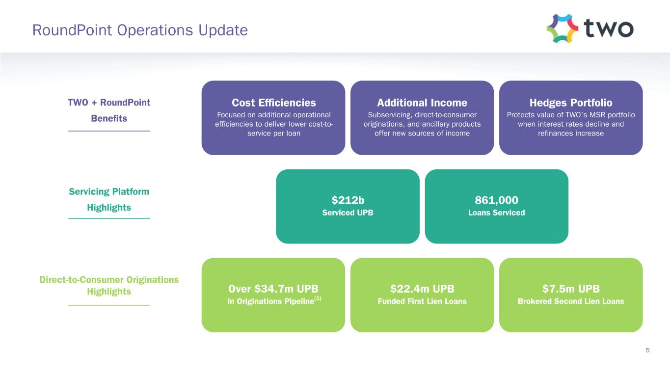 Over $34.7m UPB in Originations Pipeline(1) $212b Serviced UPB 861,000 Loans Serviced Hedges Portfolio Protects value of TWO’s MSR portfolio when interest rates decline and refinances increase Cost Efficiencies Focused on additional operational efficiencies to deliver lower cost-to- service per loan Additional Income Subservicing, direct-to-consumer originations, and ancillary products offer new sources of income RoundPoint Operations Update 5 $22.4m UPB Funded First Lien Loans Direct-to-Consumer Originations Highlights Servicing Platform Highlights TWO + RoundPoint Benefits $7.5m UPB Brokered Second Lien Loans