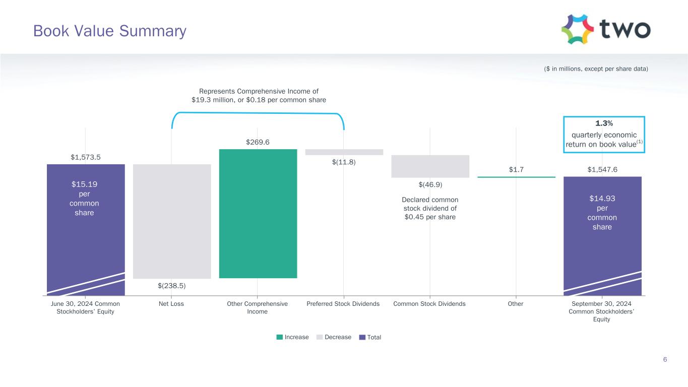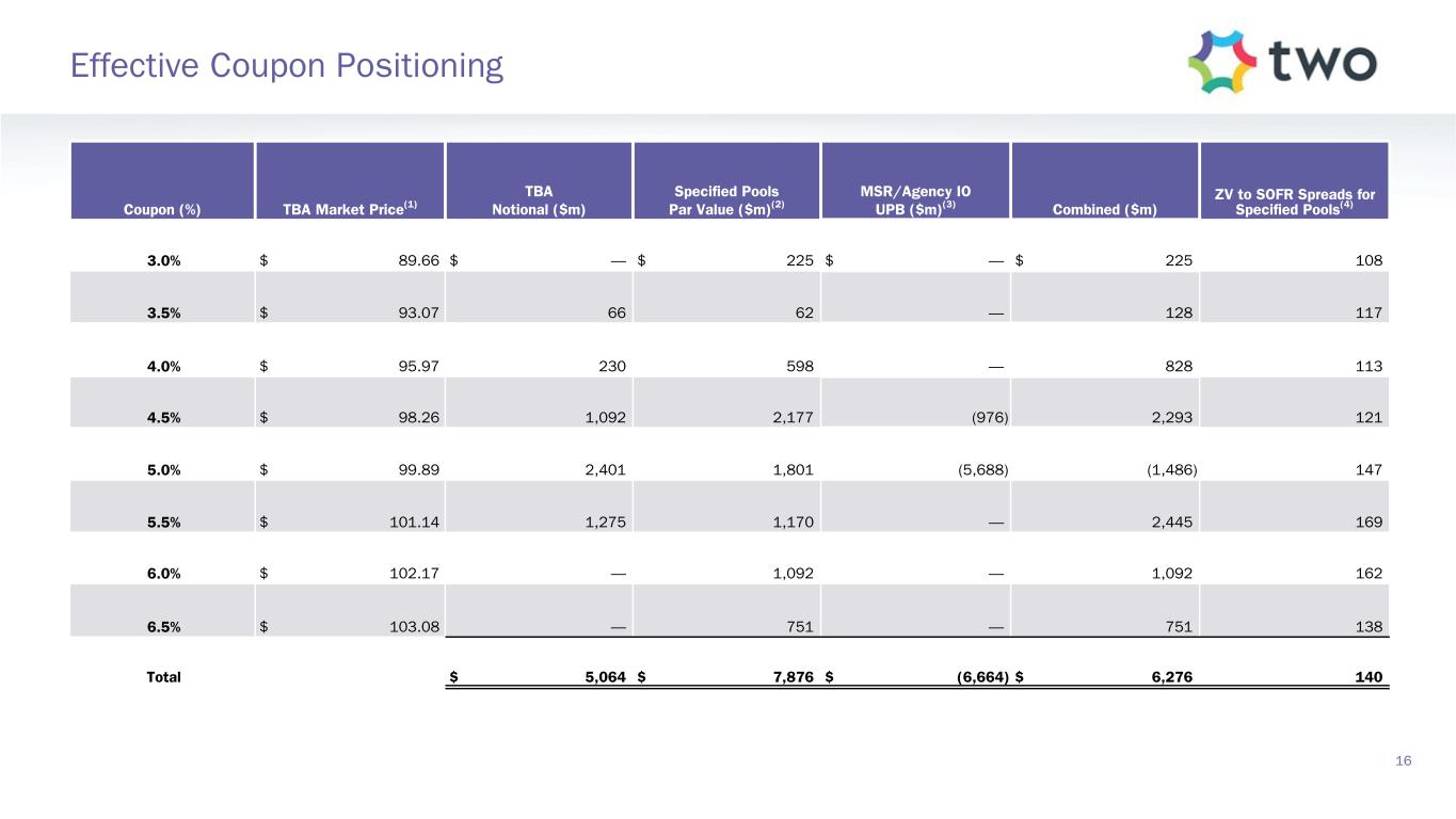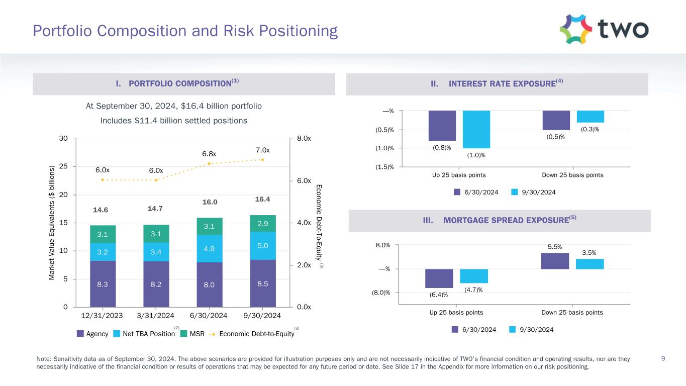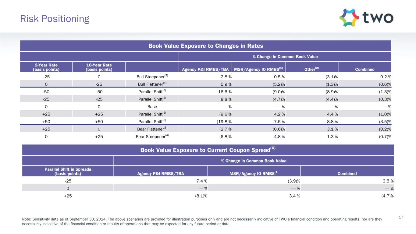 Note: Sensitivity data as of September 30, 2024. The above scenarios are provided for illustration purposes only and are not necessarily indicative of TWO’s financial condition and operating results, nor are they necessarily indicative of the financial condition or results of operations that may be expected for any future period or date. Book Value Exposure to Changes in Rates % Change in Common Book Value 2-Year Rate (basis points) 10-Year Rate (basis points) Agency P&I RMBS/TBA MSR/Agency IO RMBS(1) Other(2) Combined -25 0 Bull Steepener(3) 2.8 % 0.5 % (3.1) % 0.2 % 0 -25 Bull Flattener(4) 5.9 % (5.2) % (1.3) % (0.6) % -50 -50 Parallel Shift(5) 16.6 % (9.0) % (8.9) % (1.3) % -25 -25 Parallel Shift(5) 8.8 % (4.7) % (4.4) % (0.3) % 0 0 Base — % — % — % — % +25 +25 Parallel Shift(5) (9.6) % 4.2 % 4.4 % (1.0) % +50 +50 Parallel Shift(5) (19.8) % 7.5 % 8.8 % (3.5) % +25 0 Bear Flattener(3) (2.7) % (0.6) % 3.1 % (0.2) % 0 +25 Bear Steepener(4) (6.8) % 4.8 % 1.3 % (0.7) % Book Value Exposure to Current Coupon Spread(6) % Change in Common Book Value Parallel Shift in Spreads (basis points) Agency P&I RMBS/TBA MSR/Agency IO RMBS(1) Combined -25 7.4 % (3.9) % 3.5 % 0 — % — % — % +25 (8.1) % 3.4 % (4.7) % 17 Risk Positioning