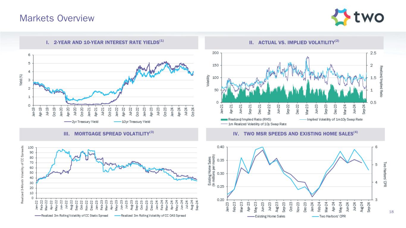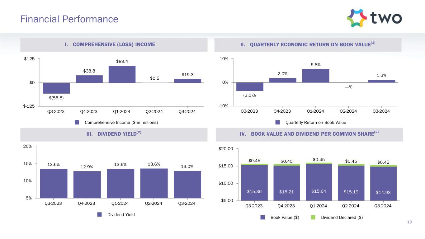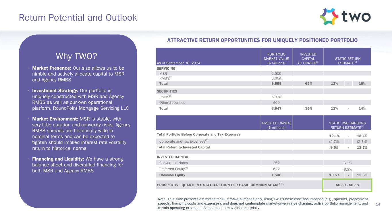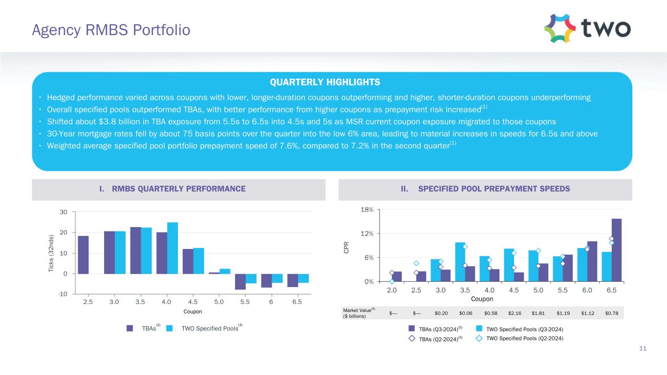 Note: Sensitivity data as of September 30, 2024. The above scenarios are provided for illustration purposes only and are not necessarily indicative of TWO’s financial condition and operating results, nor are they necessarily indicative of the financial condition or results of operations that may be expected for any future period or date. Book Value Exposure to Changes in Rates % Change in Common Book Value 2-Year Rate (basis points) 10-Year Rate (basis points) Agency P&I RMBS/TBA MSR/Agency IO RMBS(1) Other(2) Combined -25 0 Bull Steepener(3) 2.8 % 0.5 % (3.1) % 0.2 % 0 -25 Bull Flattener(4) 5.9 % (5.2) % (1.3) % (0.6) % -50 -50 Parallel Shift(5) 16.6 % (9.0) % (8.9) % (1.3) % -25 -25 Parallel Shift(5) 8.8 % (4.7) % (4.4) % (0.3) % 0 0 Base — % — % — % — % +25 +25 Parallel Shift(5) (9.6) % 4.2 % 4.4 % (1.0) % +50 +50 Parallel Shift(5) (19.8) % 7.5 % 8.8 % (3.5) % +25 0 Bear Flattener(3) (2.7) % (0.6) % 3.1 % (0.2) % 0 +25 Bear Steepener(4) (6.8) % 4.8 % 1.3 % (0.7) % Book Value Exposure to Current Coupon Spread(6) % Change in Common Book Value Parallel Shift in Spreads (basis points) Agency P&I RMBS/TBA MSR/Agency IO RMBS(1) Combined -25 7.4 % (3.9) % 3.5 % 0 — % — % — % +25 (8.1) % 3.4 % (4.7) % 17 Risk Positioning