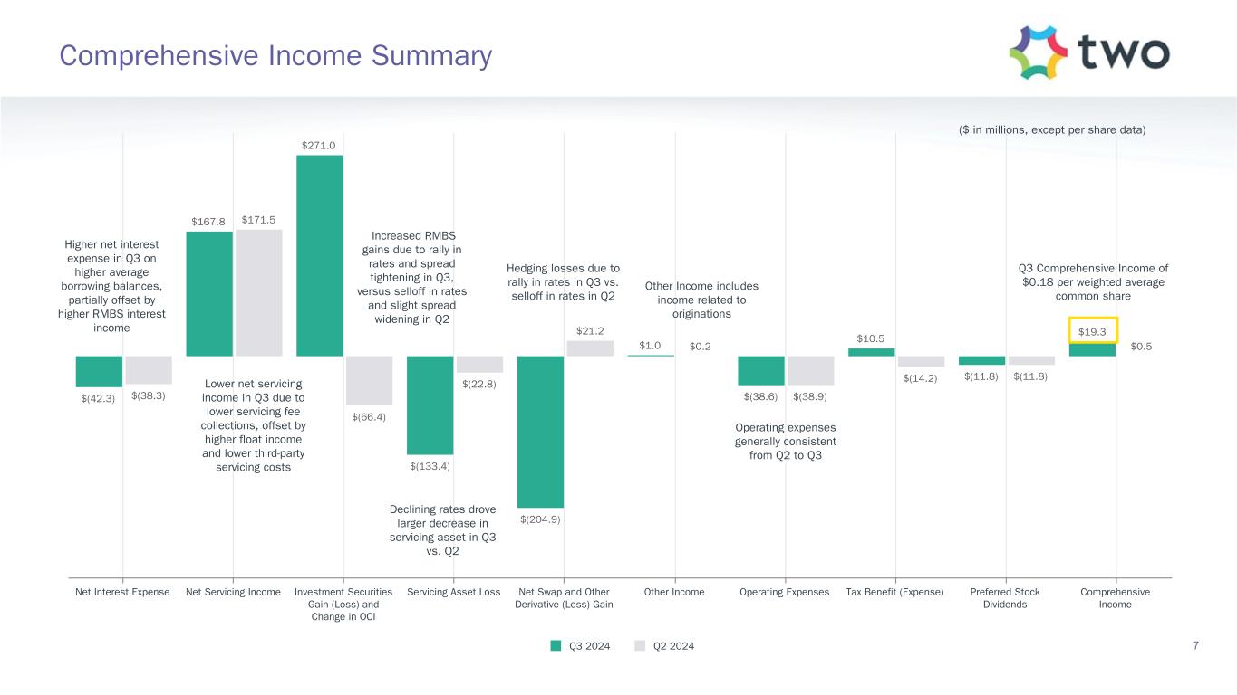 $1,573.5 $(238.5) $269.6 $(11.8) $(46.9) $1.7 $1,547.6 June 30, 2024 Common Stockholders’ Equity Net Loss Other Comprehensive Income Preferred Stock Dividends Common Stock Dividends Other September 30, 2024 Common Stockholders’ Equity ($ in millions, except per share data) $15.19 per common share $14.93 per common share Represents Comprehensive Income of $19.3 million, or $0.18 per common share Declared common stock dividend of $0.45 per share Increase Decrease Total Book Value Summary 6 1.3% quarterly economic return on book value(1)