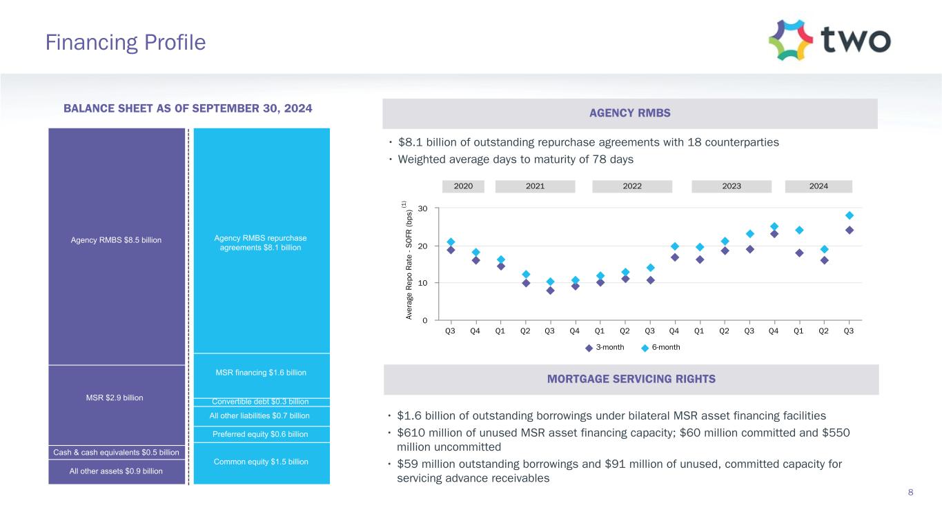 $(42.3) $167.8 $271.0 $(133.4) $(204.9) $1.0 $(38.6) $10.5 $(11.8) $19.3 $(38.3) $171.5 $(66.4) $(22.8) $21.2 $0.2 $(38.9) $(14.2) $(11.8) $0.5 Q3 2024 Q2 2024 Net Interest Expense Net Servicing Income Investment Securities Gain (Loss) and Change in OCI Servicing Asset Loss Net Swap and Other Derivative (Loss) Gain Other Income Operating Expenses Tax Benefit (Expense) Preferred Stock Dividends Comprehensive Income ($ in millions, except per share data) Q3 Comprehensive Income of $0.18 per weighted average common share Lower net servicing income in Q3 due to lower servicing fee collections, offset by higher float income and lower third-party servicing costs Higher net interest expense in Q3 on higher average borrowing balances, partially offset by higher RMBS interest income Increased RMBS gains due to rally in rates and spread tightening in Q3, versus selloff in rates and slight spread widening in Q2 Declining rates drove larger decrease in servicing asset in Q3 vs. Q2 Hedging losses due to rally in rates in Q3 vs. selloff in rates in Q2 Operating expenses generally consistent from Q2 to Q3 Comprehensive Income Summary 7 Other Income includes income related to originations