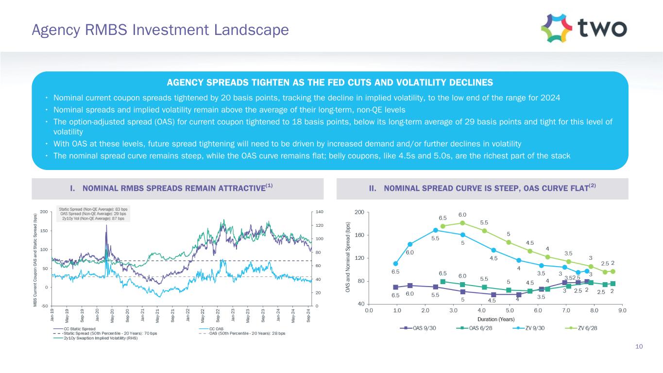 At September 30, 2024, $16.4 billion portfolio Includes $11.4 billion settled positions M ar ke t Va lu e Eq ui va le nt s ($ b ill io ns ) Econom ic D ebt-To-Equity 8.3 8.2 8.0 8.5 3.2 3.4 4.9 5.0 3.1 3.1 3.1 2.9 6.0x 6.0x 6.8x 7.0x Agency Net TBA Position MSR Economic Debt-to-Equity 12/31/2023 3/31/2024 6/30/2024 9/30/2024 0 5 10 15 20 25 30 0.0x 2.0x 4.0x 6.0x 8.0x (3) (3 ) (2) 16.416.0 14.6 14.7 Note: Sensitivity data as of September 30, 2024. The above scenarios are provided for illustration purposes only and are not necessarily indicative of TWO’s financial condition and operating results, nor are they necessarily indicative of the financial condition or results of operations that may be expected for any future period or date. See Slide 17 in the Appendix for more information on our risk positioning. (0.8)% (0.5)% (1.0)% (0.3)% 6/30/2024 9/30/2024 Up 25 basis points Down 25 basis points (1.5)% (1.0)% (0.5)% —% (6.4)% 5.5% (4.7)% 3.5% 6/30/2024 9/30/2024 Up 25 basis points Down 25 basis points (8.0)% —% 8.0% 9 Portfolio Composition and Risk Positioning I. PORTFOLIO COMPOSITION(1) II. INTEREST RATE EXPOSURE(4) III. MORTGAGE SPREAD EXPOSURE(5)