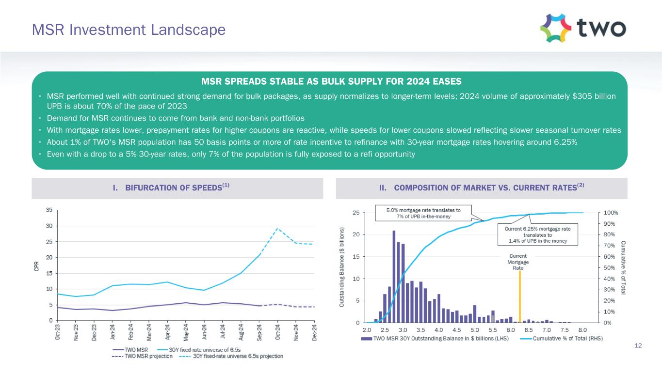 Coupon Ti ck s (3 2 nd s) TBAs TWO Specified Pools 2.5 3.0 3.5 4.0 4.5 5.0 5.5 6 6.5 -10 0 10 20 30 TWO Specified Pools (Q3-2024)TBAs (Q3-2024)(5) TBAs (Q2-2024)(5) TWO Specified Pools (Q2-2024) Market Value(4) ($ billions) $— $— $0.20 $0.06 $0.58 $2.16 $1.81 $1.19 $1.12 $0.78 11 Agency RMBS Portfolio I. RMBS QUARTERLY PERFORMANCE II. SPECIFIED POOL PREPAYMENT SPEEDS (2) (3) QUARTERLY HIGHLIGHTS • Hedged performance varied across coupons with lower, longer-duration coupons outperforming and higher, shorter-duration coupons underperforming • Overall specified pools outperformed TBAs, with better performance from higher coupons as prepayment risk increased(1) • Shifted about $3.8 billion in TBA exposure from 5.5s to 6.5s into 4.5s and 5s as MSR current coupon exposure migrated to those coupons • 30-Year mortgage rates fell by about 75 basis points over the quarter into the low 6% area, leading to material increases in speeds for 6.5s and above • Weighted average specified pool portfolio prepayment speed of 7.6%, compared to 7.2% in the second quarter(1)