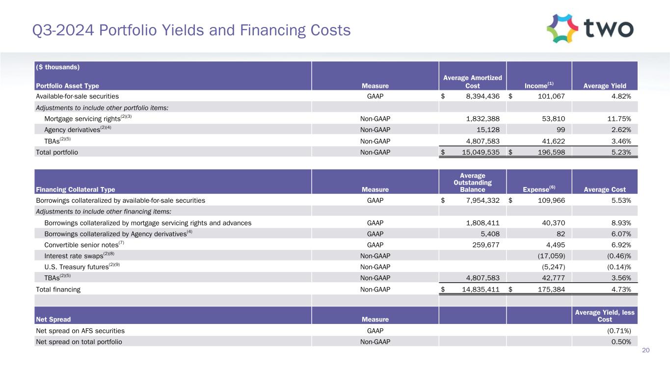 ($ thousands) Portfolio Asset Type Measure Average Amortized Cost Income(1) Average Yield Available-for-sale securities GAAP $ 8,394,436 $ 101,067 4.82% Adjustments to include other portfolio items: Mortgage servicing rights(2)(3) Non-GAAP 1,832,388 53,810 11.75% Agency derivatives(2)(4) Non-GAAP 15,128 99 2.62 % TBAs(2)(5) Non-GAAP 4,807,583 41,622 3.46 % Total portfolio Non-GAAP $ 15,049,535 $ 196,598 5.23% Financing Collateral Type Measure Average Outstanding Balance Expense(6) Average Cost Borrowings collateralized by available-for-sale securities GAAP $ 7,954,332 $ 109,966 5.53% Adjustments to include other financing items: Borrowings collateralized by mortgage servicing rights and advances GAAP 1,808,411 40,370 8.93 % Borrowings collateralized by Agency derivatives(4) GAAP 5,408 82 6.07 % Convertible senior notes(7) GAAP 259,677 4,495 6.92 % Interest rate swaps(2)(8) Non-GAAP (17,059) (0.46) % U.S. Treasury futures(2)(9) Non-GAAP (5,247) (0.14) % TBAs(2)(5) Non-GAAP 4,807,583 42,777 3.56 % Total financing Non-GAAP $ 14,835,411 $ 175,384 4.73 % Net Spread Measure Average Yield, less Cost Net spread on AFS securities GAAP (0.71%) Net spread on total portfolio Non-GAAP 0.50% 20 Q3-2024 Portfolio Yields and Financing Costs