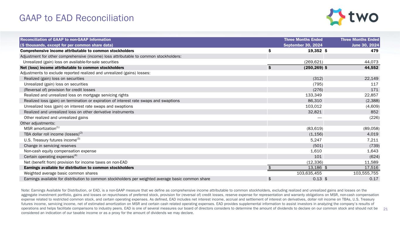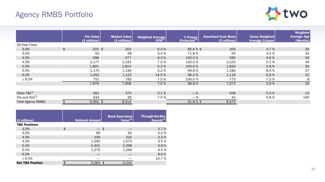 Reconciliation of GAAP to non-GAAP Information Three Months Ended Three Months Ended ($ thousands, except for per common share data) September 30, 2024 June 30, 2024 Comprehensive income attributable to common stockholders $ 19,352 $ 479 Adjustment for other comprehensive (income) loss attributable to common stockholders: Unrealized (gain) loss on available-for-sale securities (269,621) 44,073 Net (loss) income attributable to common stockholders $ (250,269) $ 44,552 Adjustments to exclude reported realized and unrealized (gains) losses: Realized (gain) loss on securities (312) 22,149 Unrealized (gain) loss on securities (795) 117 (Reversal of) provision for credit losses (276) 171 Realized and unrealized loss on mortgage servicing rights 133,349 22,857 Realized loss (gain) on termination or expiration of interest rate swaps and swaptions 86,310 (2,388) Unrealized loss (gain) on interest rate swaps and swaptions 103,012 (4,609) Realized and unrealized loss on other derivative instruments 32,821 852 Other realized and unrealized gains — (226) Other adjustments: MSR amortization(1) (83,619) (89,058) TBA dollar roll income (losses)(2) (1,156) 4,019 U.S. Treasury futures income(3) 5,247 7,211 Change in servicing reserves (501) (739) Non-cash equity compensation expense 1,610 1,643 Certain operating expenses(4) 101 (624) Net (benefit from) provision for income taxes on non-EAD (12,336) 11,589 Earnings available for distribution to common stockholders $ 13,186 $ 17,516 Weighted average basic common shares 103,635,455 103,555,755 Earnings available for distribution to common stockholders per weighted average basic common share $ 0.13 $ 0.17 Note: Earnings Available for Distribution, or EAD, is a non-GAAP measure that we define as comprehensive income attributable to common stockholders, excluding realized and unrealized gains and losses on the aggregate investment portfolio, gains and losses on repurchases of preferred stock, provision for (reversal of) credit losses, reserve expense for representation and warranty obligations on MSR, non-cash compensation expense related to restricted common stock, and certain operating expenses. As defined, EAD includes net interest income, accrual and settlement of interest on derivatives, dollar roll income on TBAs, U.S. Treasury futures income, servicing income, net of estimated amortization on MSR and certain cash related operating expenses. EAD provides supplemental information to assist investors in analyzing the company’s results of operations and helps facilitate comparisons to industry peers. EAD is one of several measures our board of directors considers to determine the amount of dividends to declare on our common stock and should not be considered an indication of our taxable income or as a proxy for the amount of dividends we may declare. 21 GAAP to EAD Reconciliation